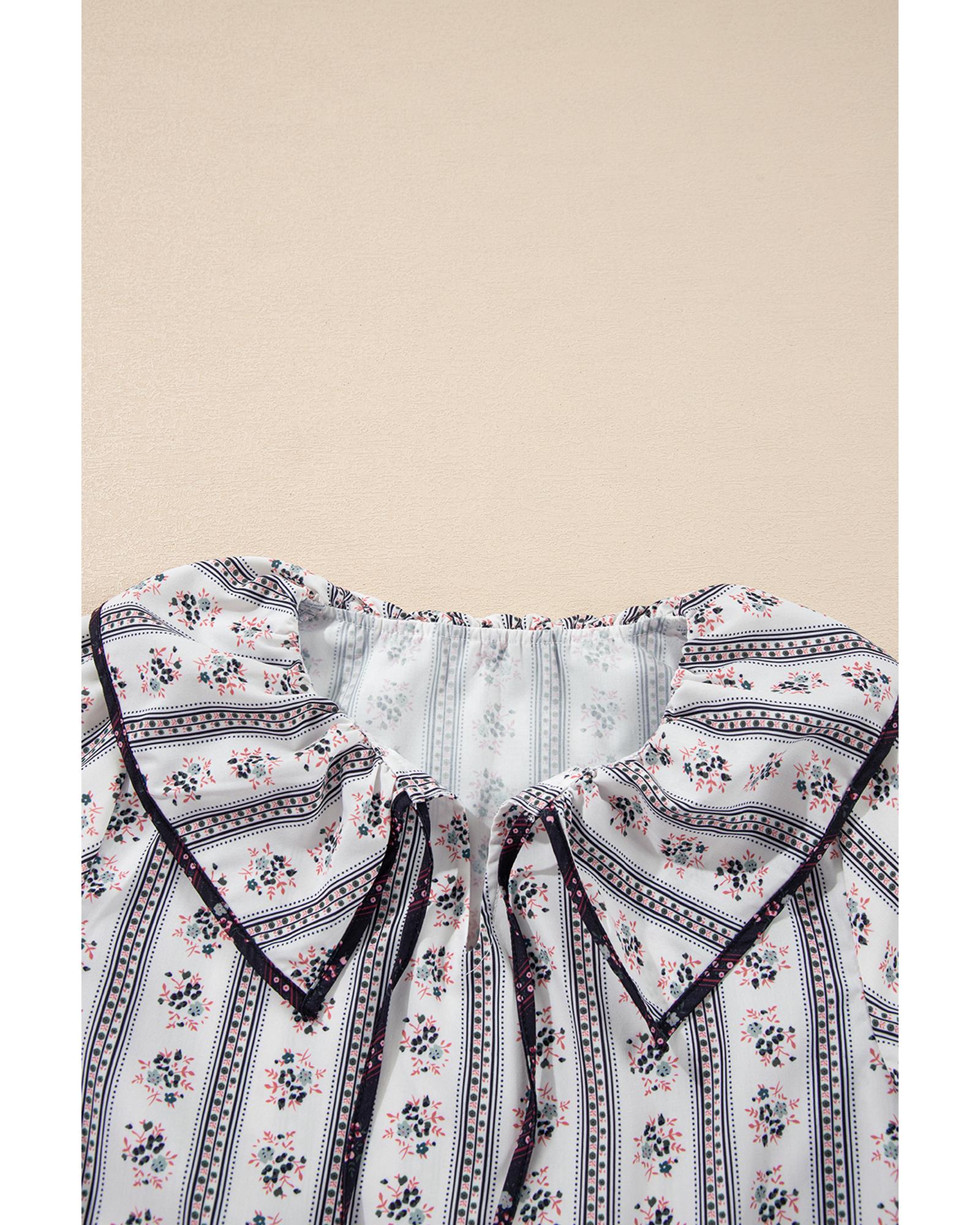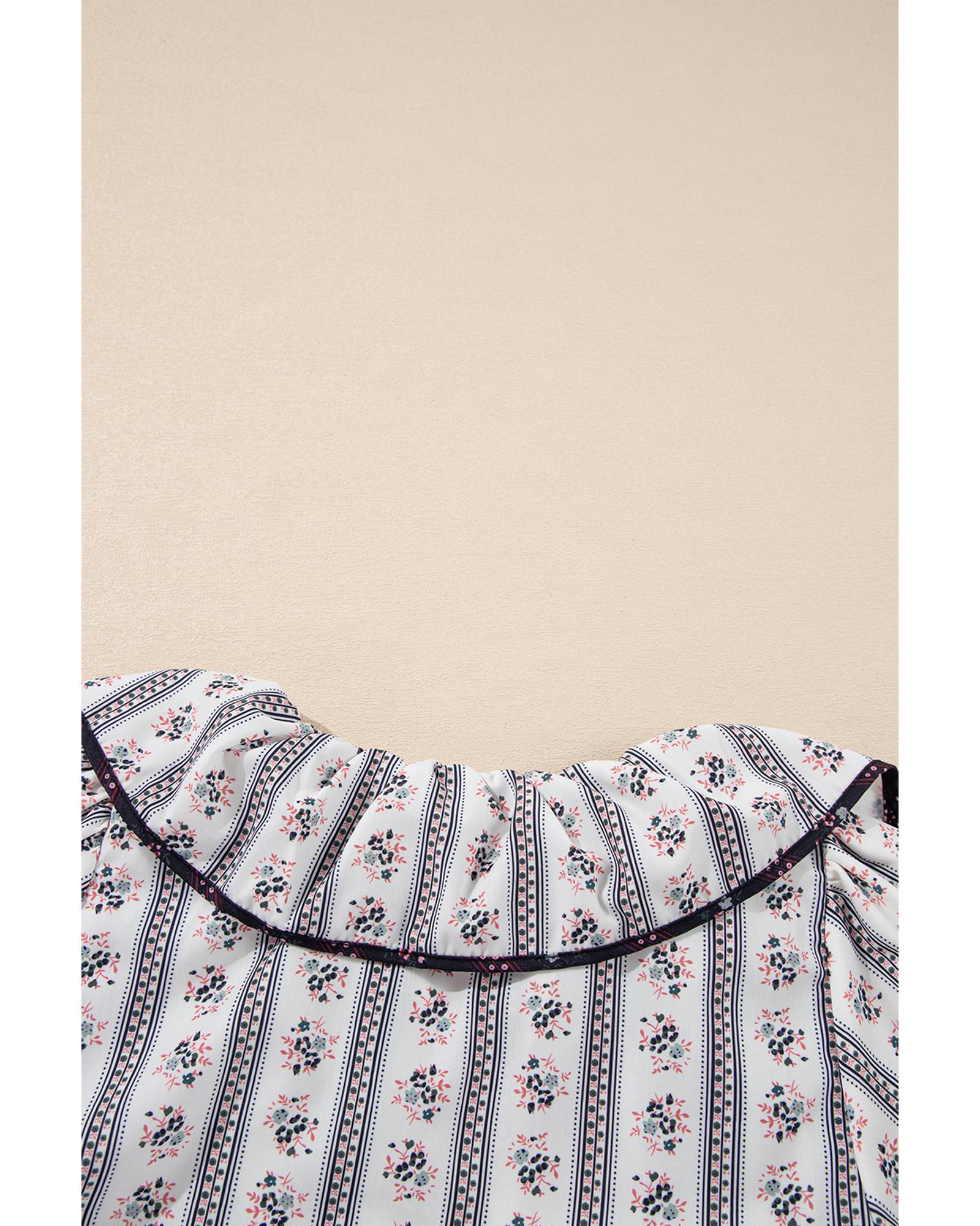 White Floral Ruffled Collar Short Puff Sleeve Printed Blouse – XL