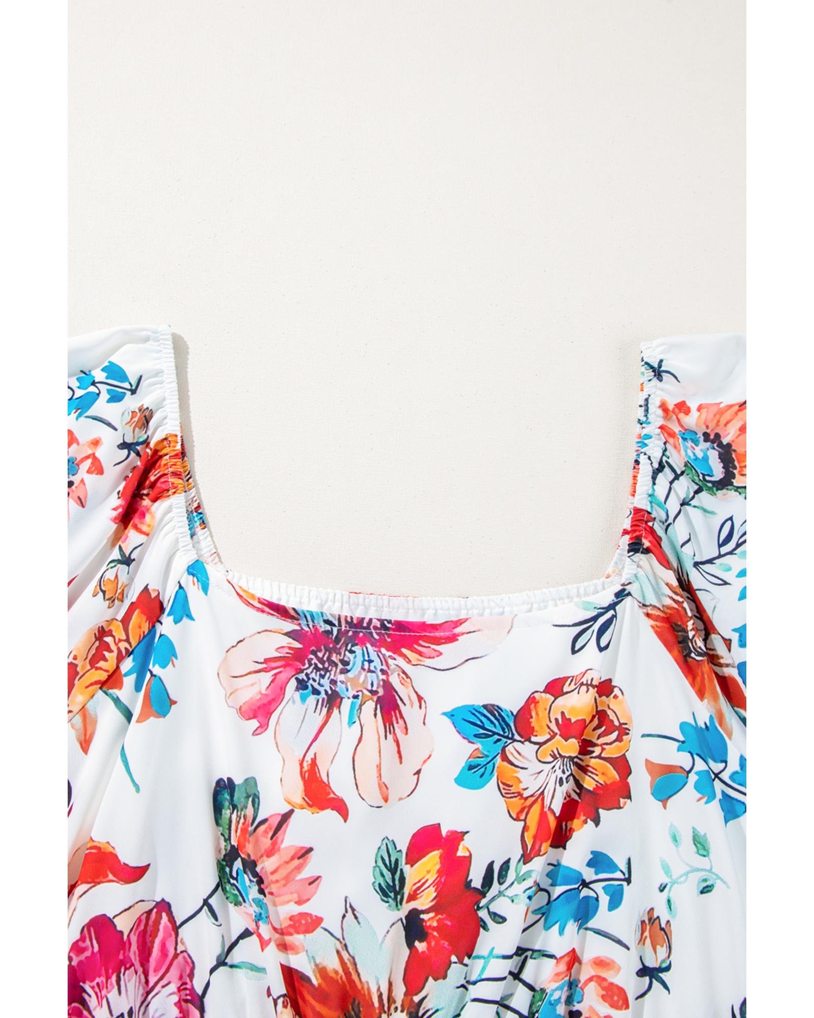 White Floral Square Neck Puff Sleeve Flowy Plus Size Midi Dress – 2X