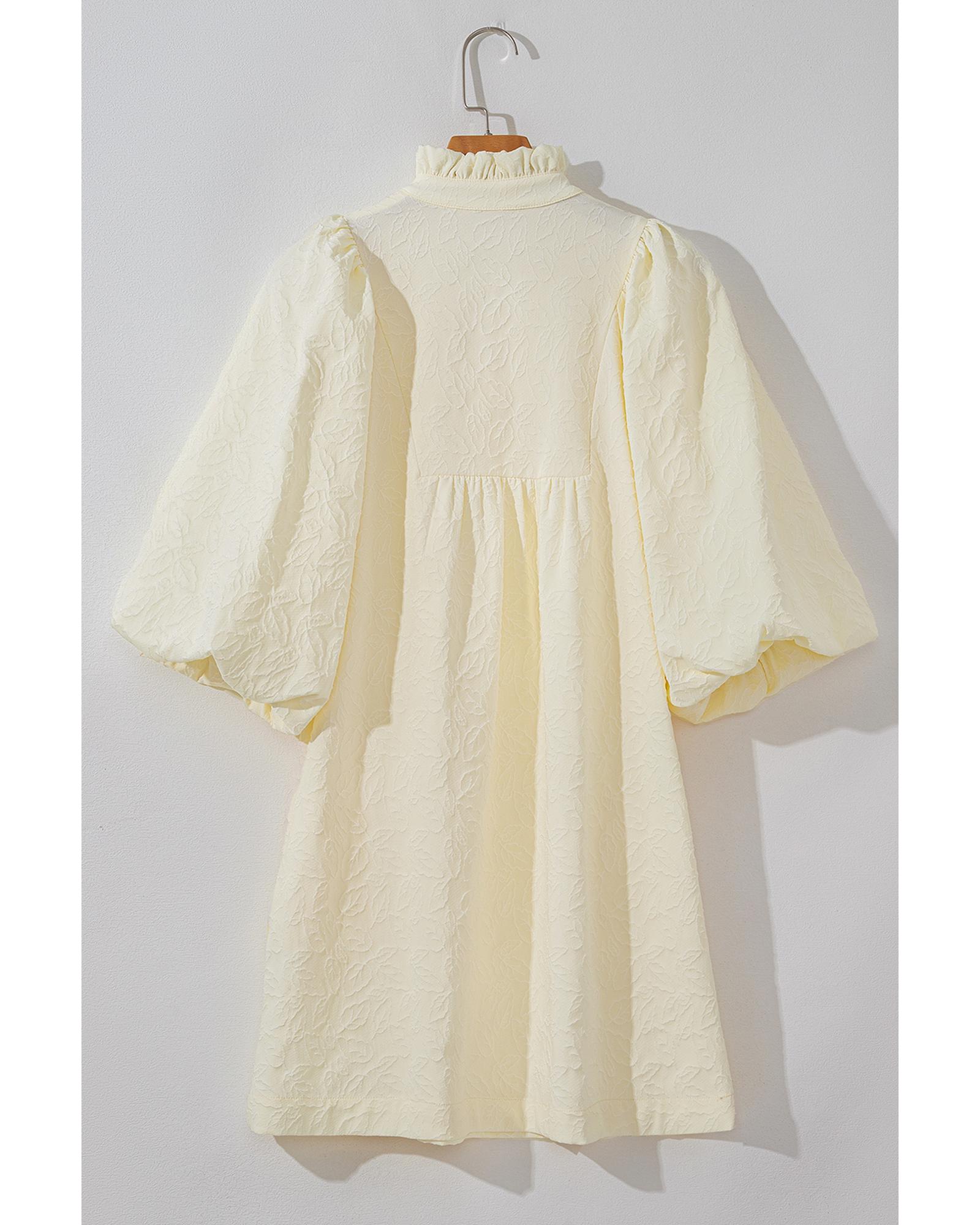 White Floral Textured Bubble Sleeve Frilled Notched Neck Dress – L