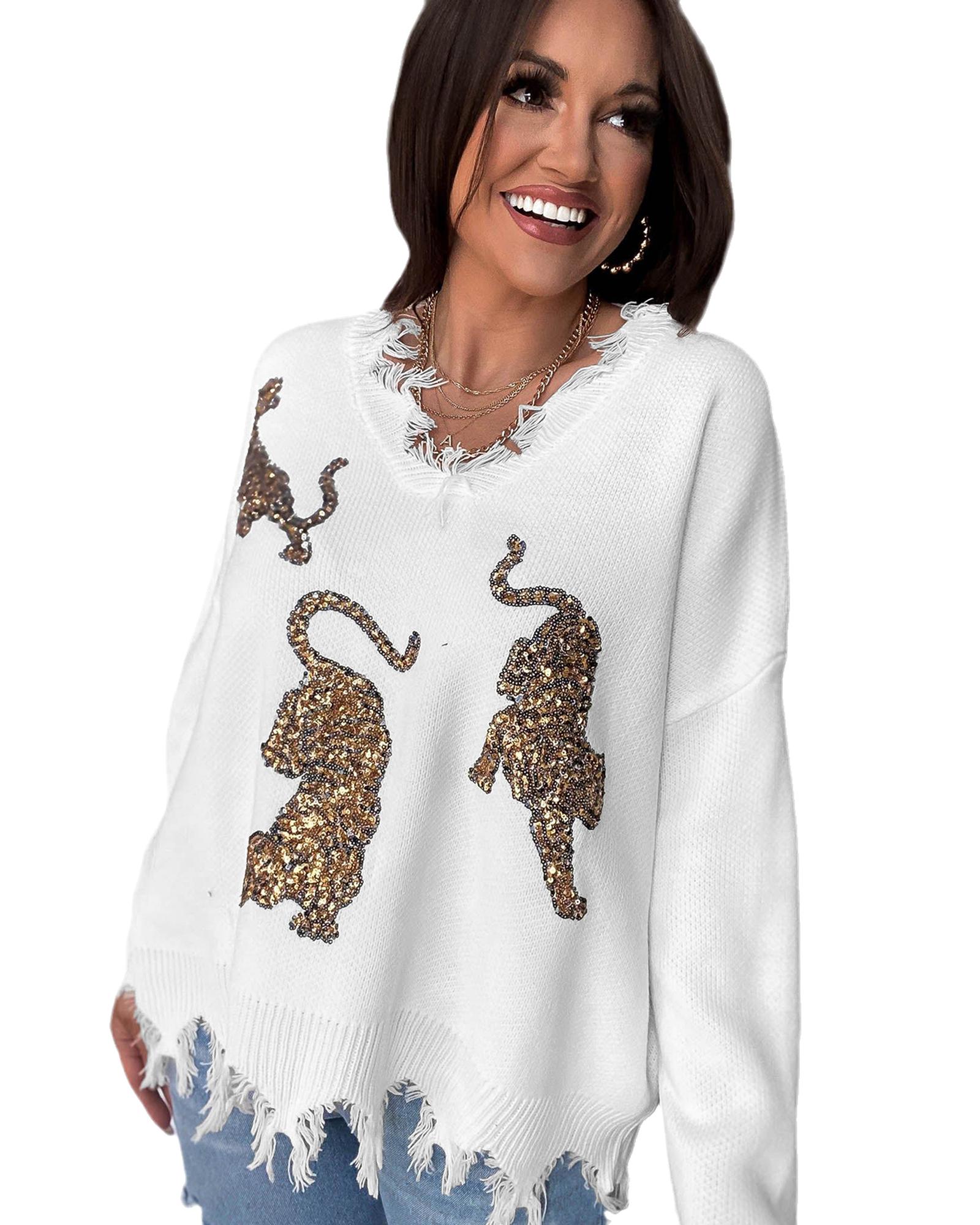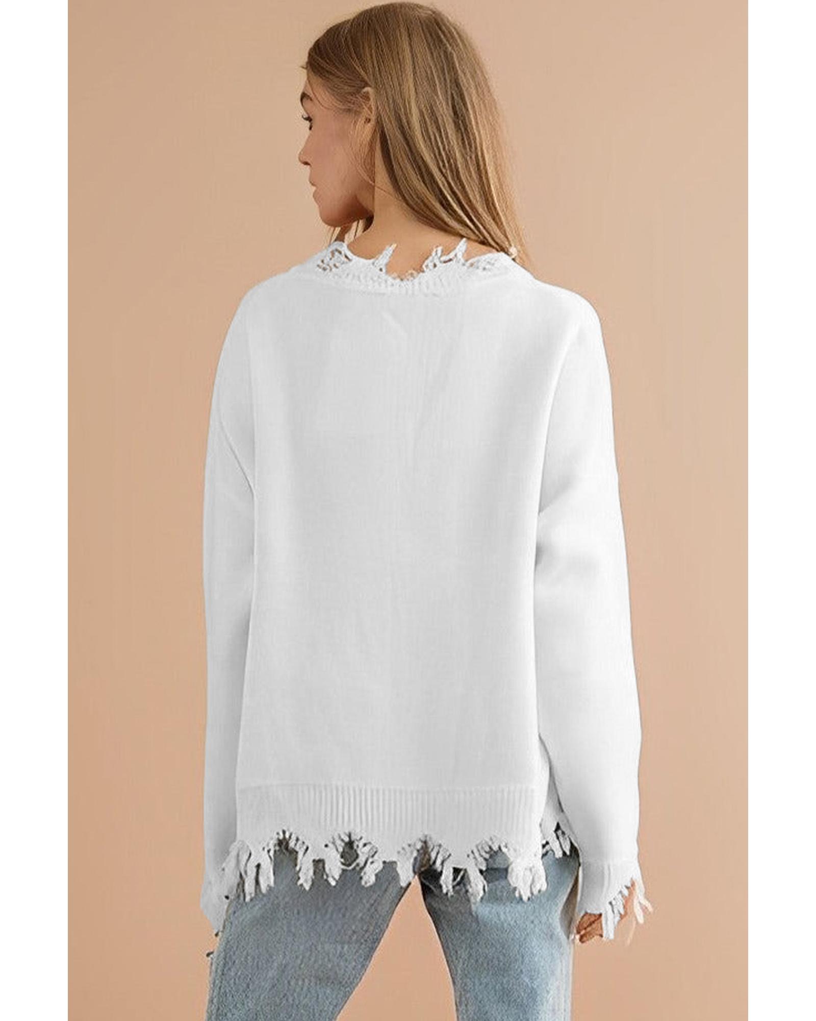 Beau Blue Flower Detail Knitted Notched Neck Sweater - S