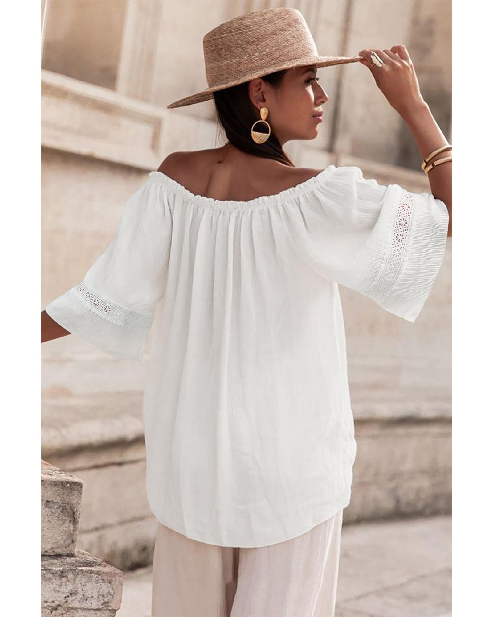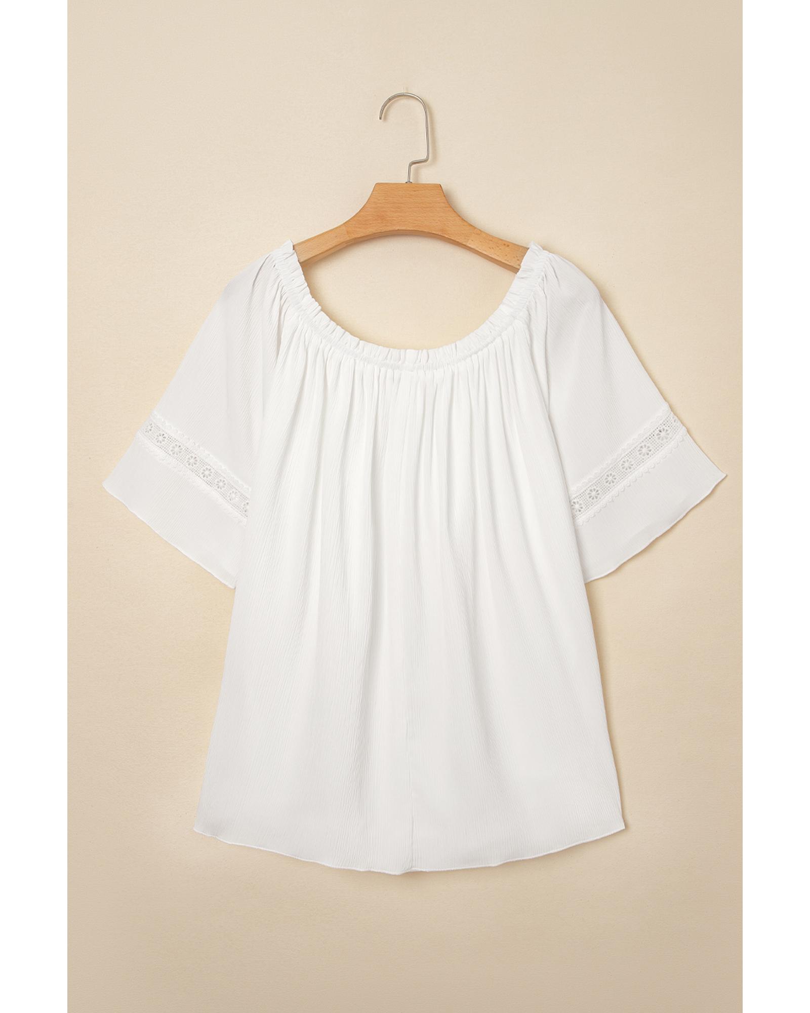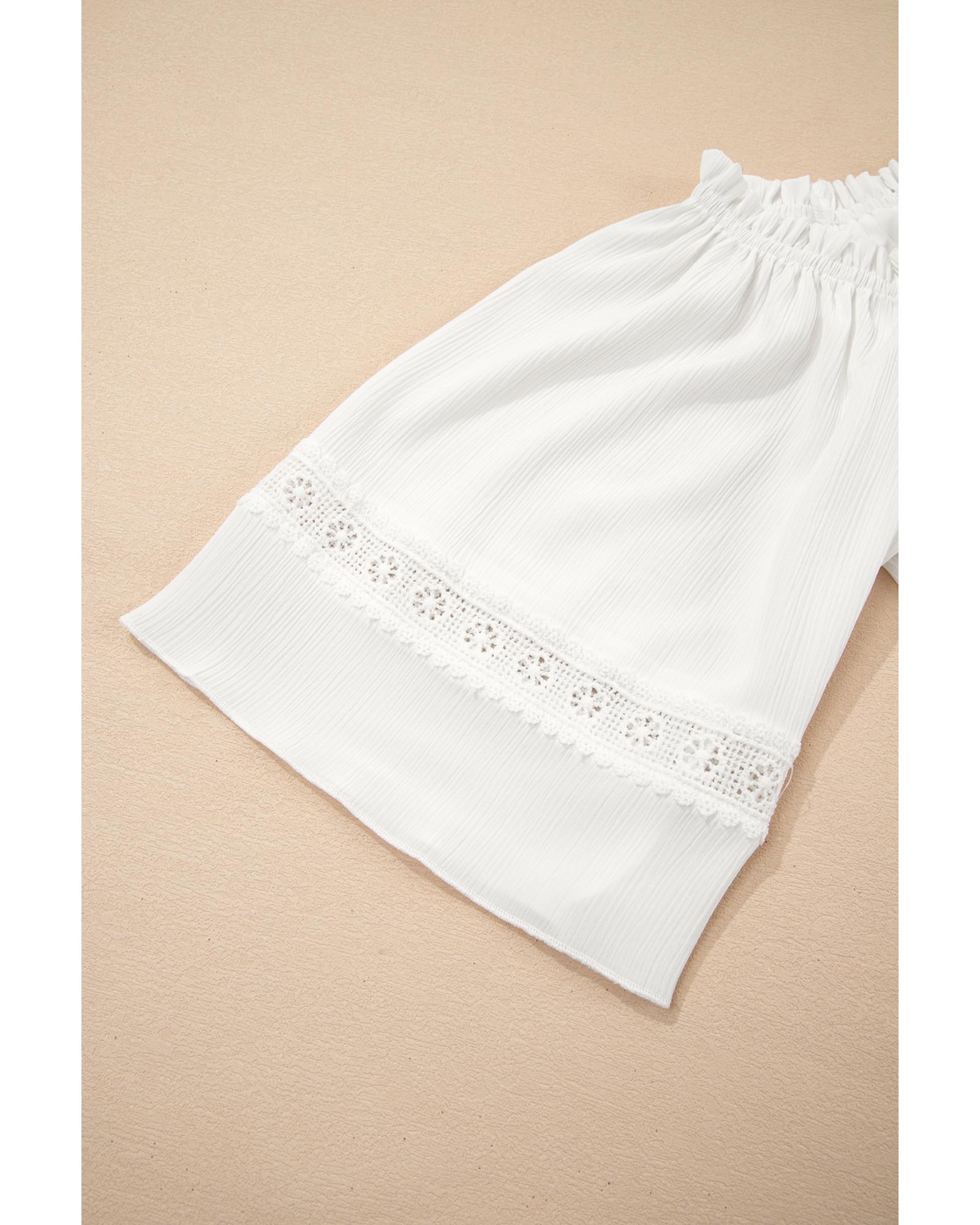 White Frilly Off Shoulder Lace Insert Sleeve Textured Blouse – L