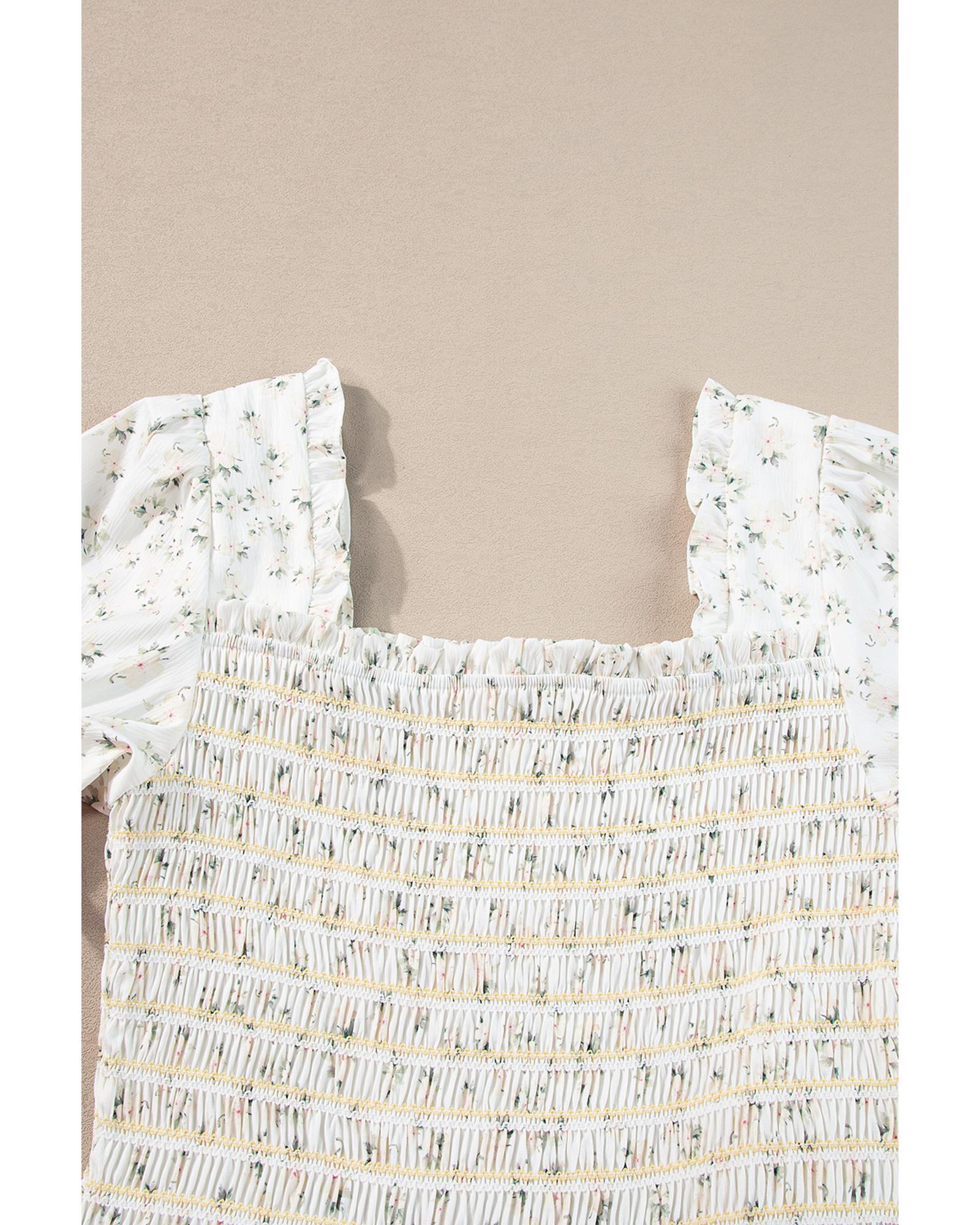 - White Frilly Shirred Bodice Tiered Floral Maxi Dress