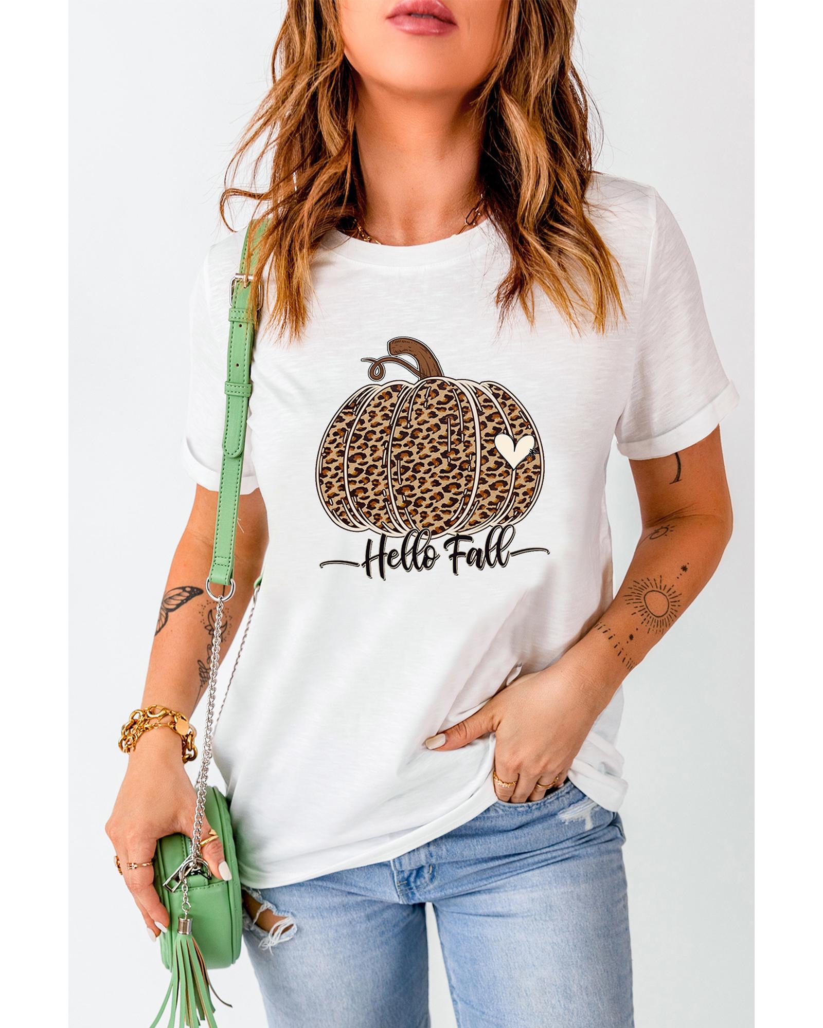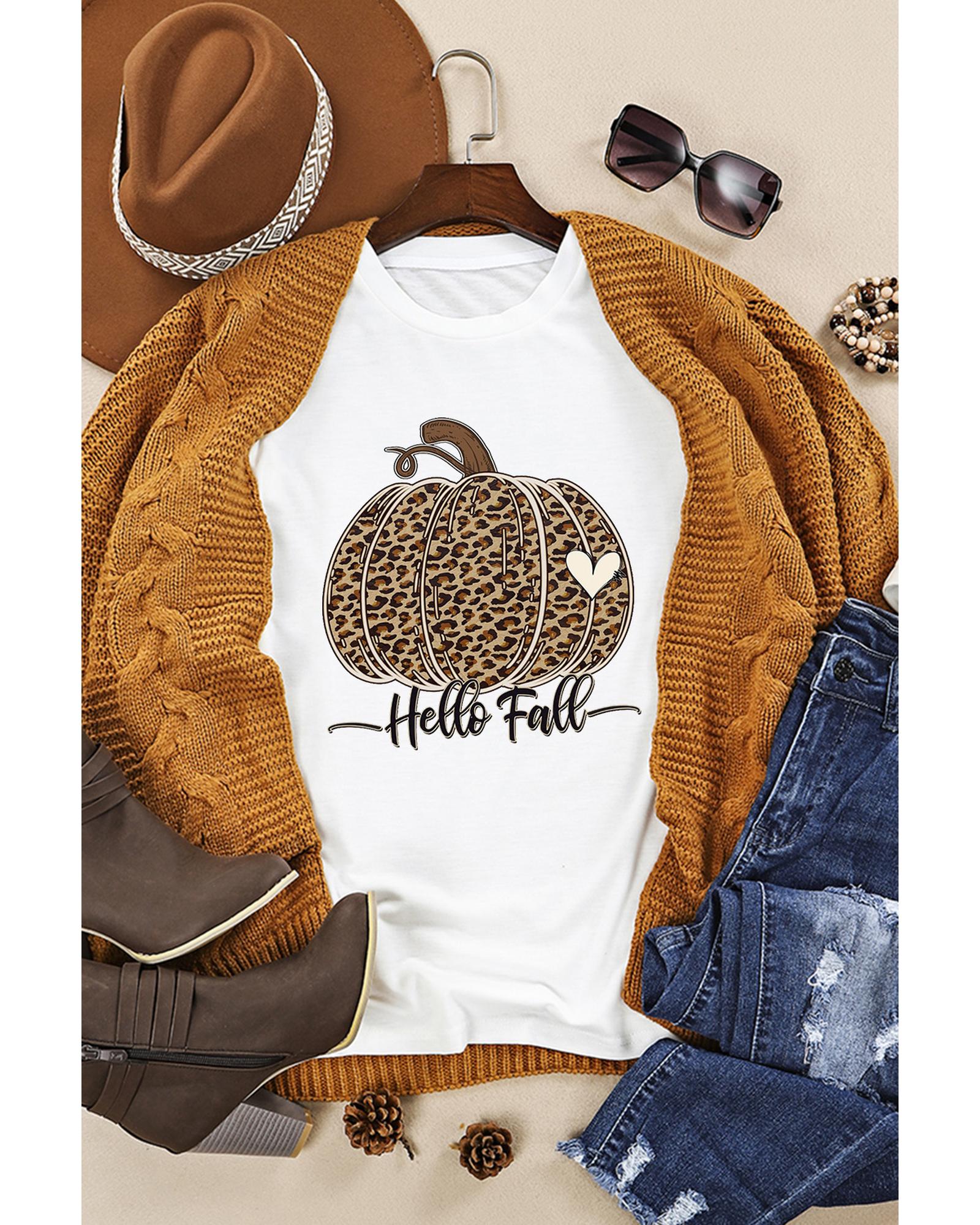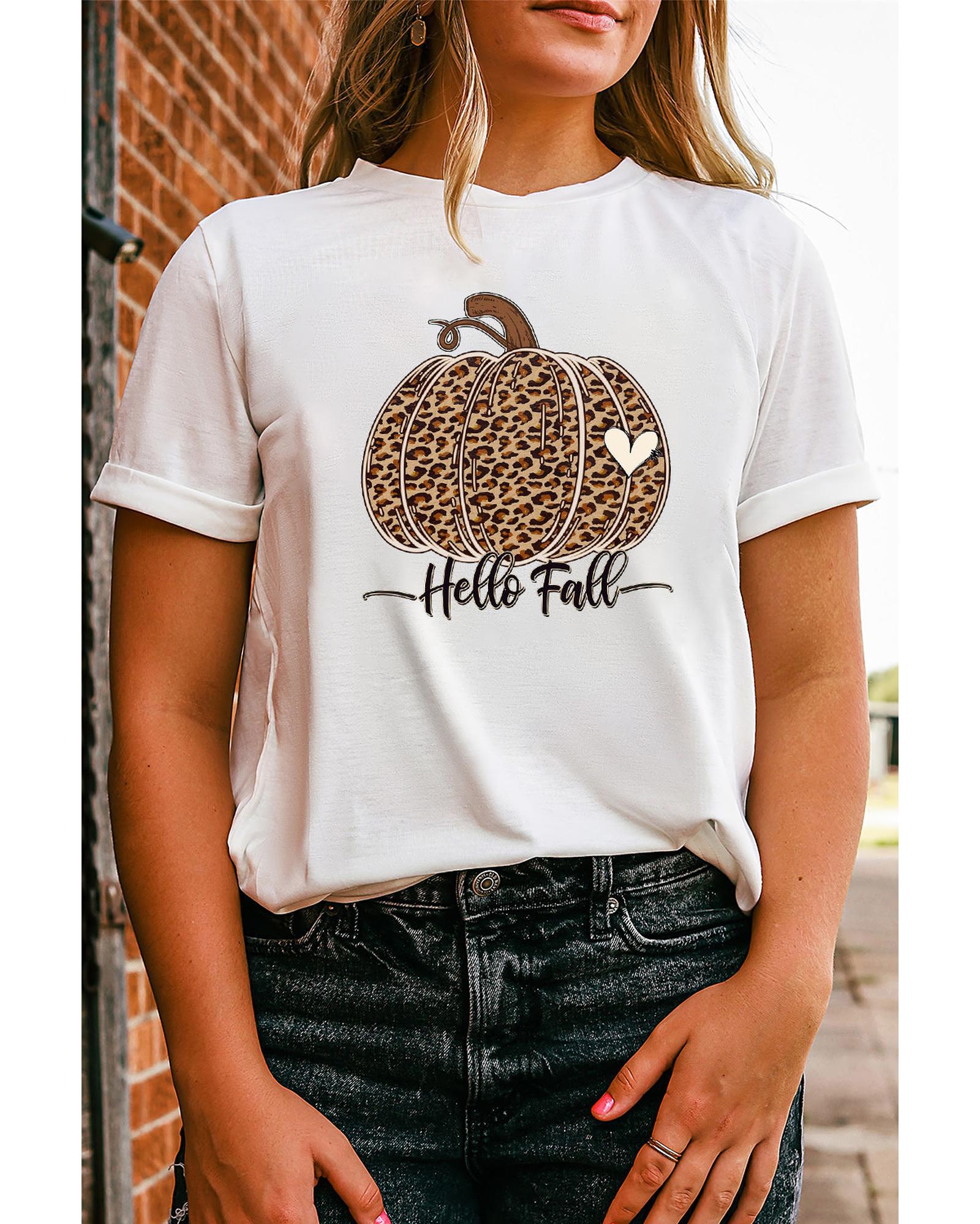 White Hello Fall Leopard Pumpkin Graphic T Shirt – M