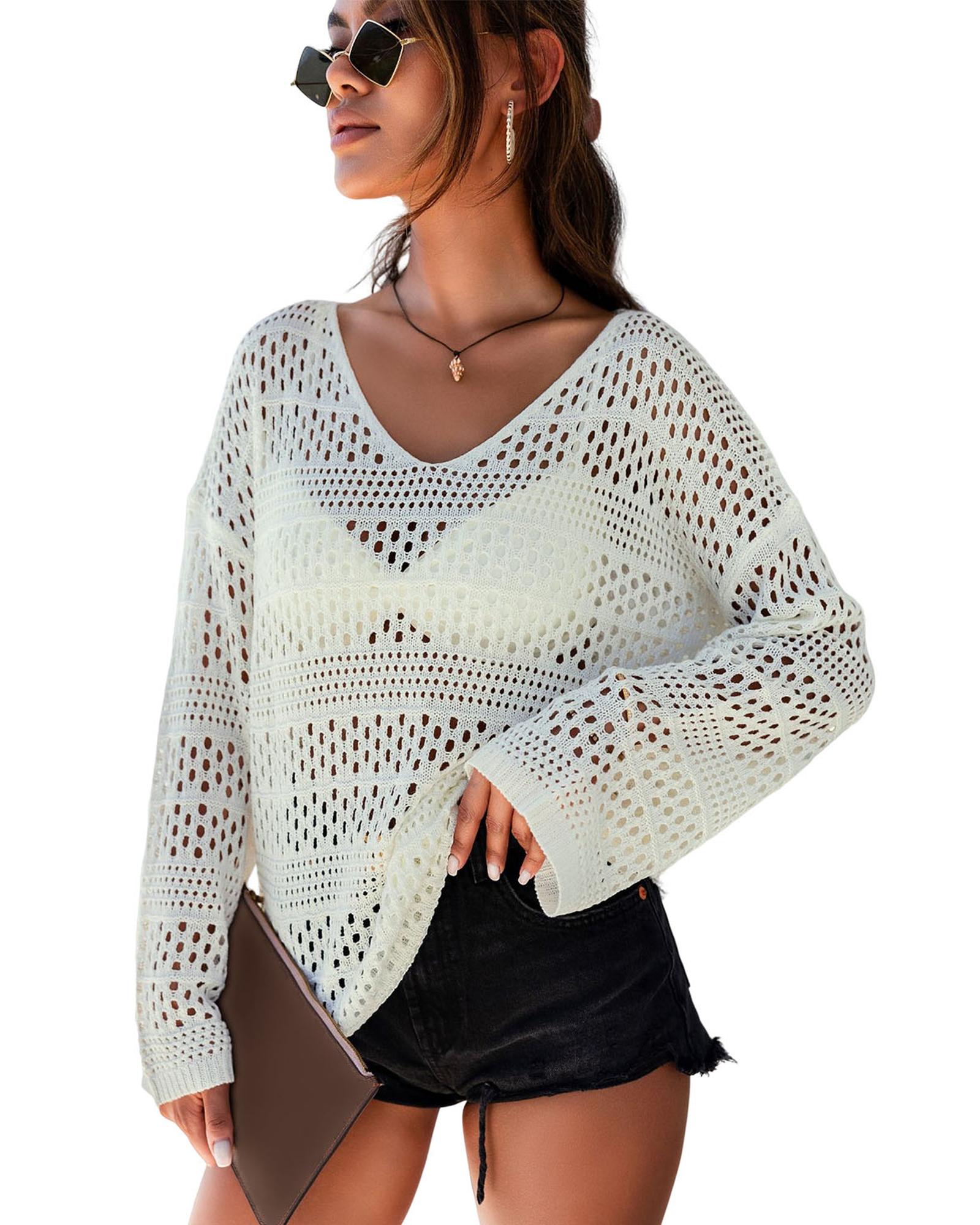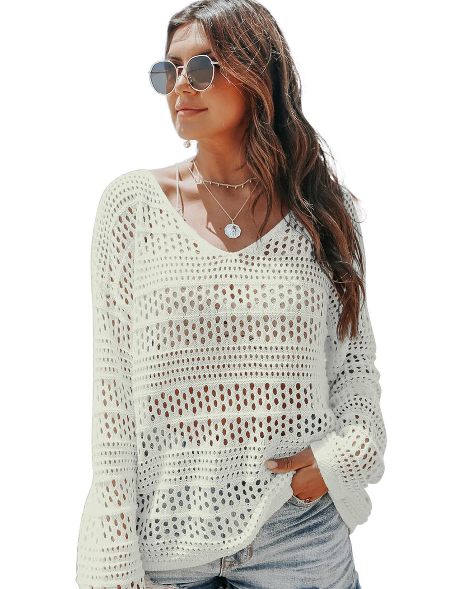 White Hollow Out Crochet V Neck Pullover Sweater – L