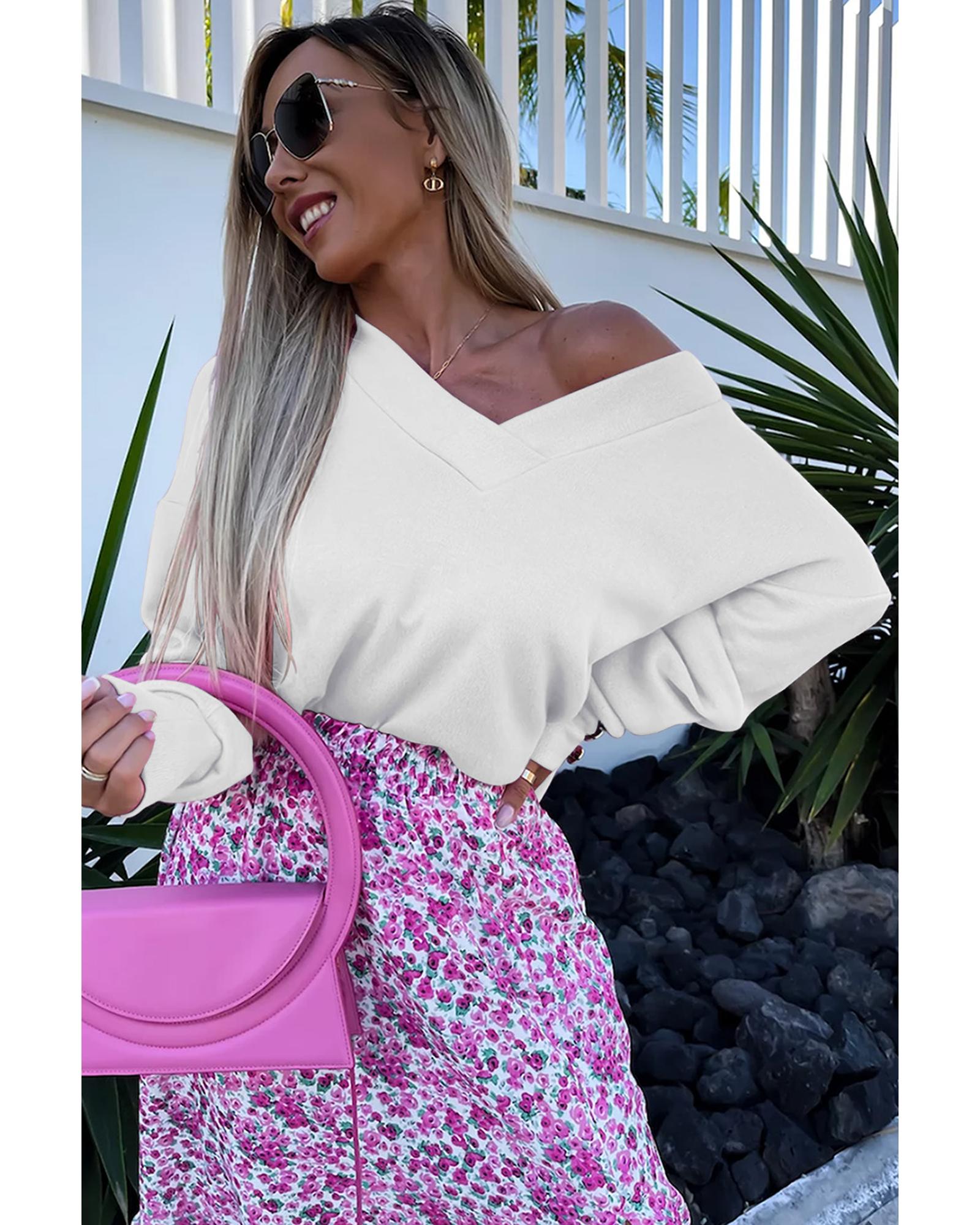 White Knitted V Neck Buttoned Cuffs Sweater – M