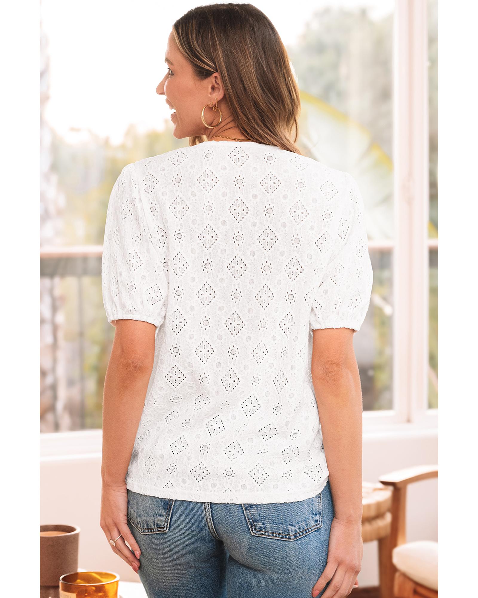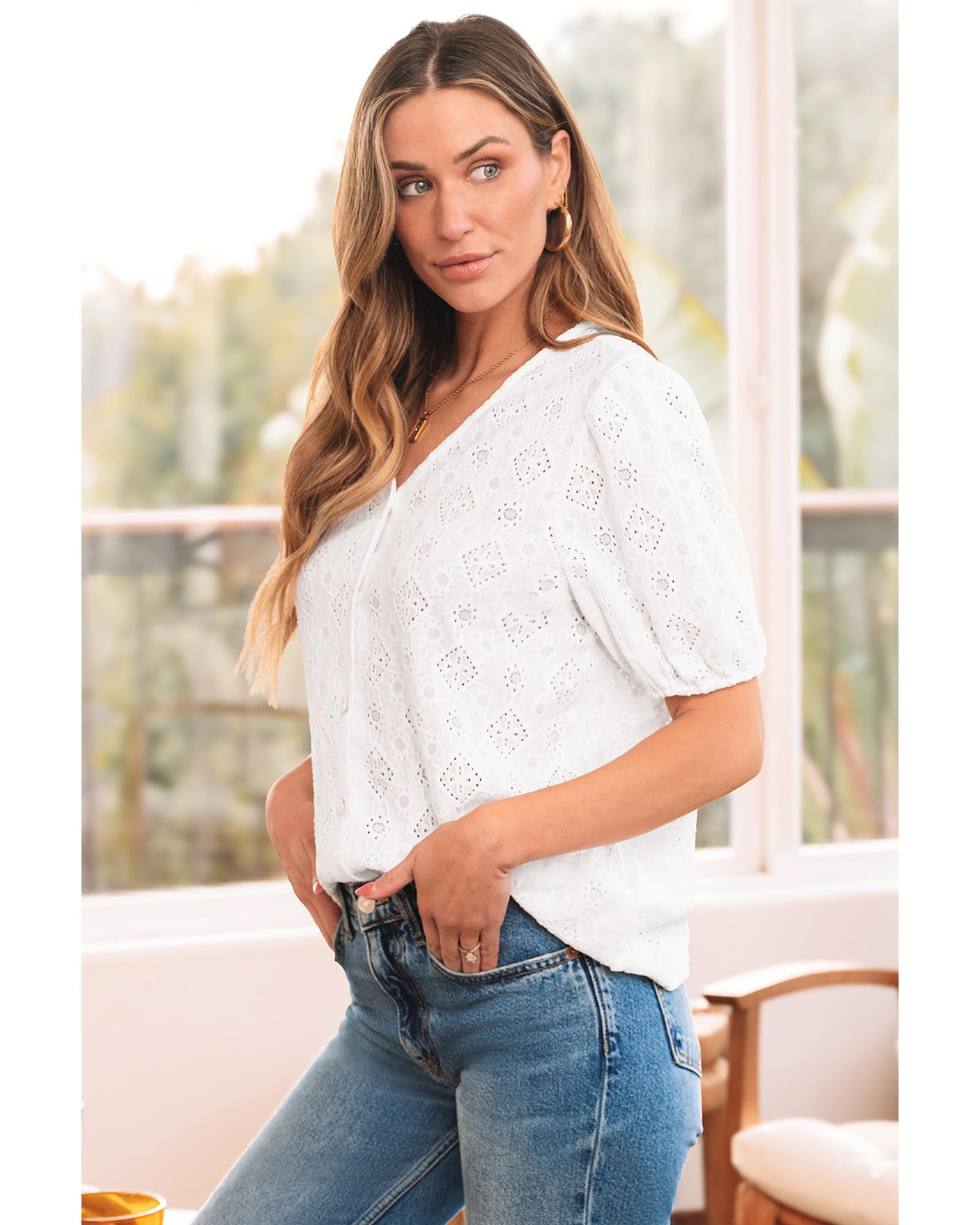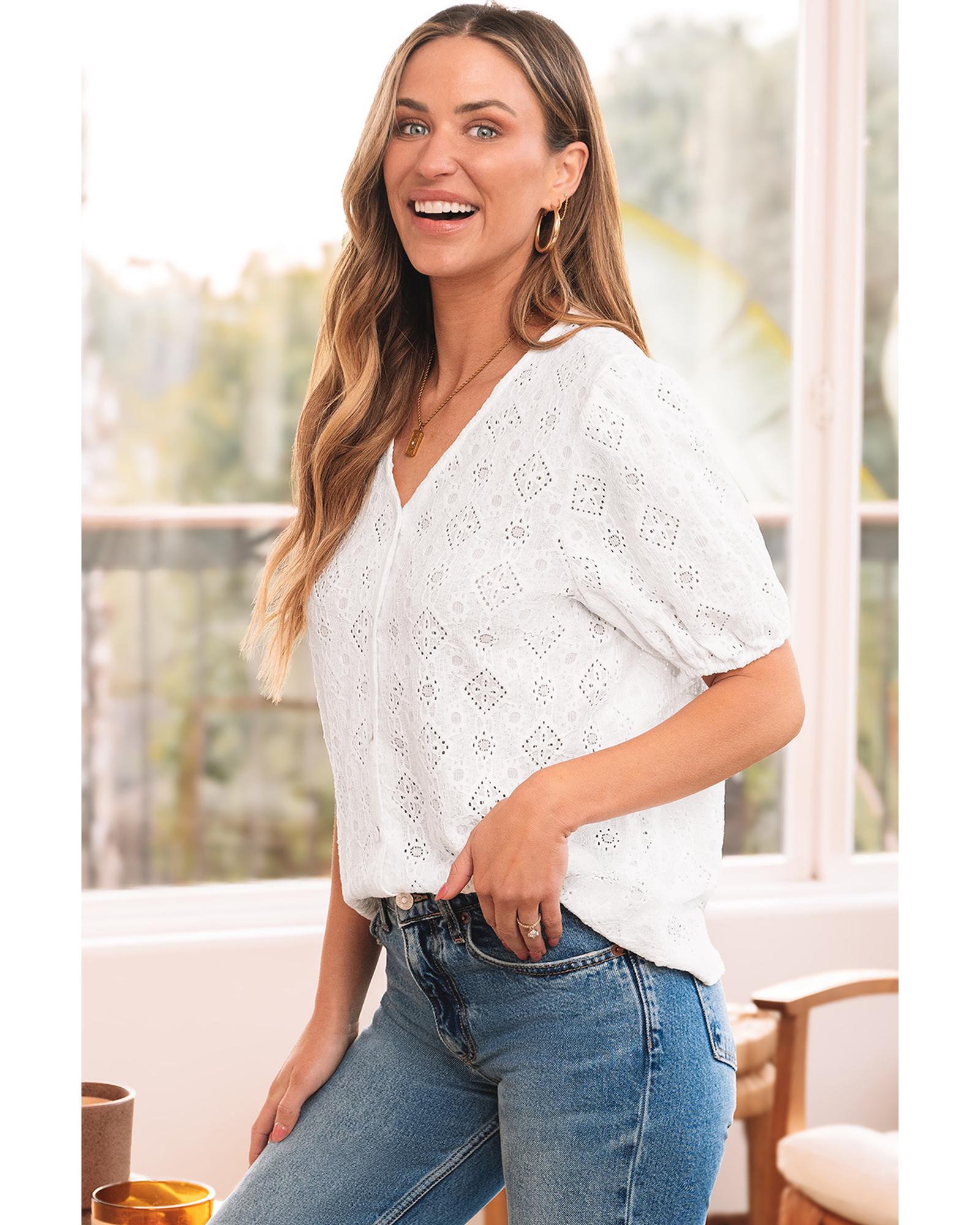 White Lace Puff Sleeve V Neck Button Up Shirt – S