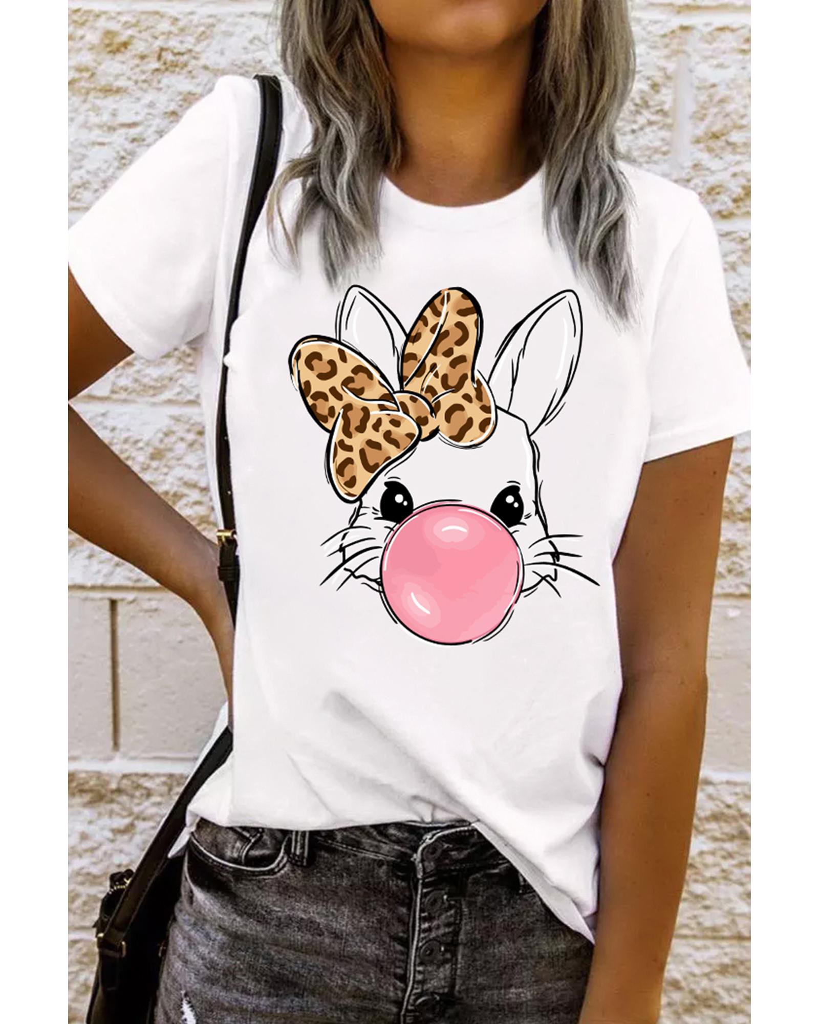 White Leopard Bow Bubble Rabbit Graphic Tee – M