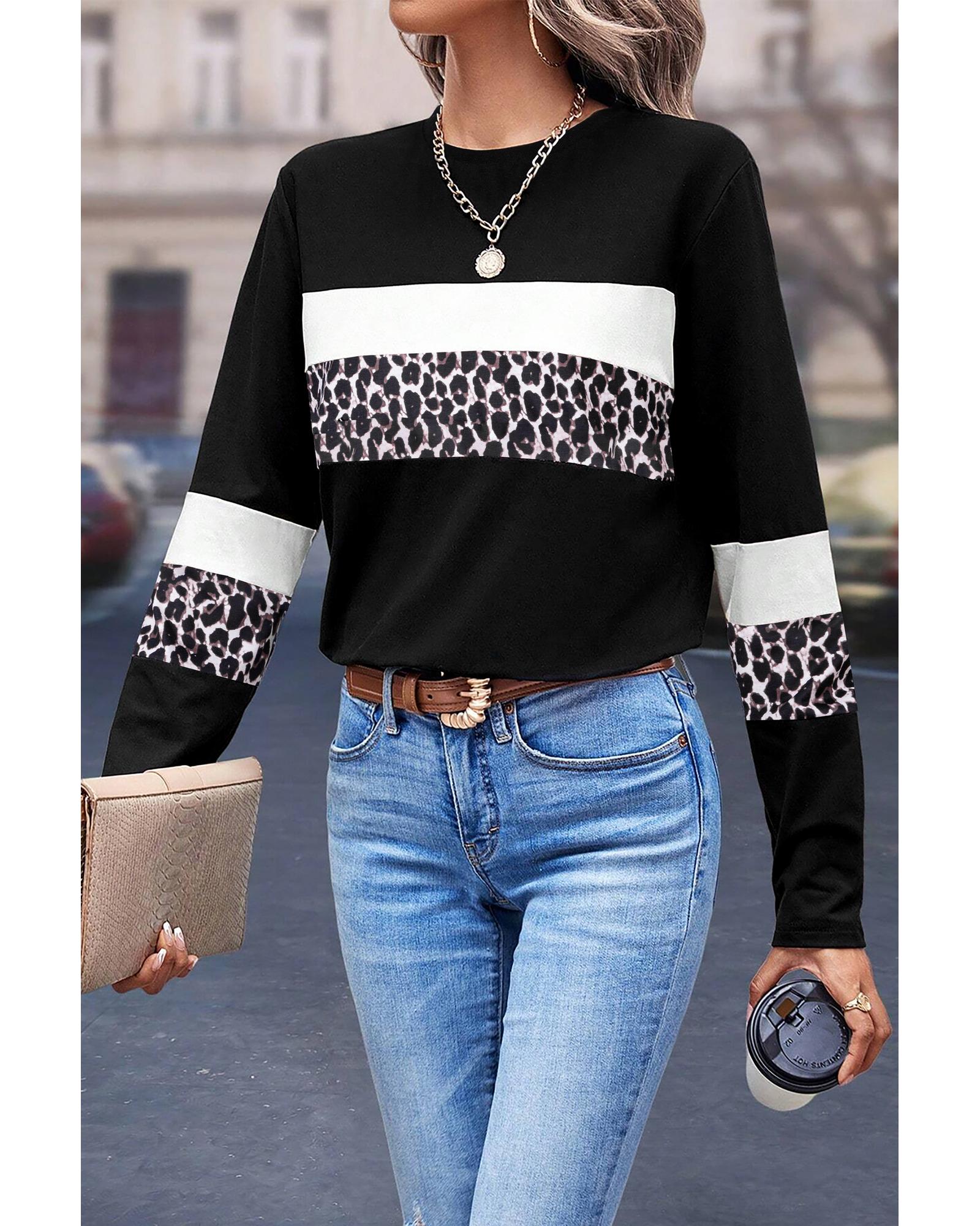 White Leopard Colorblock Patchwork Crew Neck Long Sleeve Tee – M