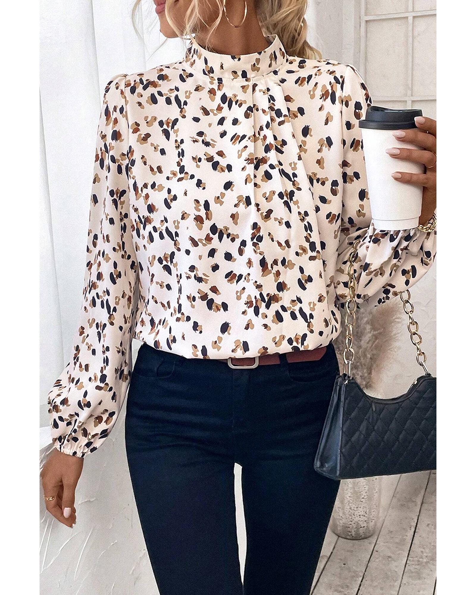 White Leopard Print Lantern Sleeve Mock Neck Pleated Blouse – XL