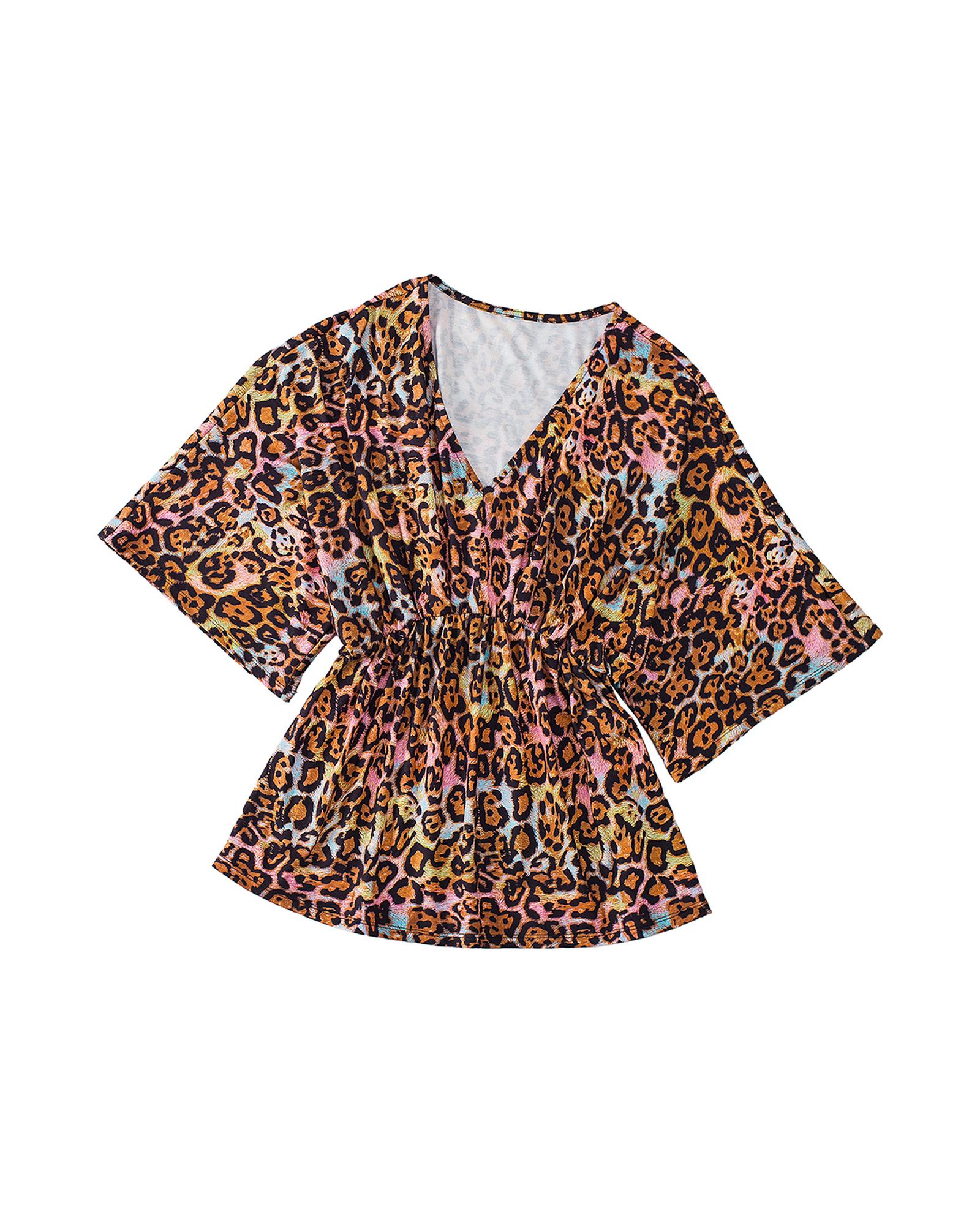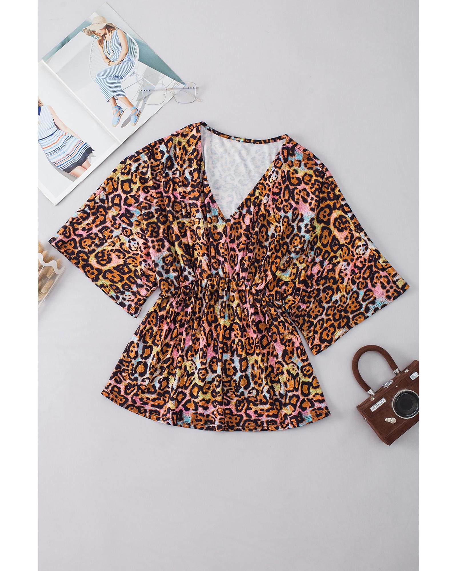 White Leopard Print Wide Sleeve Peplum Hem Blouse – M