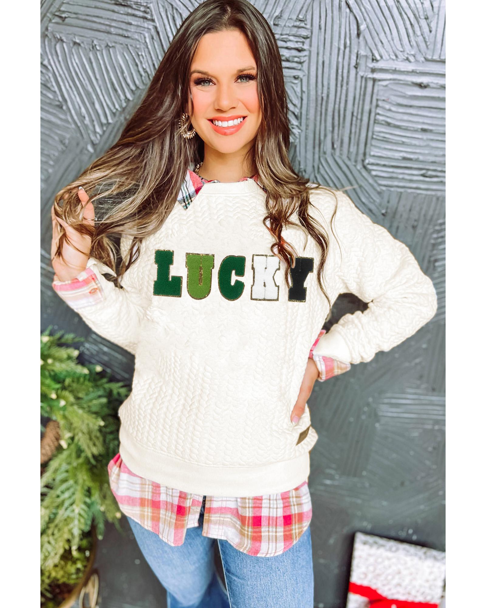 - White LUCKY Chenille Embroidered Cable Knit Pullover Sweatshirt