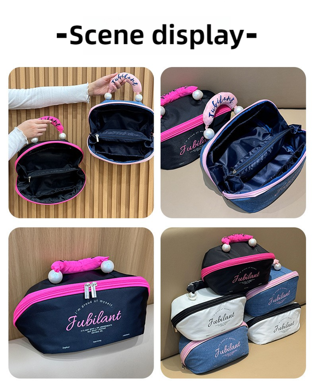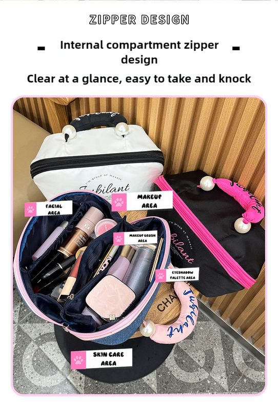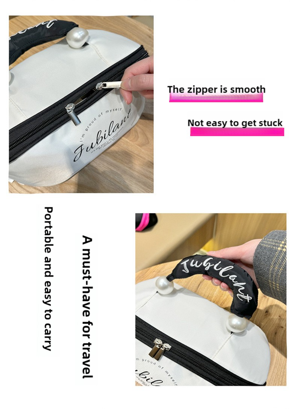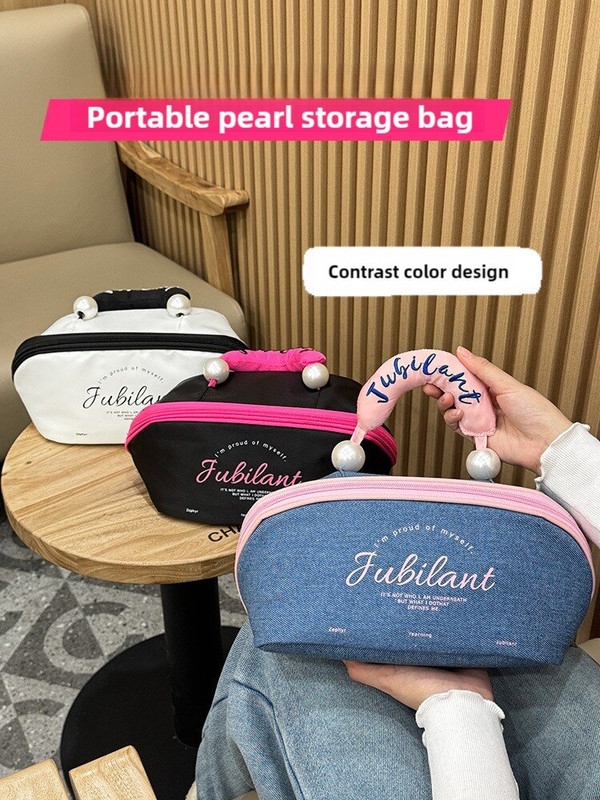 White Patchwork Black Portable Waterproof Color Block Makeup Bag with Pearl Handle, Large Capacity Cosmetic Storage Organizer for Travel and Daily Use