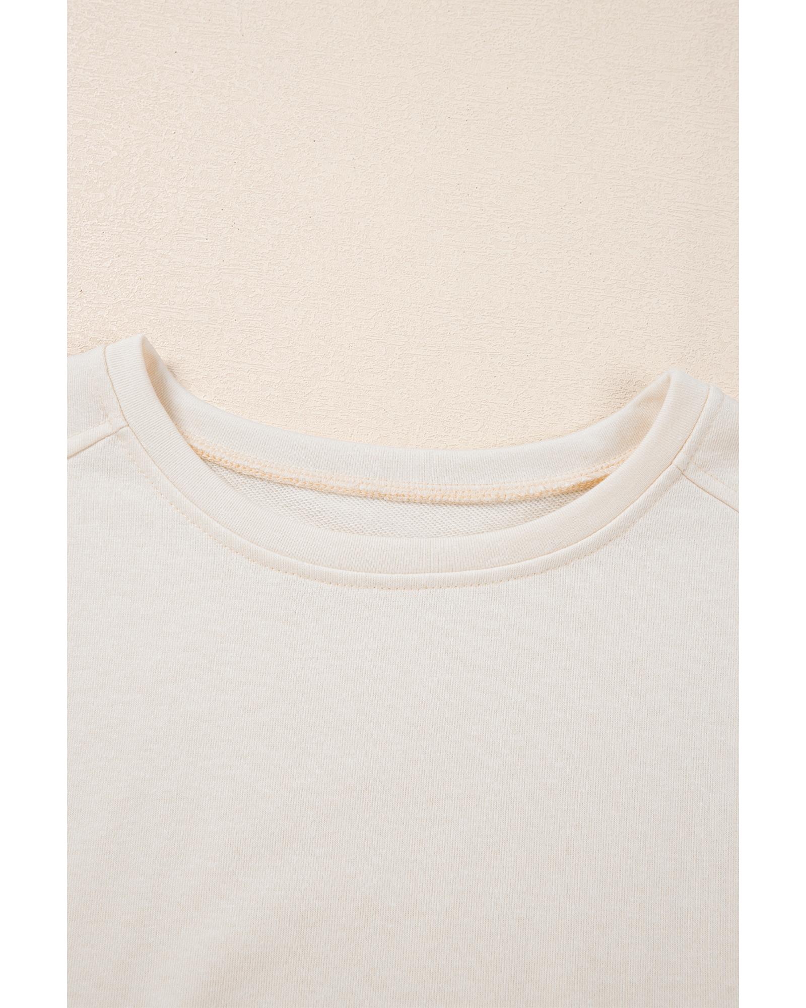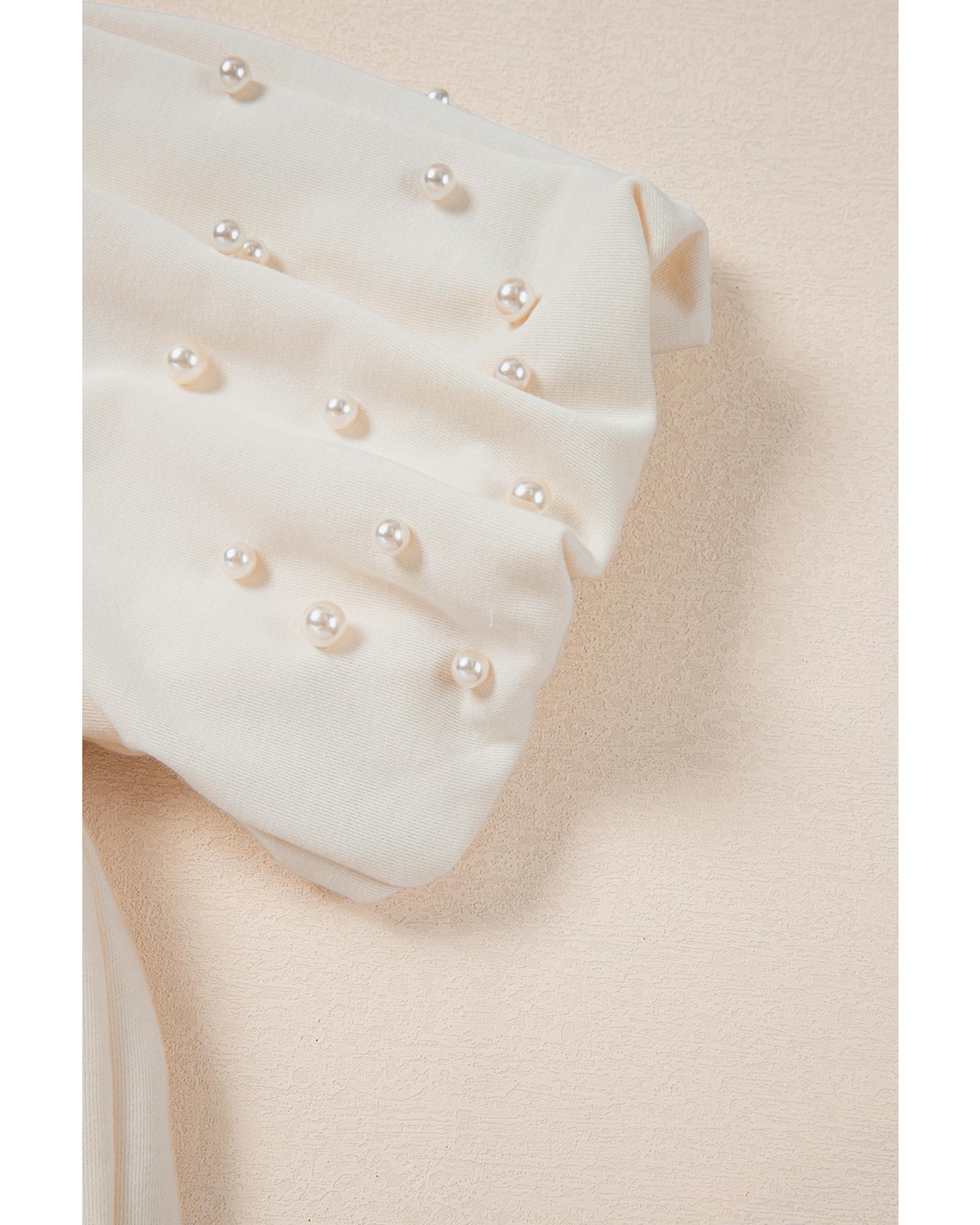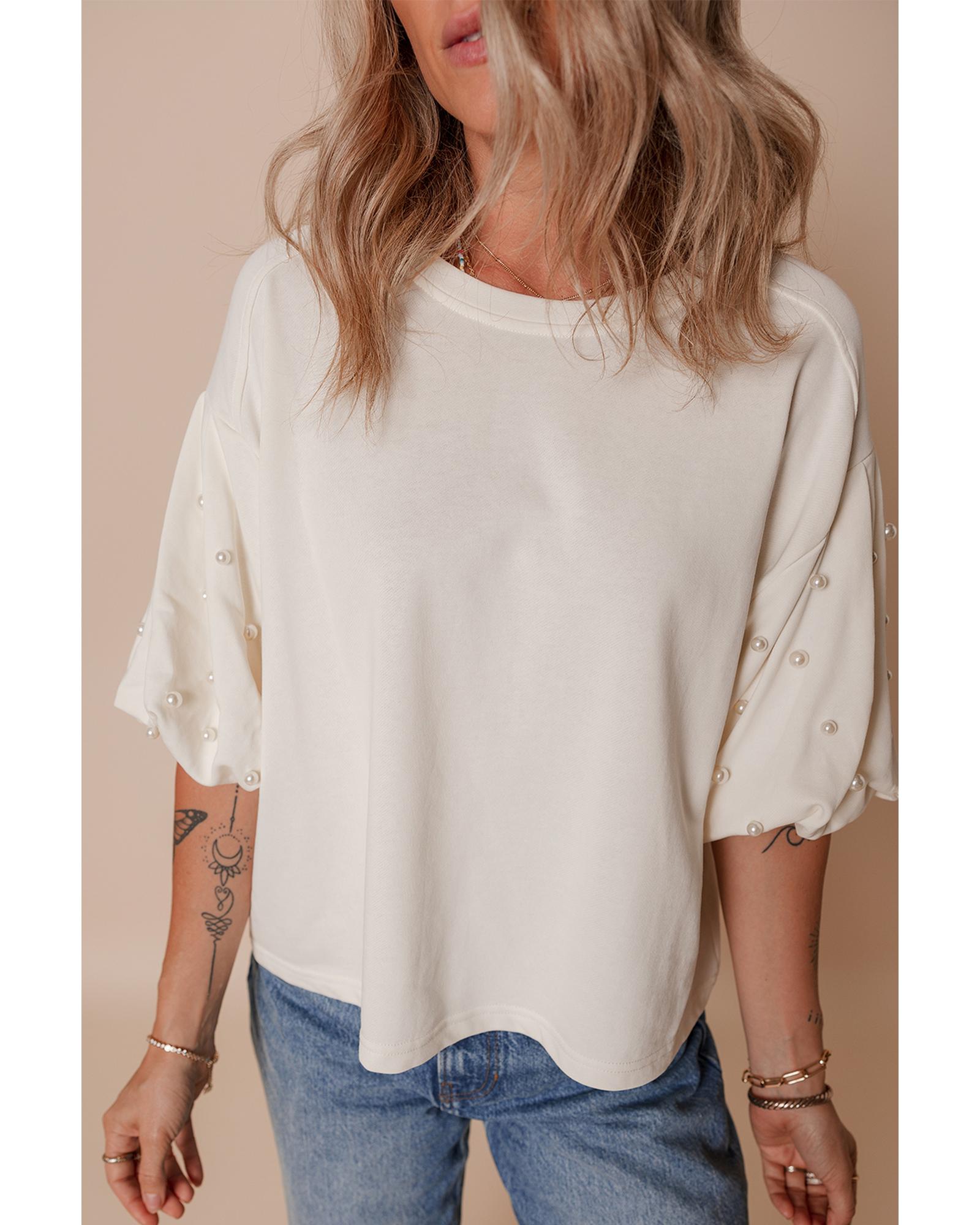 White Pearled Puff Sleeve Round Neck Loose Top – L