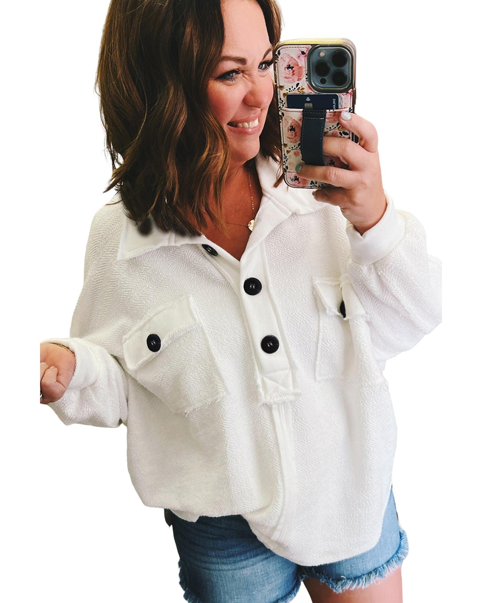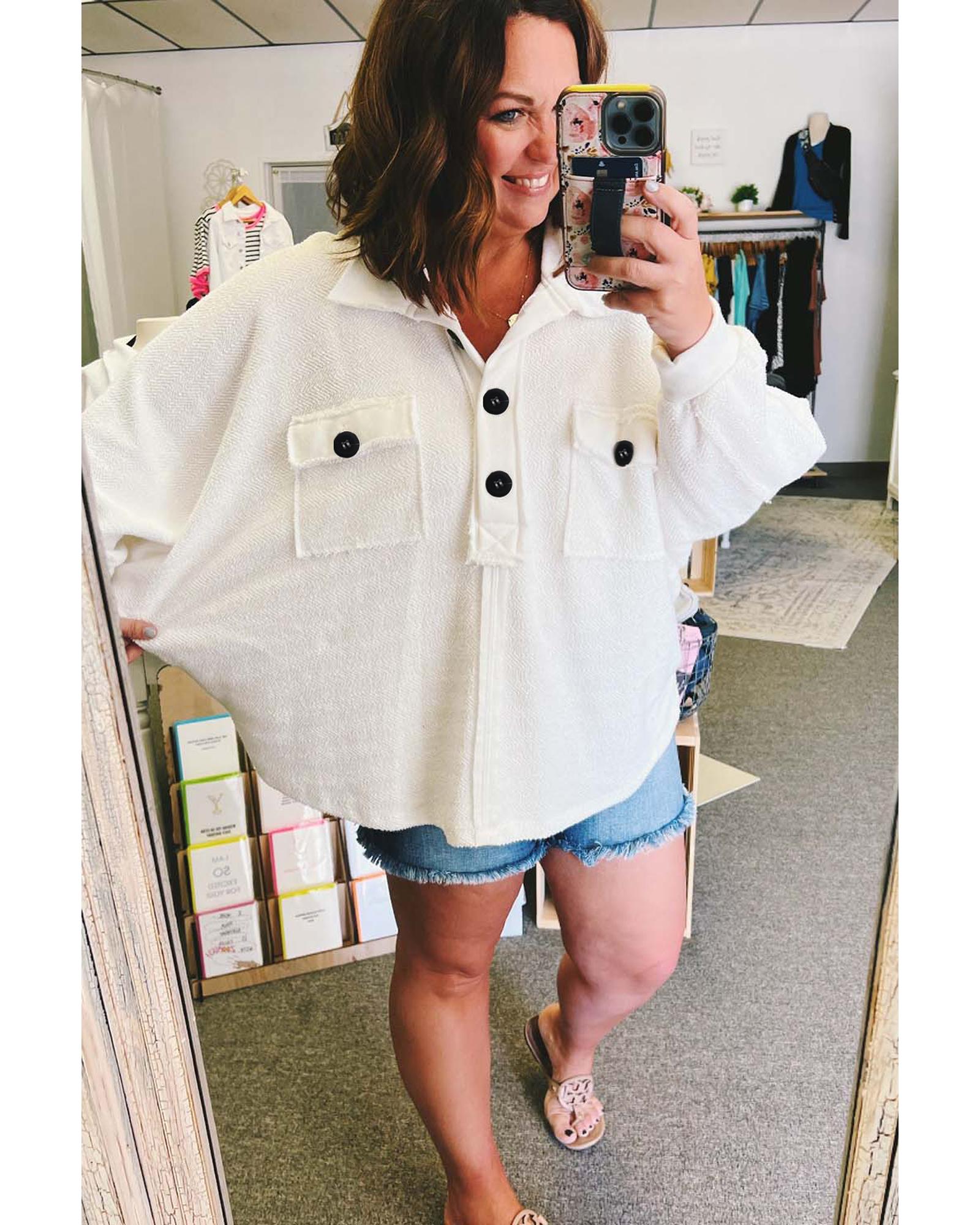 White Plus Size Long Sleeve Flap Pocket Henley Top – 2X