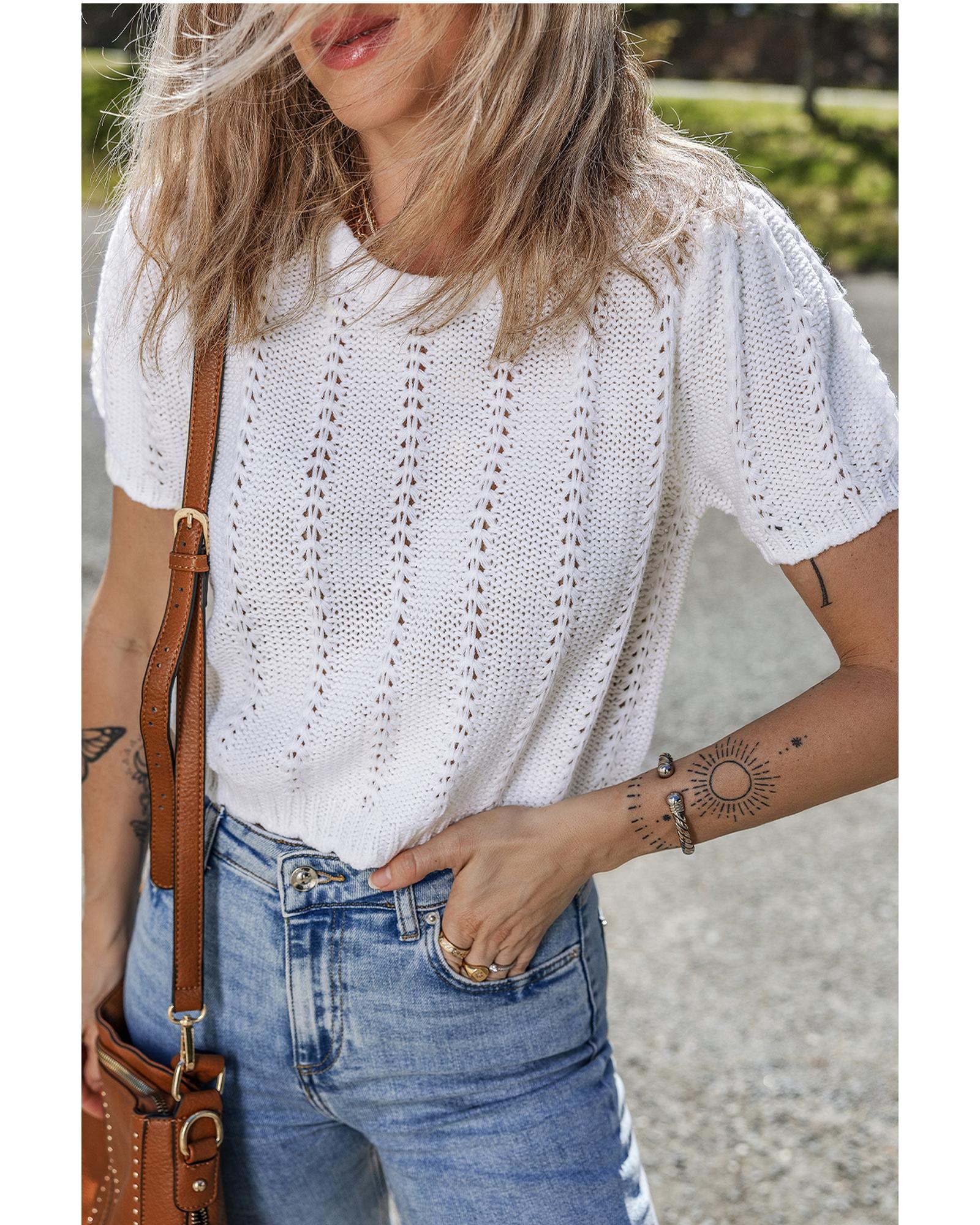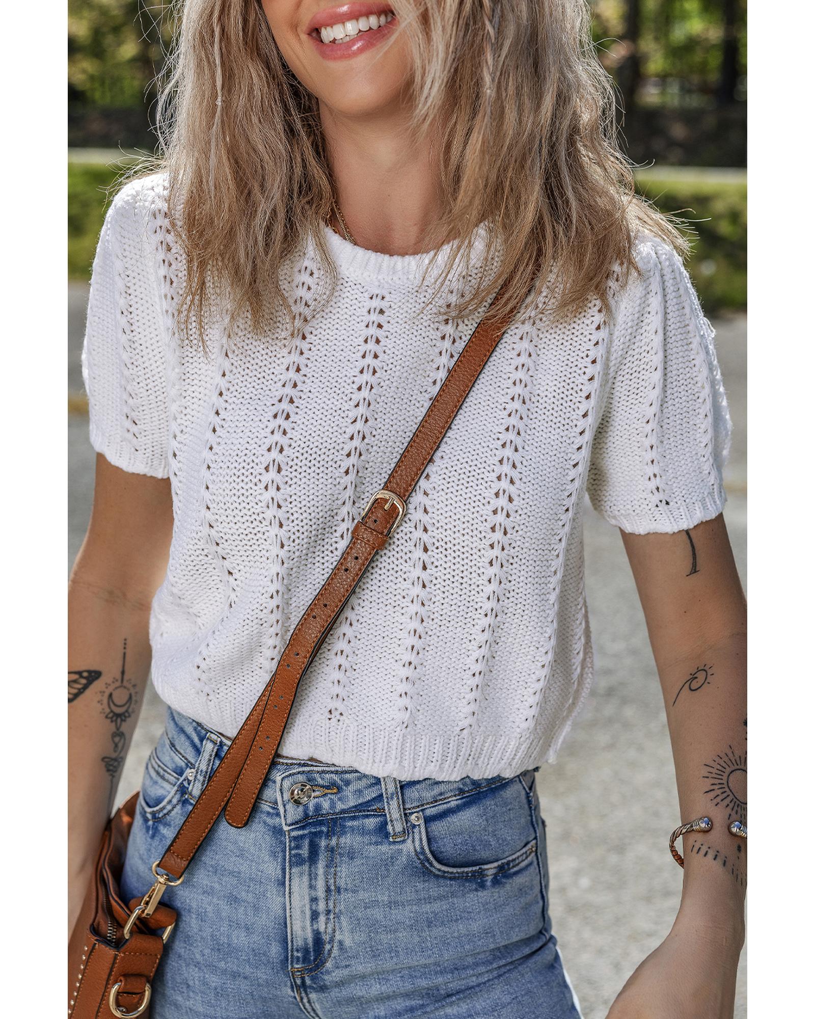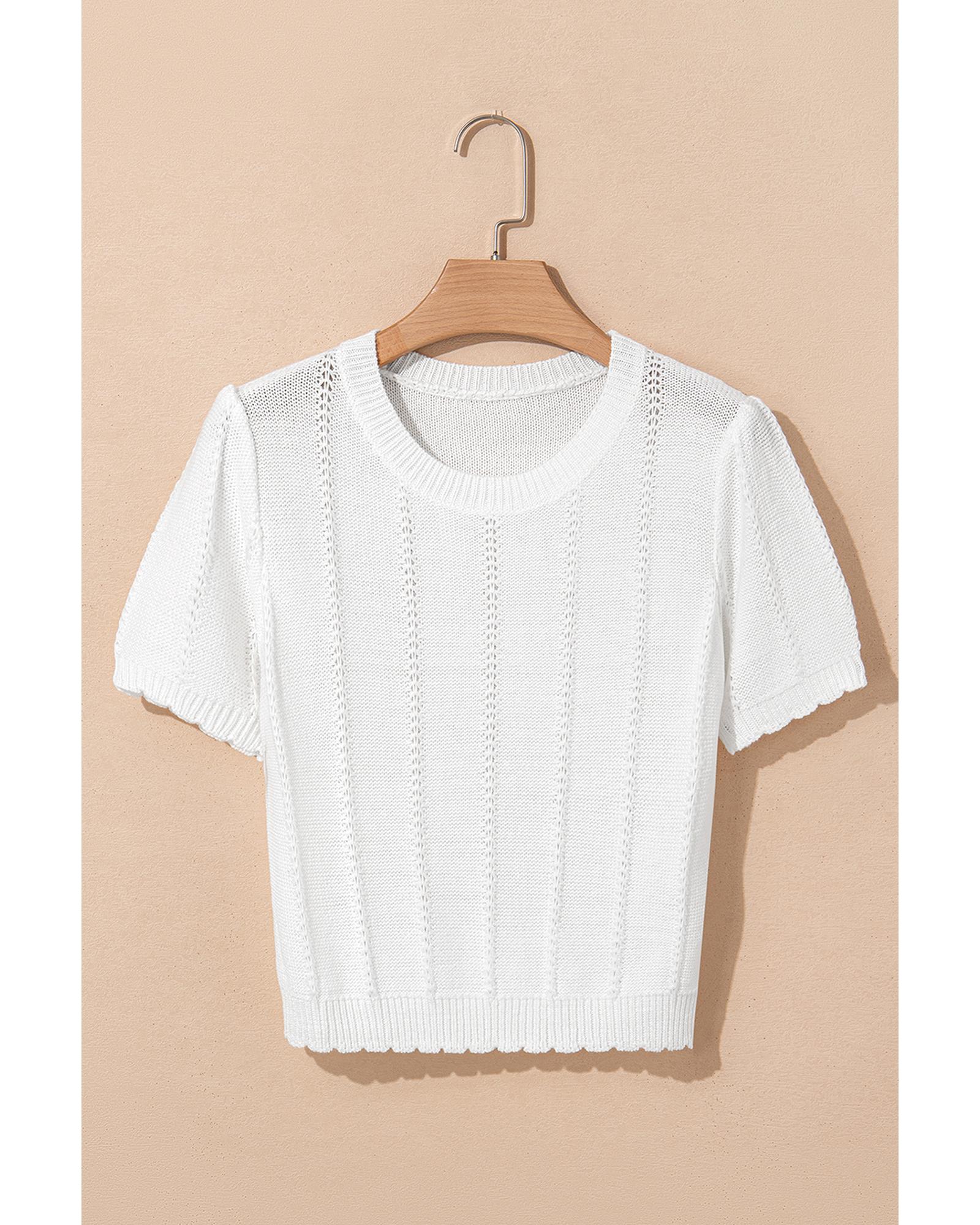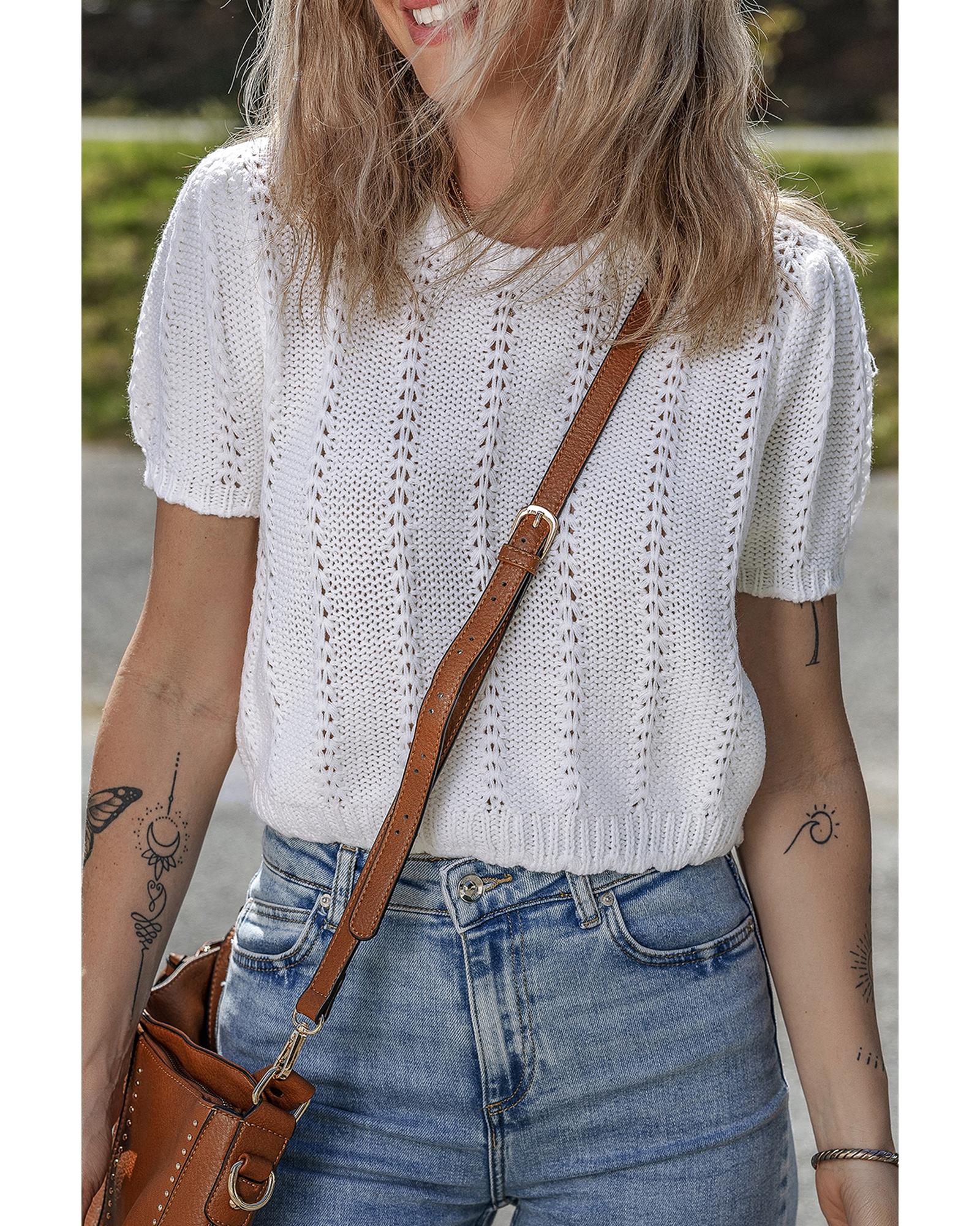 White Pointelle Knit Short Puff Sleeve Crewneck Sweater – M