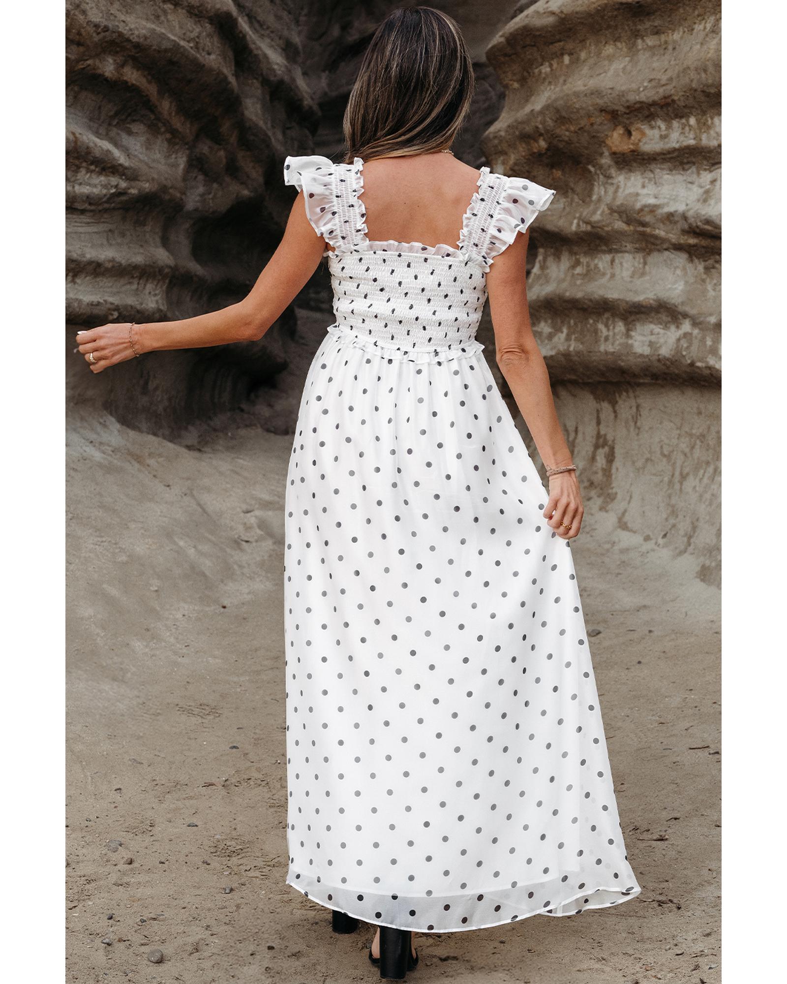 White Polka Dot Flutter Sleeve Square Neck Smocked Maxi Dress – S