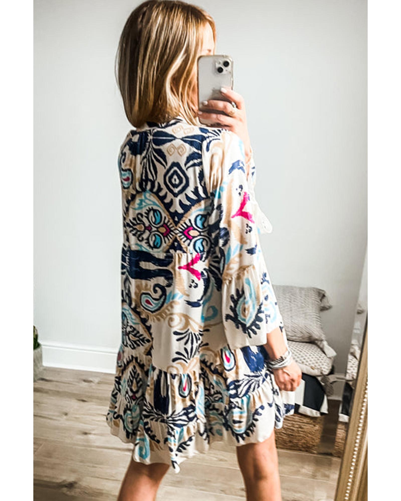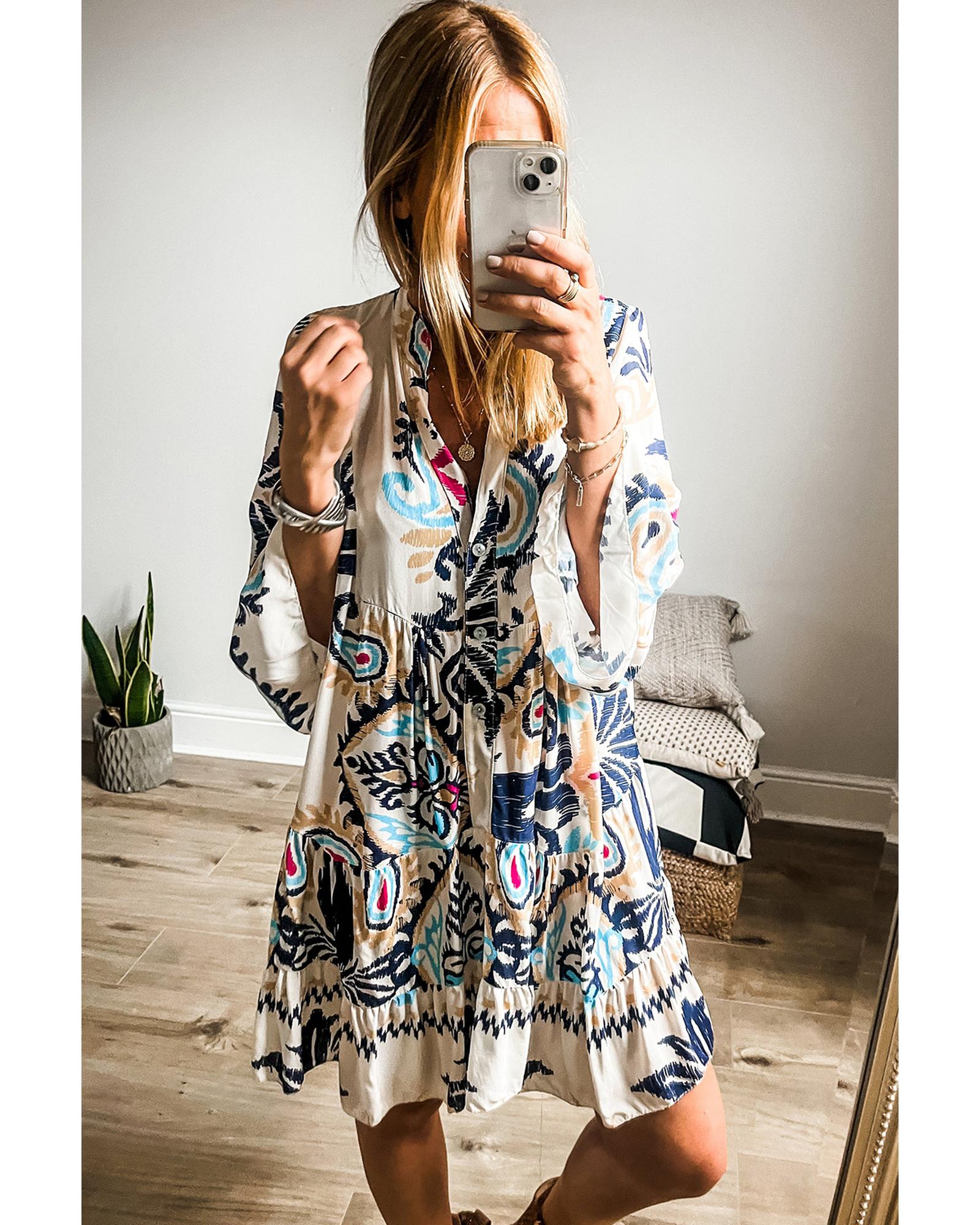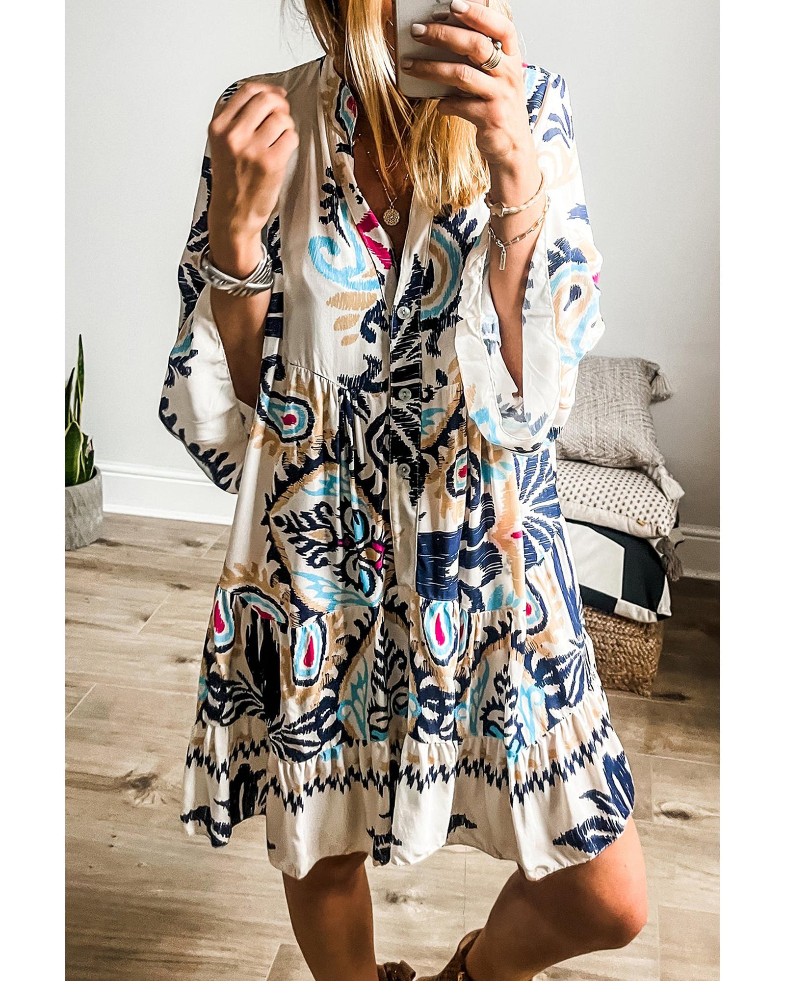 White Printed Tribal Print Bracelet Sleeve Buttoned Mini Dress – S