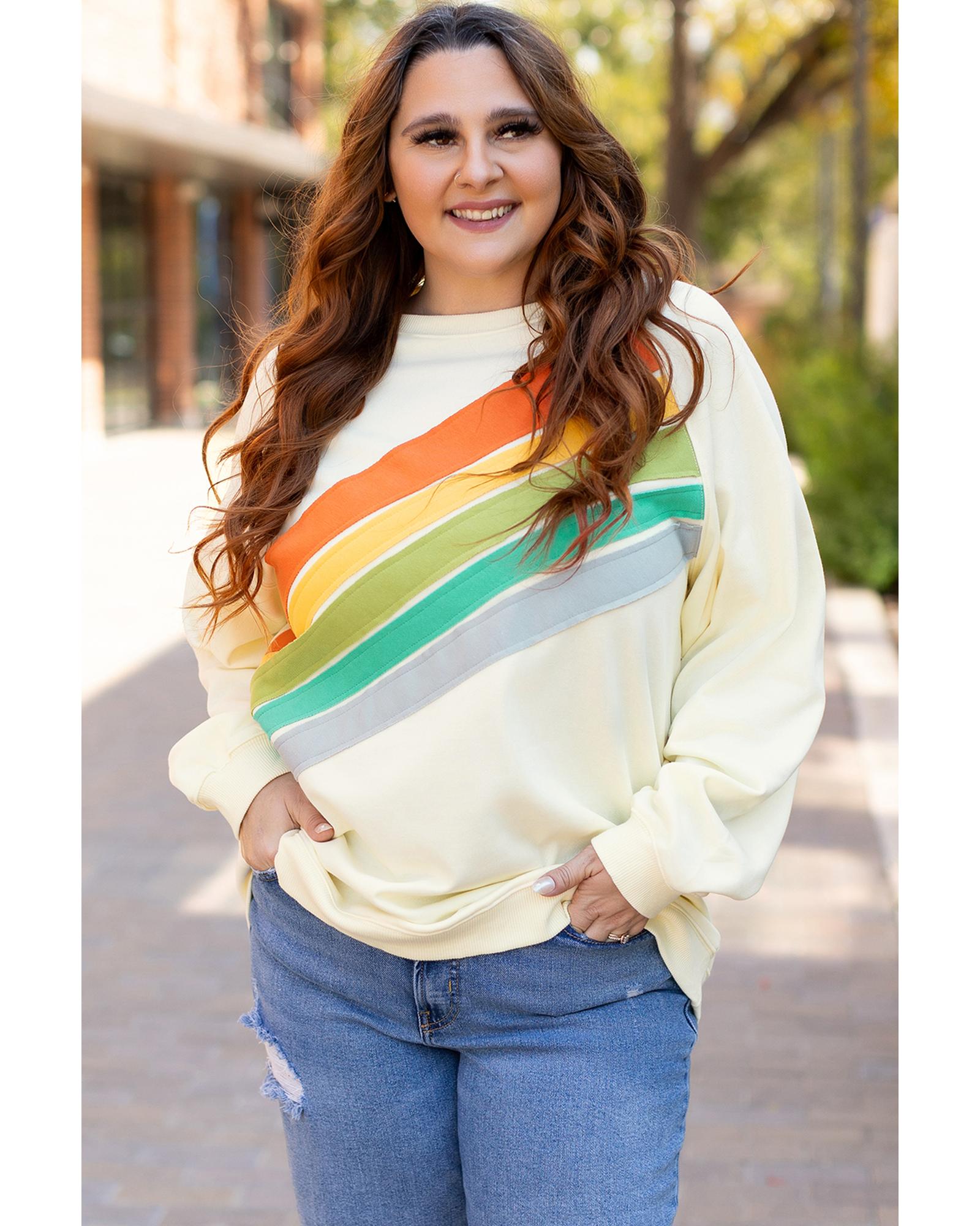 • Vibrant white Rainbow Raglan Sleeve Crew Neck Plus Size Sweatshirt with rainbow pattern