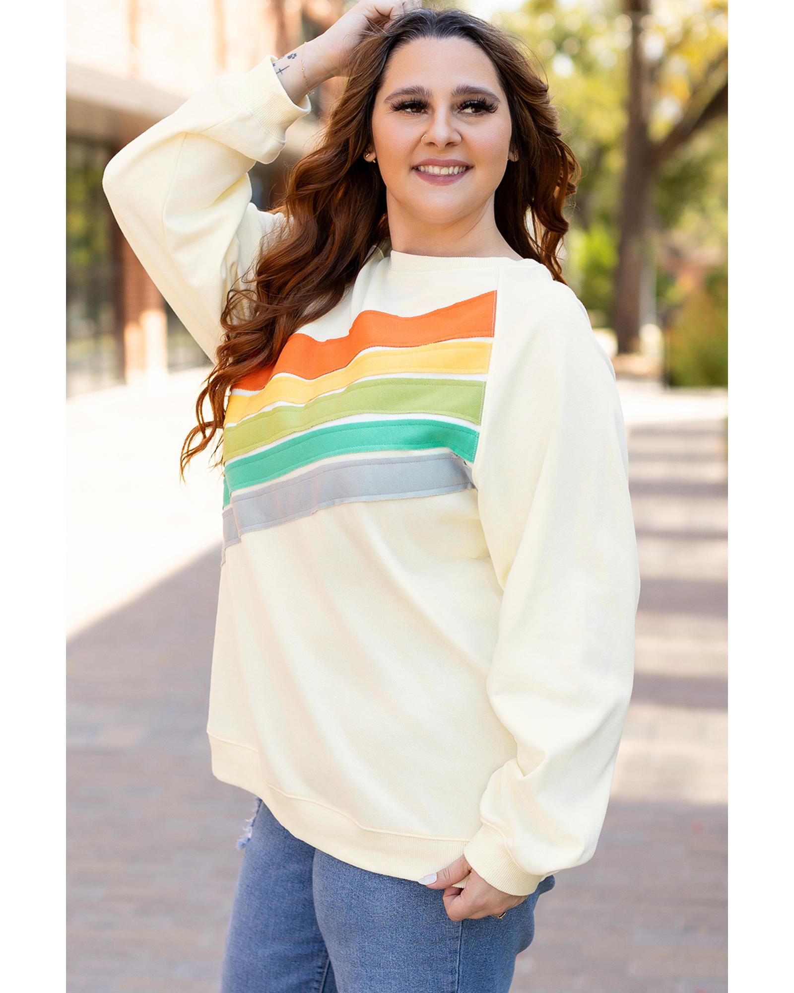 • Vibrant white Rainbow Raglan Sleeve Crew Neck Plus Size Sweatshirt with rainbow pattern