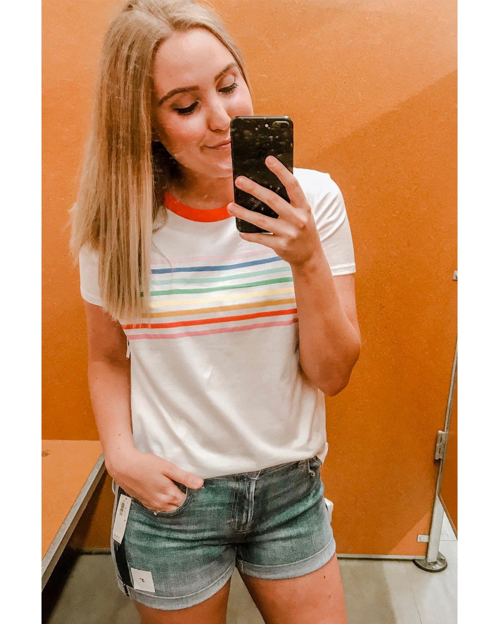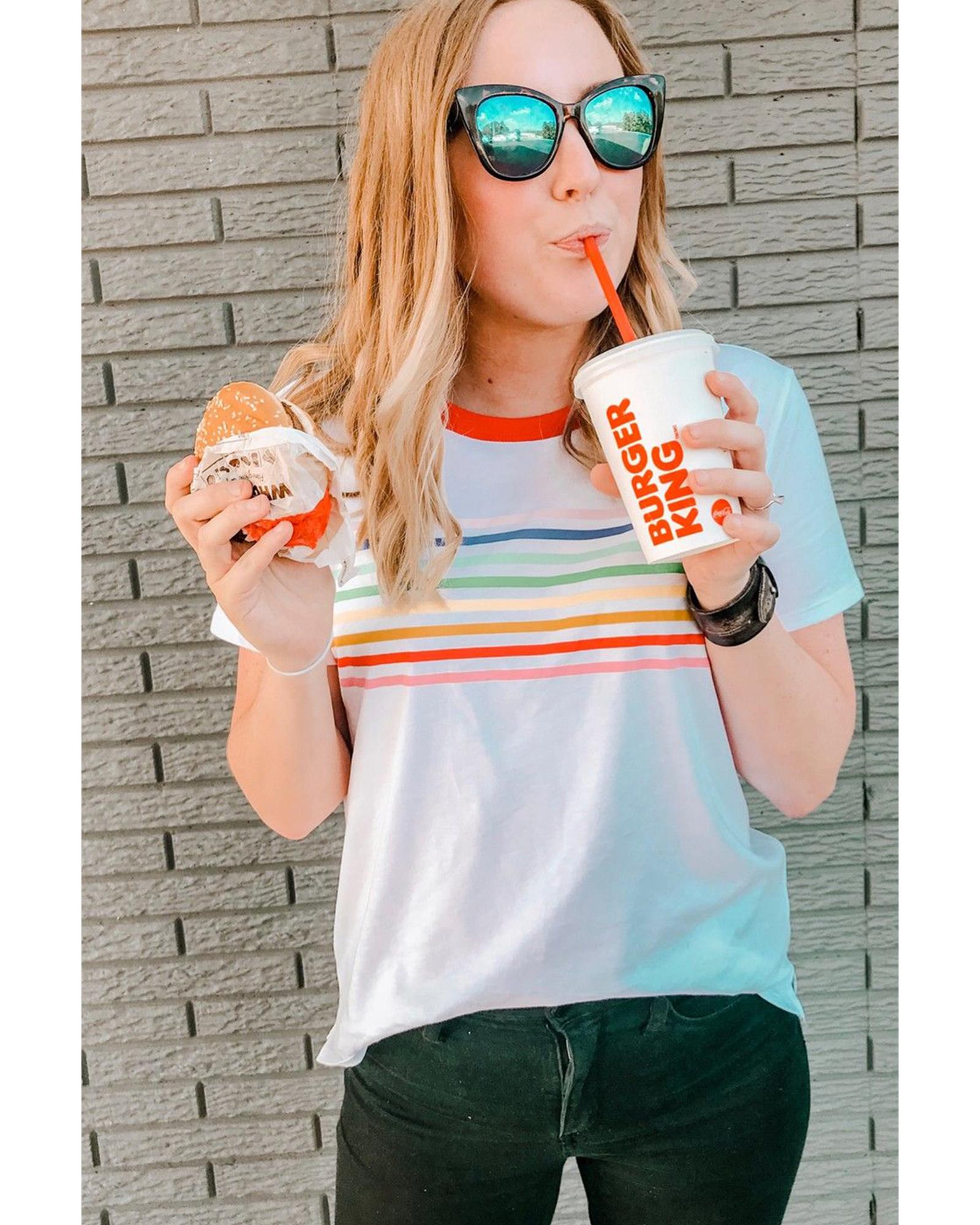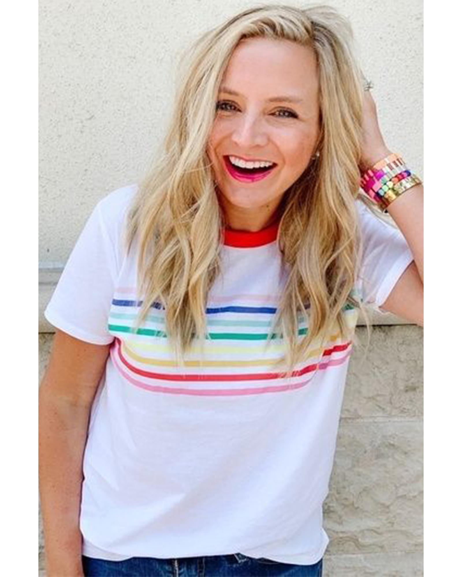 White Rainbow Stripe Print Contrast Crewneck T Shirt – M