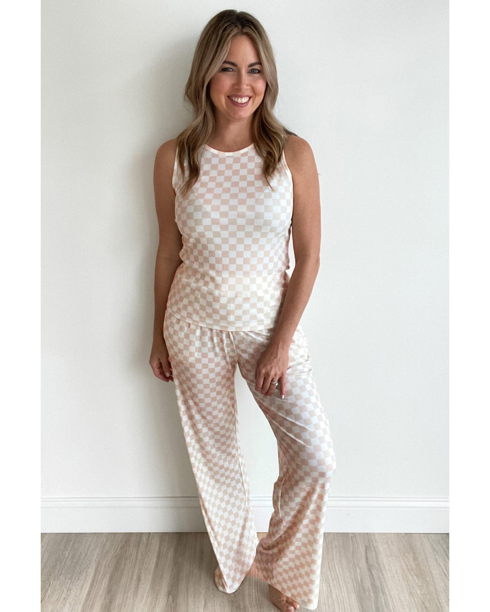 - White Ribbed Texture Checkered Print 2pcs Tank and Pants Set