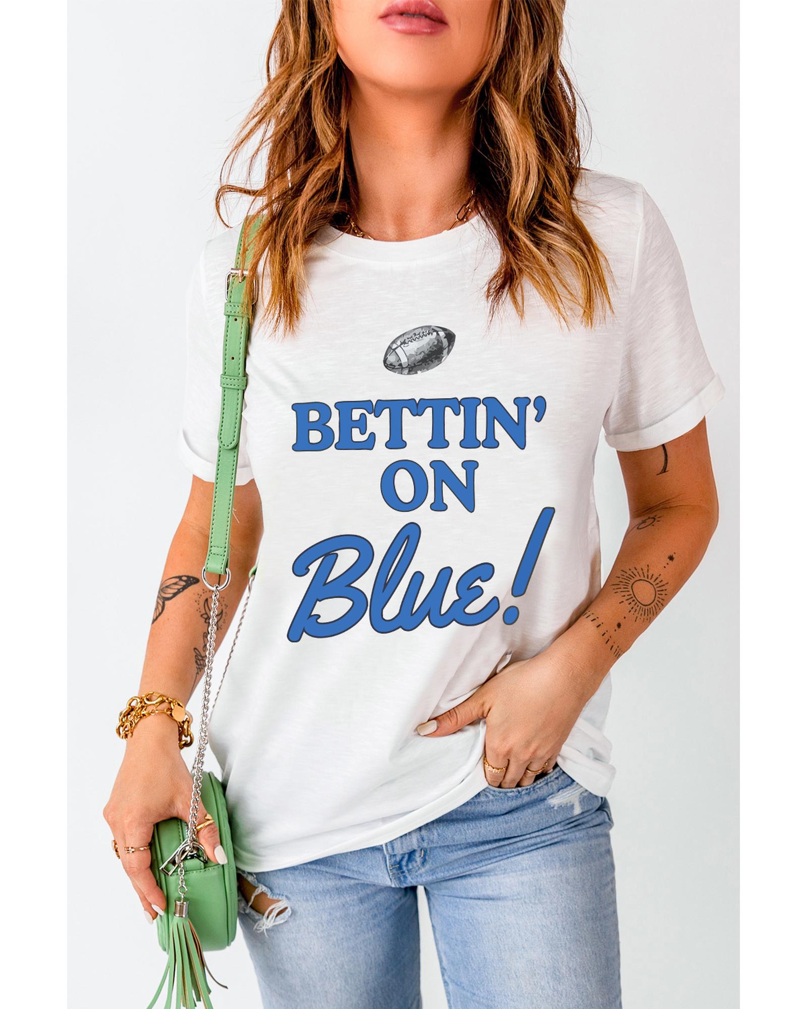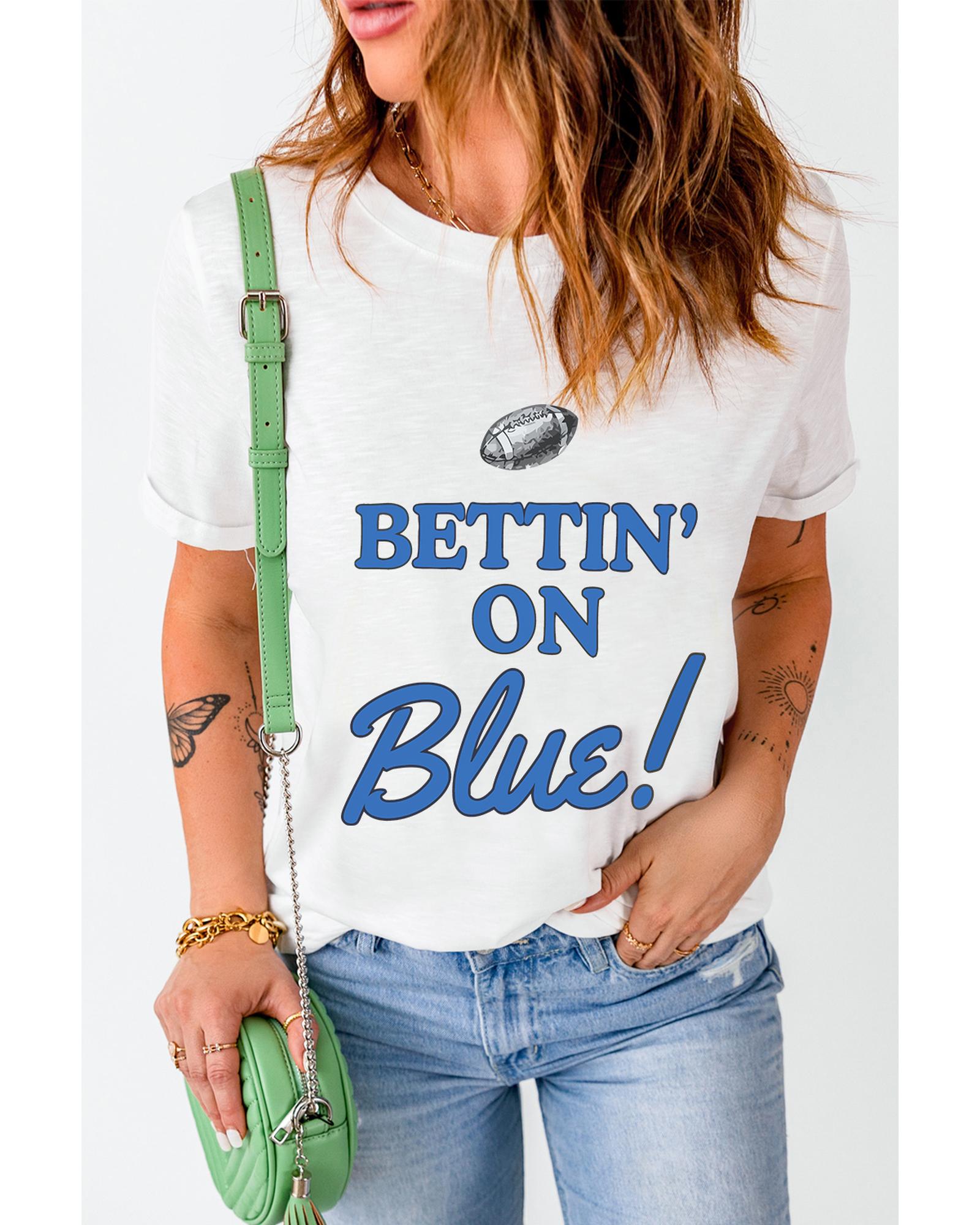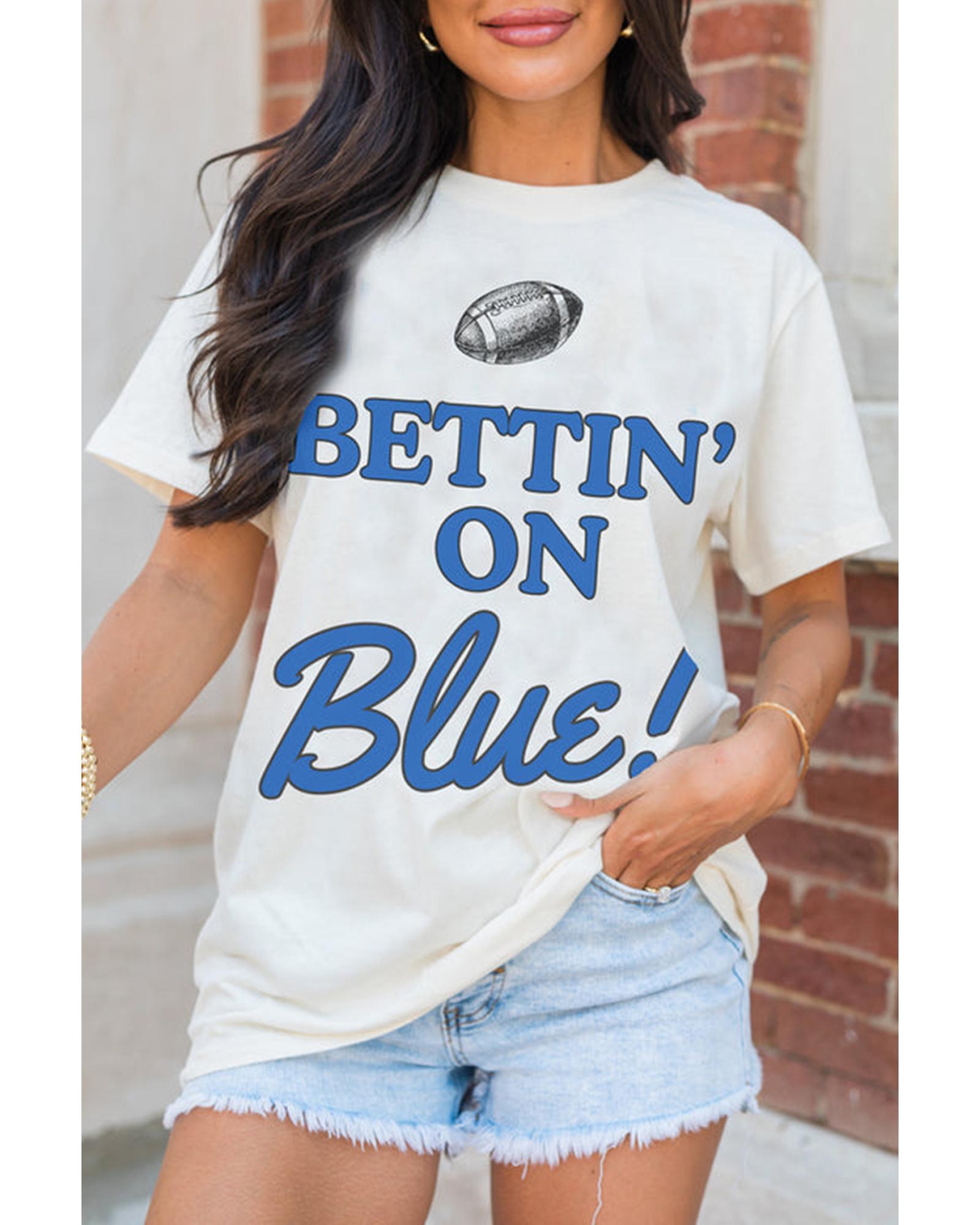 - White Rugby Football BETTIN ON Blue Graphic Crewneck T Shirt