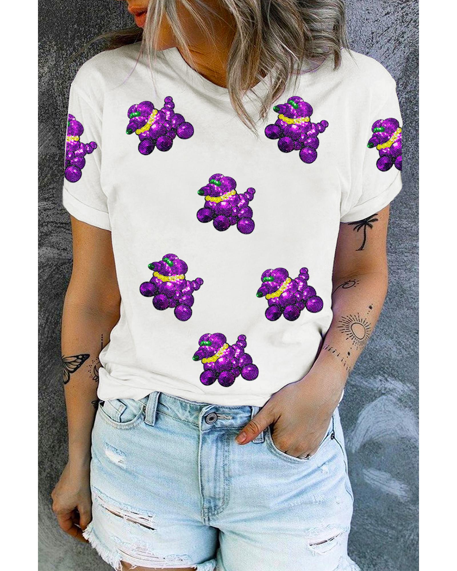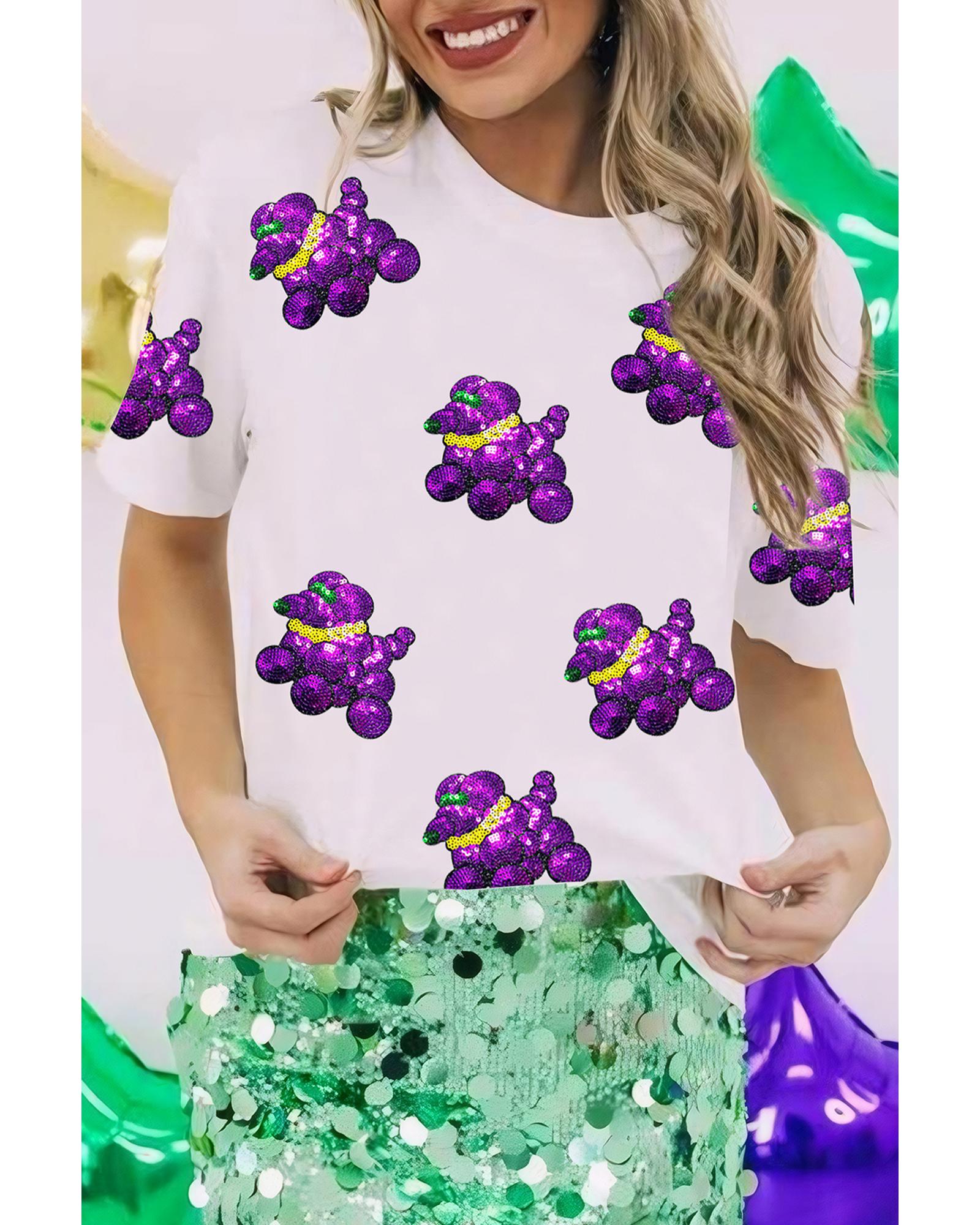 White Sequin Balloon Puppy Graphic Mardi Gras Tee – XL