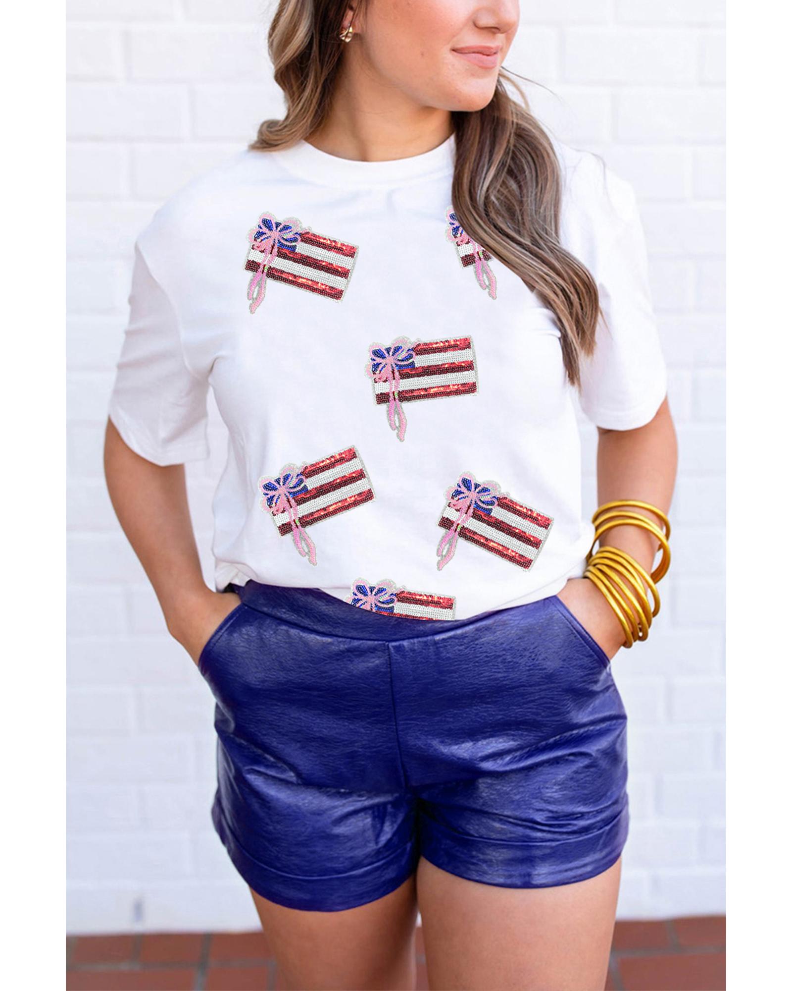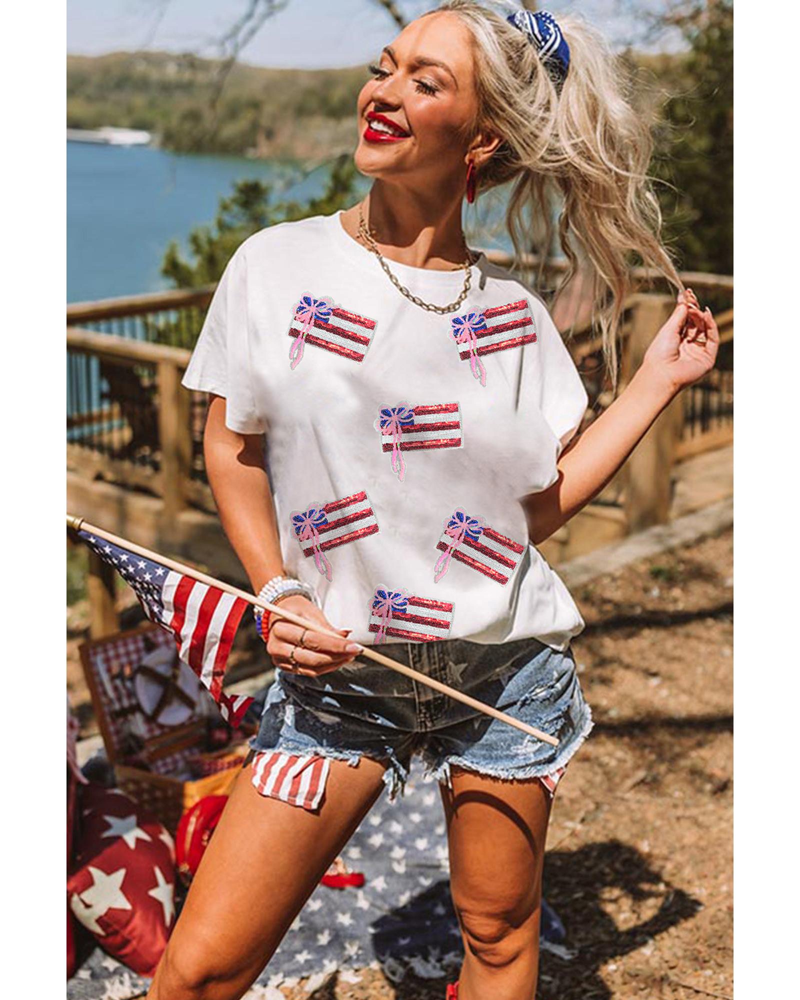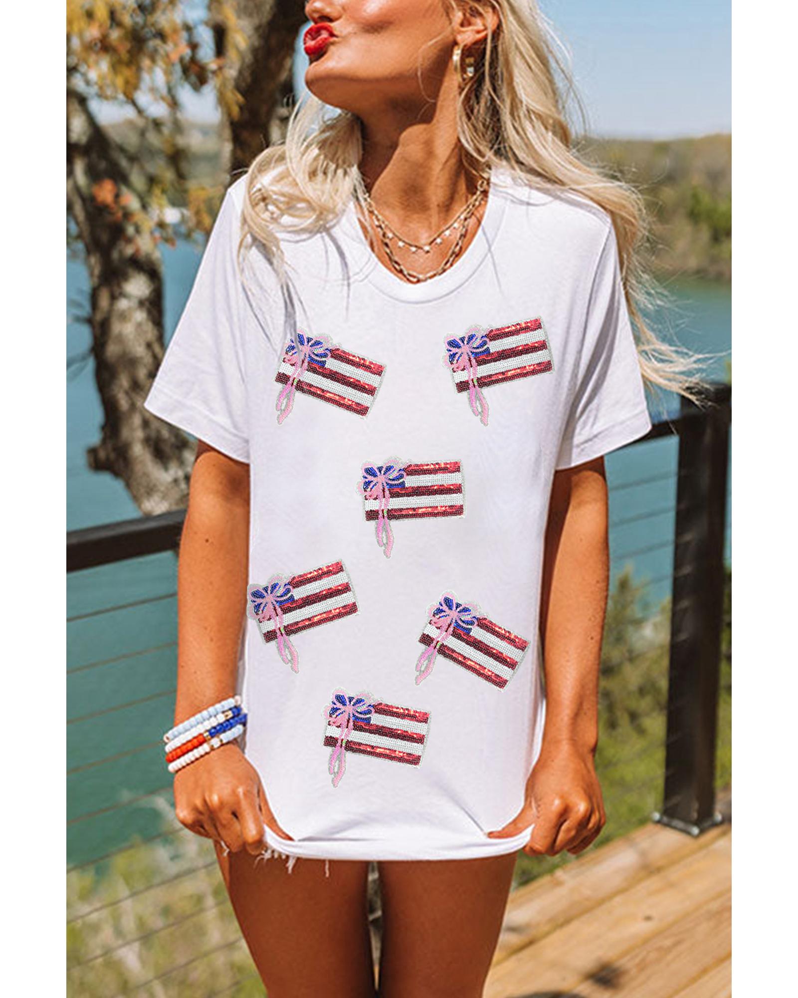 White Sequin Bow American Flag Patched T Shirt – 2XL