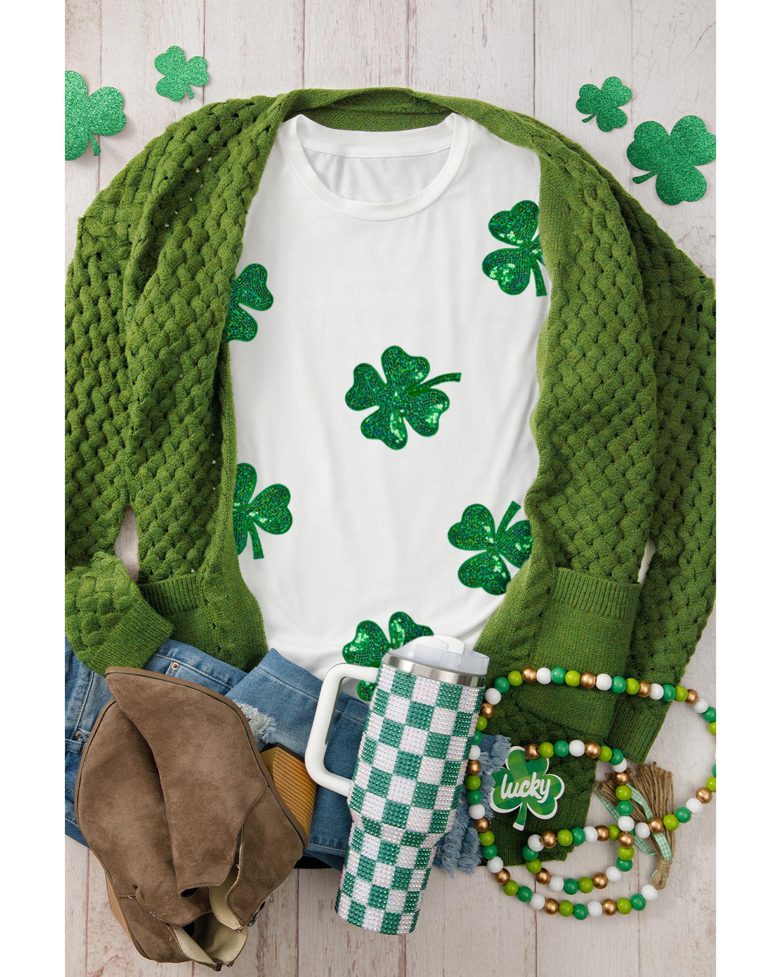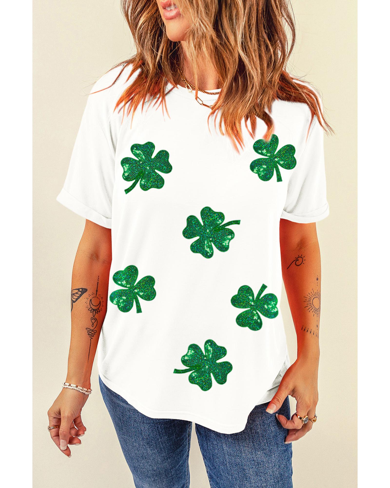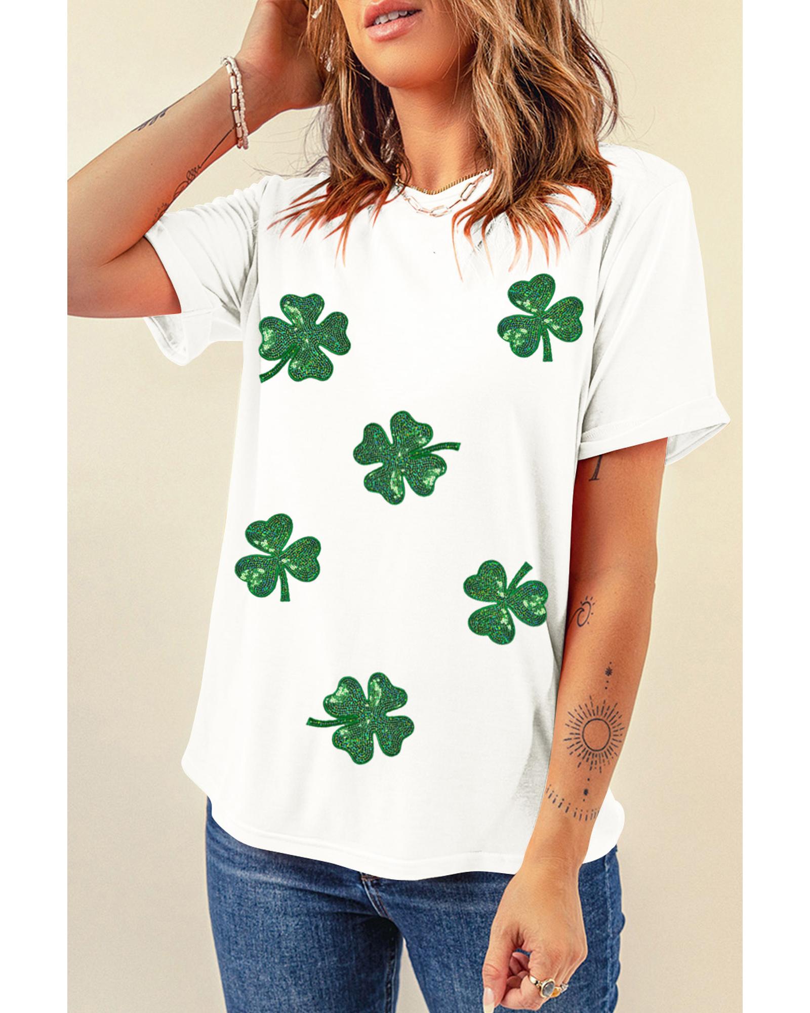 White Sequin Lucky Clover Graphic Crewneck Tee – 2XL