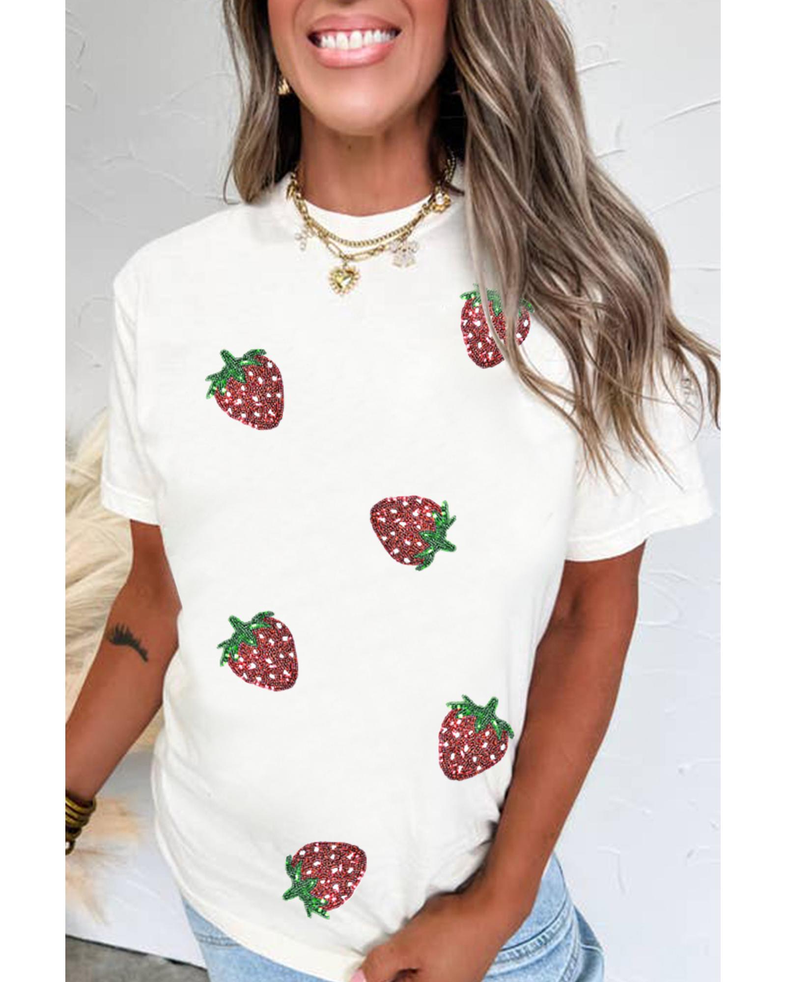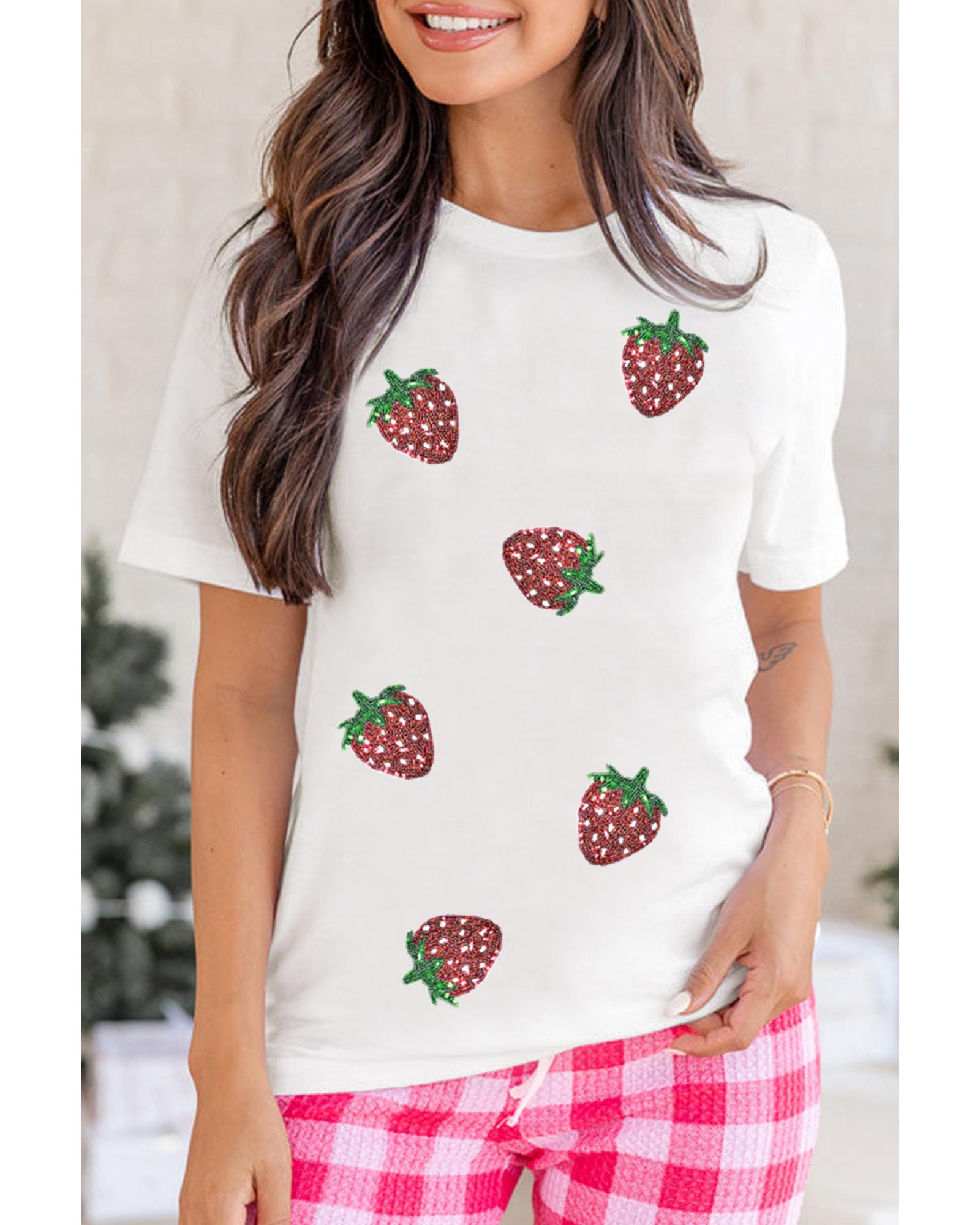 White Sequin Strawberry Patched Crew Neck T Shirt – 3XL