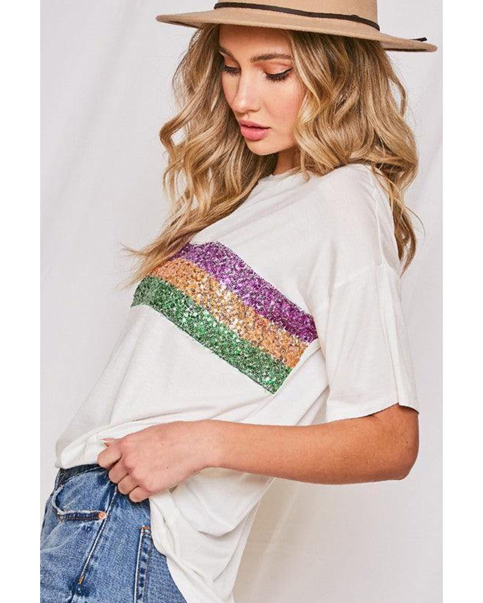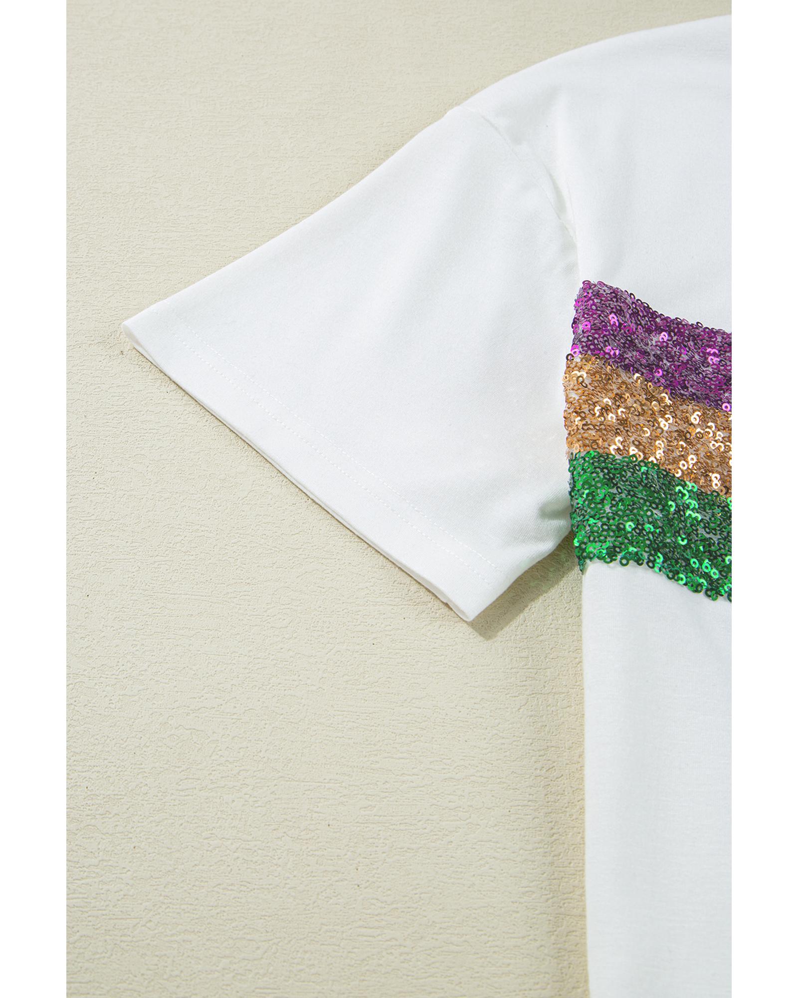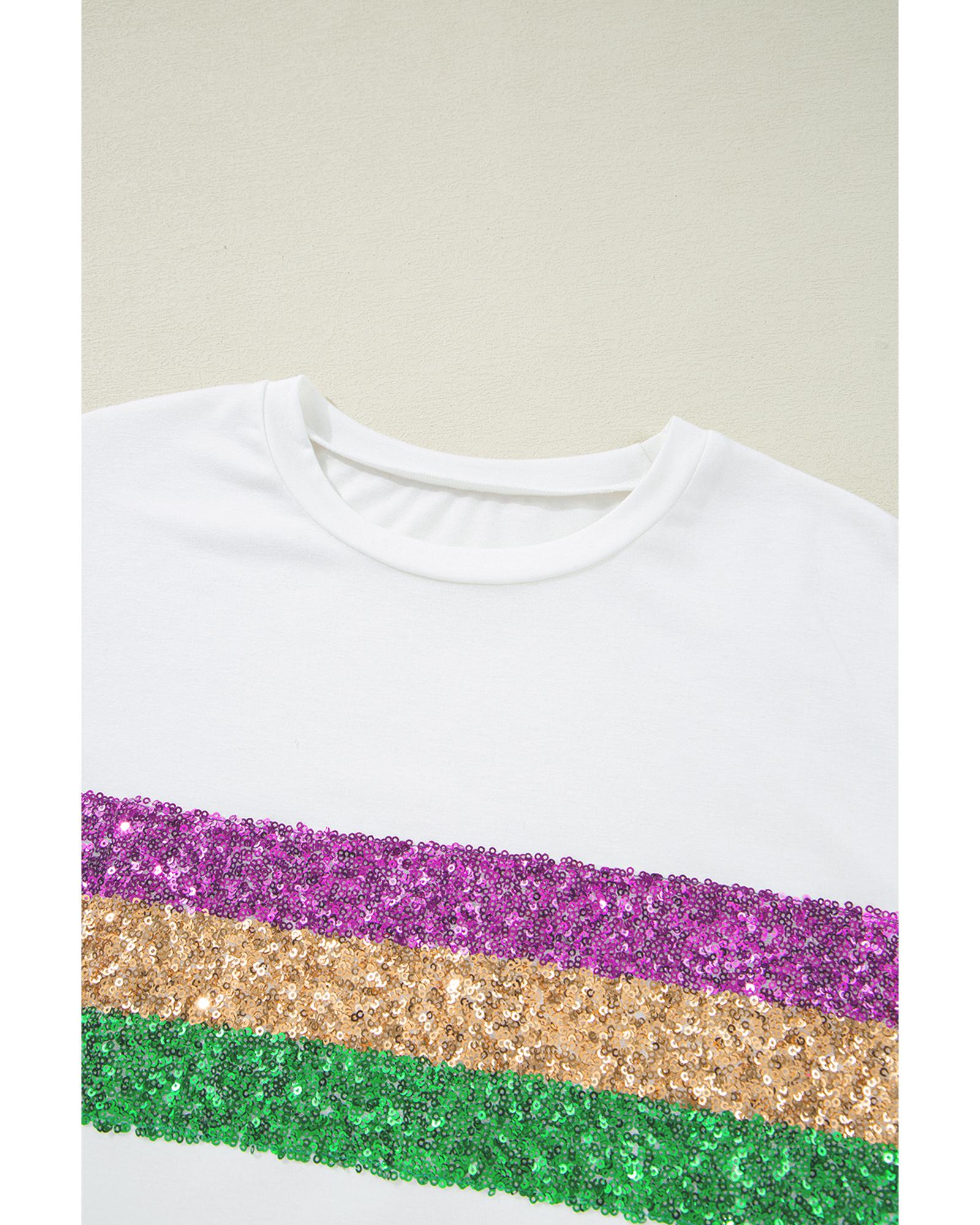 White Sequin Stripes Patchwork Mardi Gras Crew Neck T Shirt – S