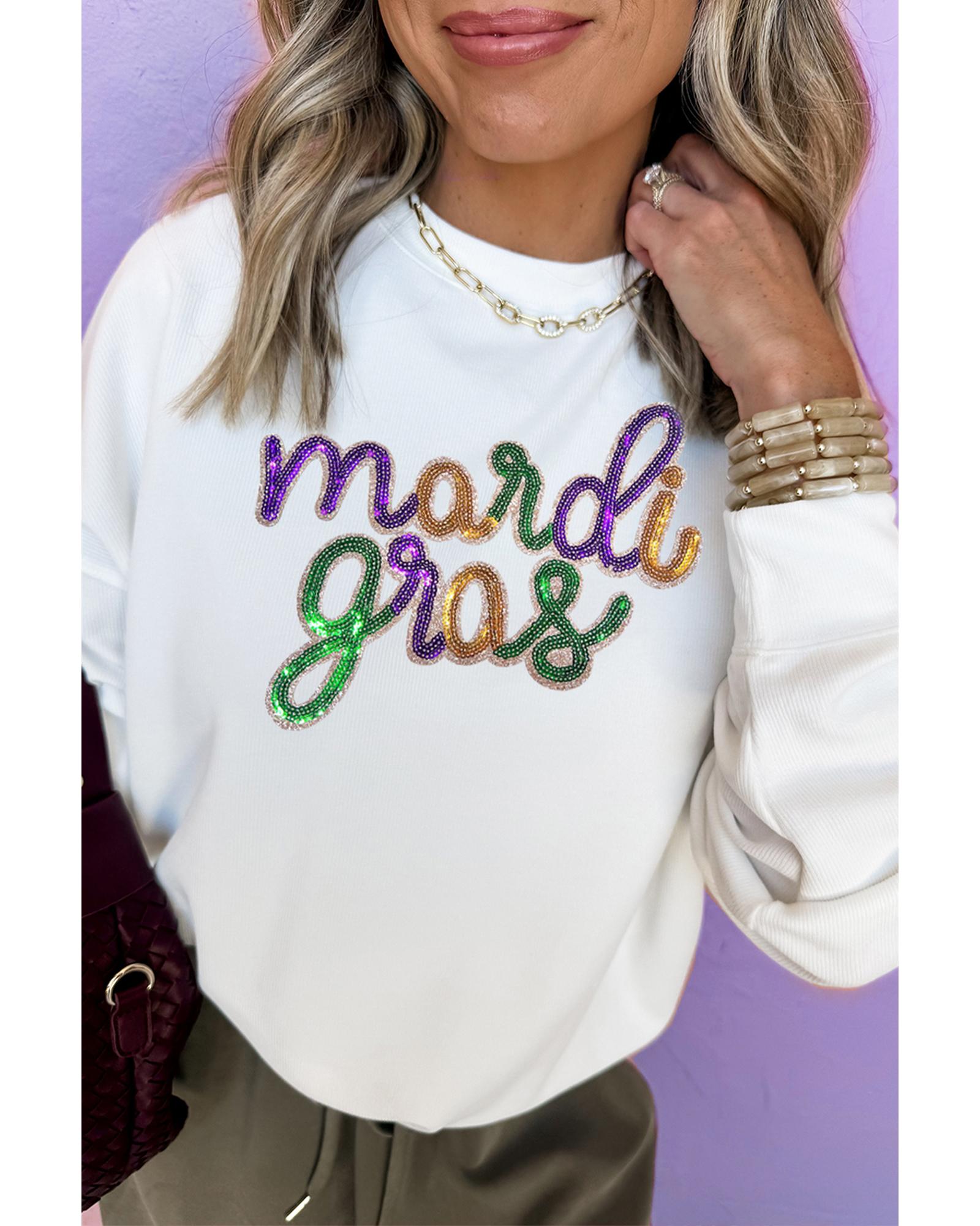 - White sequined Mardi Gras graphic crew neck drop shoulder sweatshirt