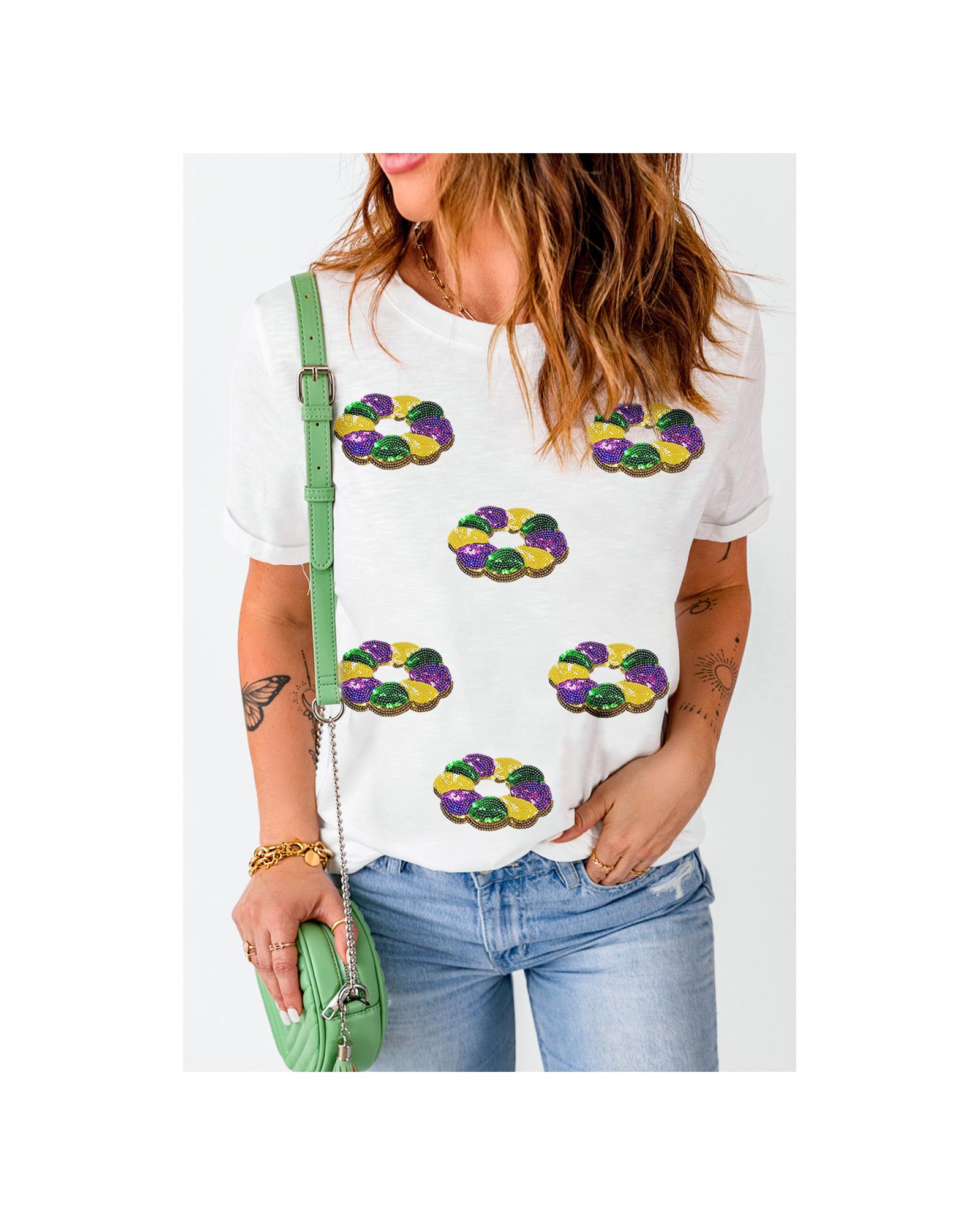 White Sequined Mardi Gras Pattern Crew Neck Short Sleeve Top – 3XL