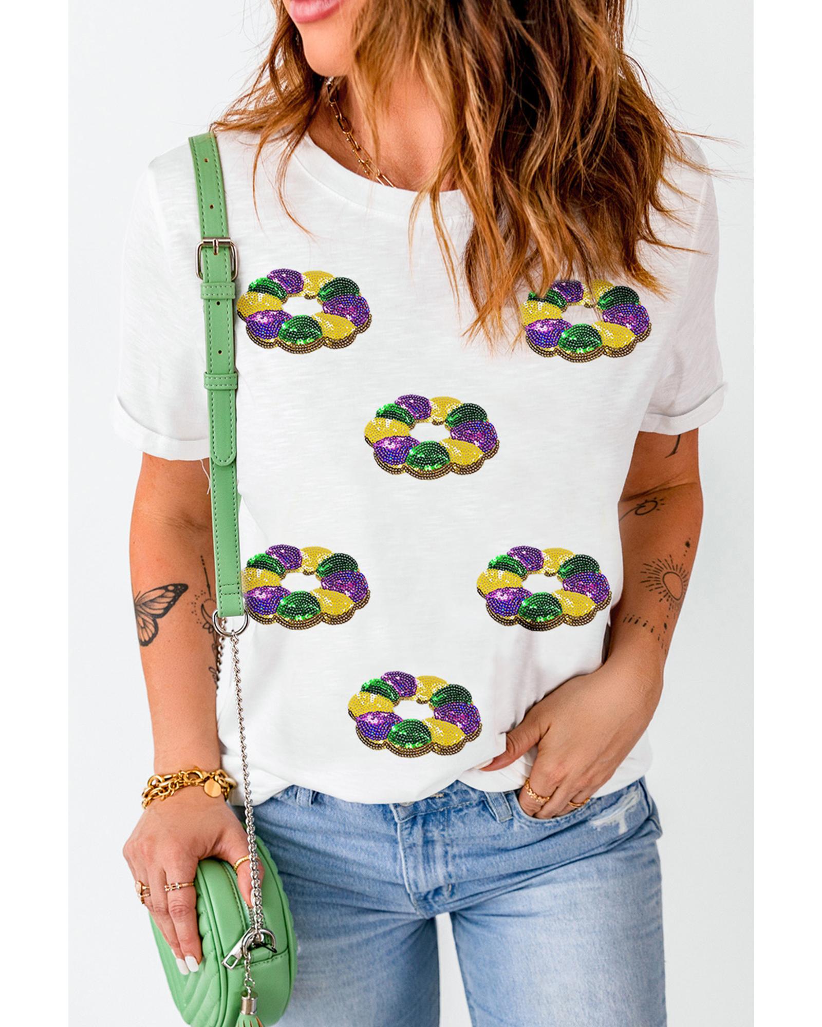 White Sequined Mardi Gras Pattern Crew Neck Short Sleeve Top – M