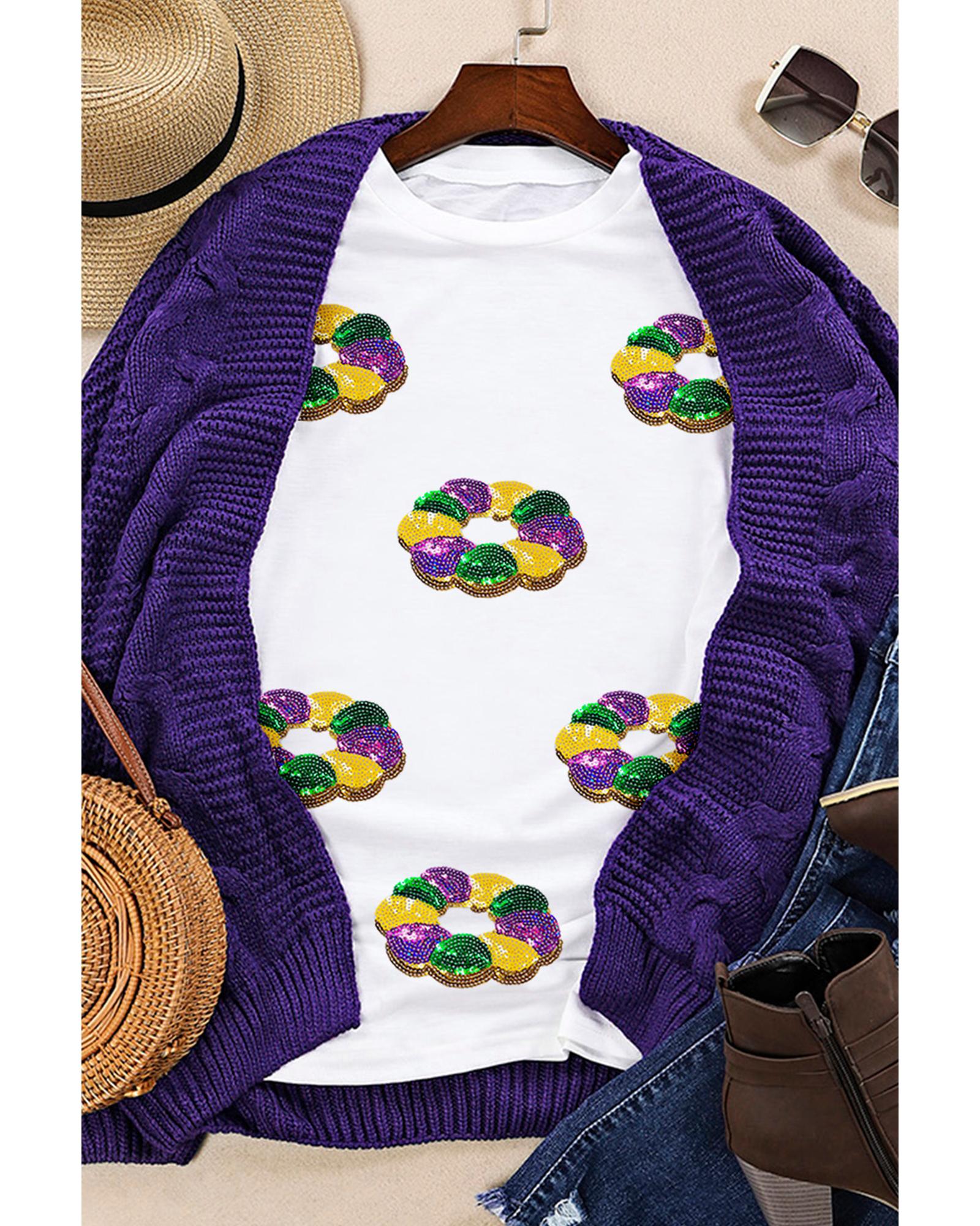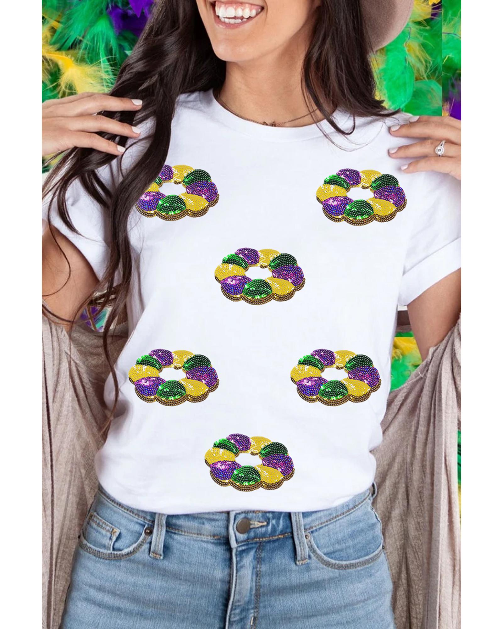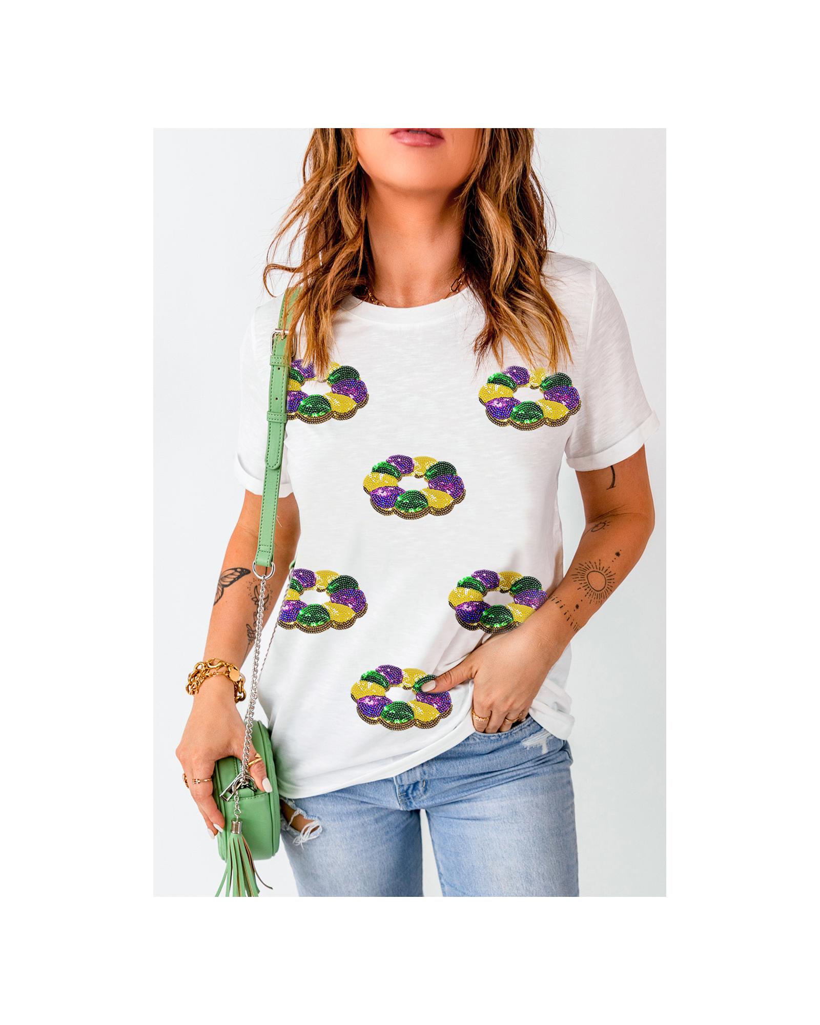 White Sequined Mardi Gras Pattern Crew Neck Short Sleeve Top – XL