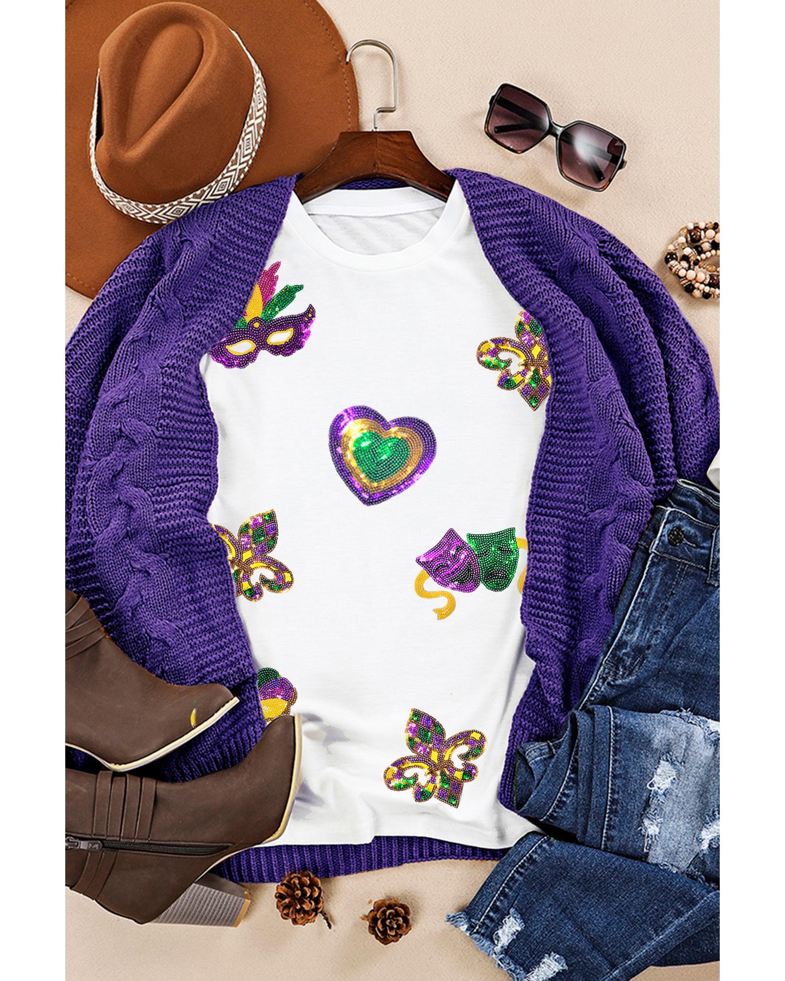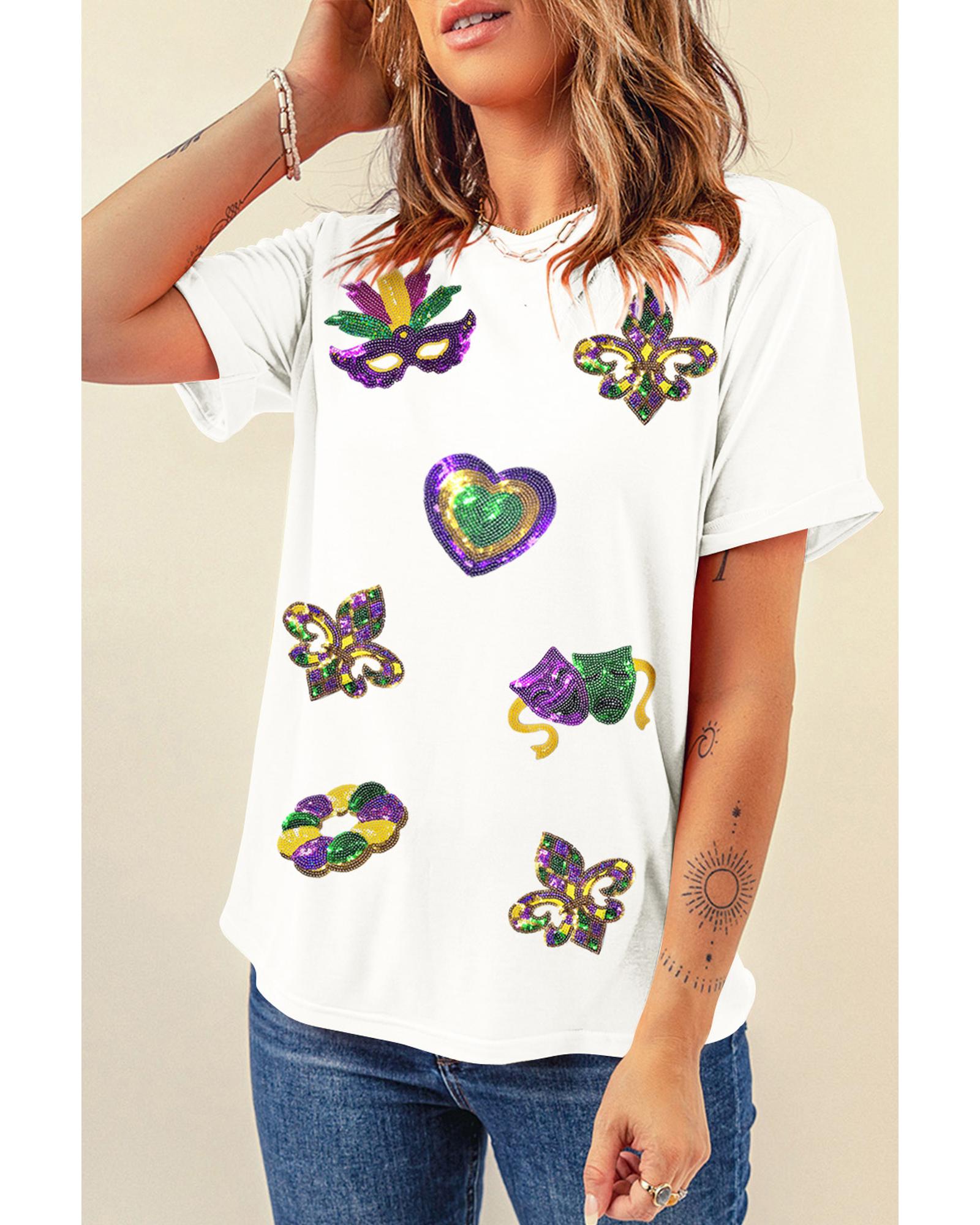 - White Sequined Mardi Gras Symbolic Pattern Casual Tee