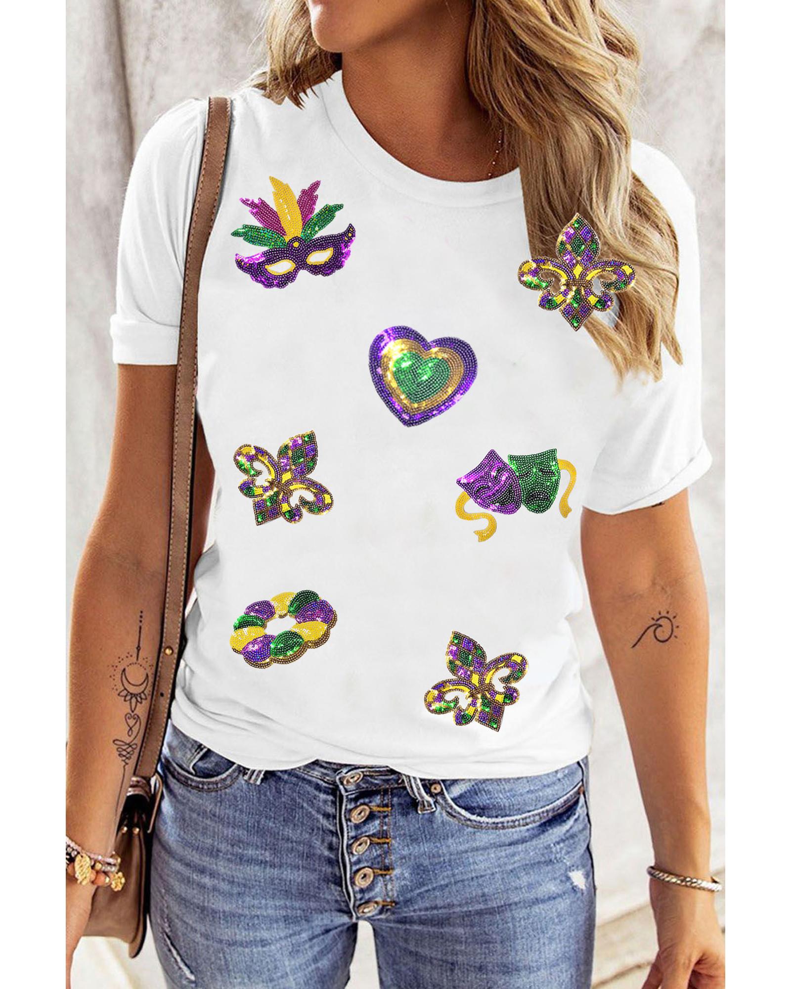 • White Sequined Mardi Gras Symbolic Pattern Casual Tee