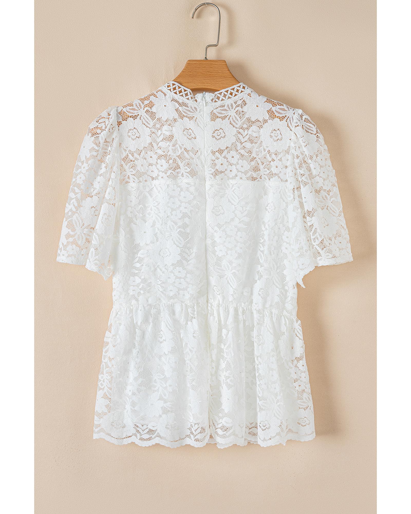 White Short Sleeve Scalloped Floral Lace Peplum Blouse – S