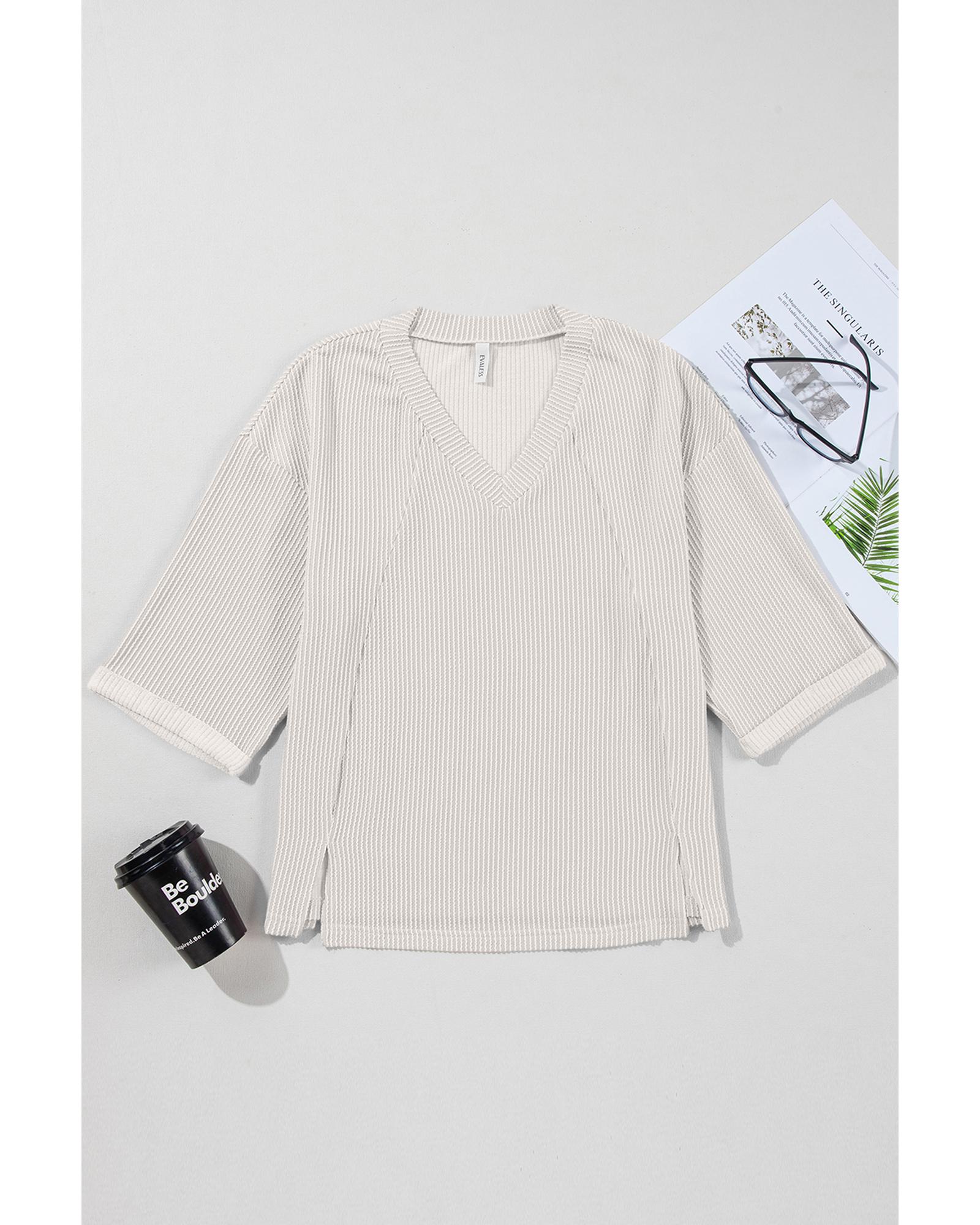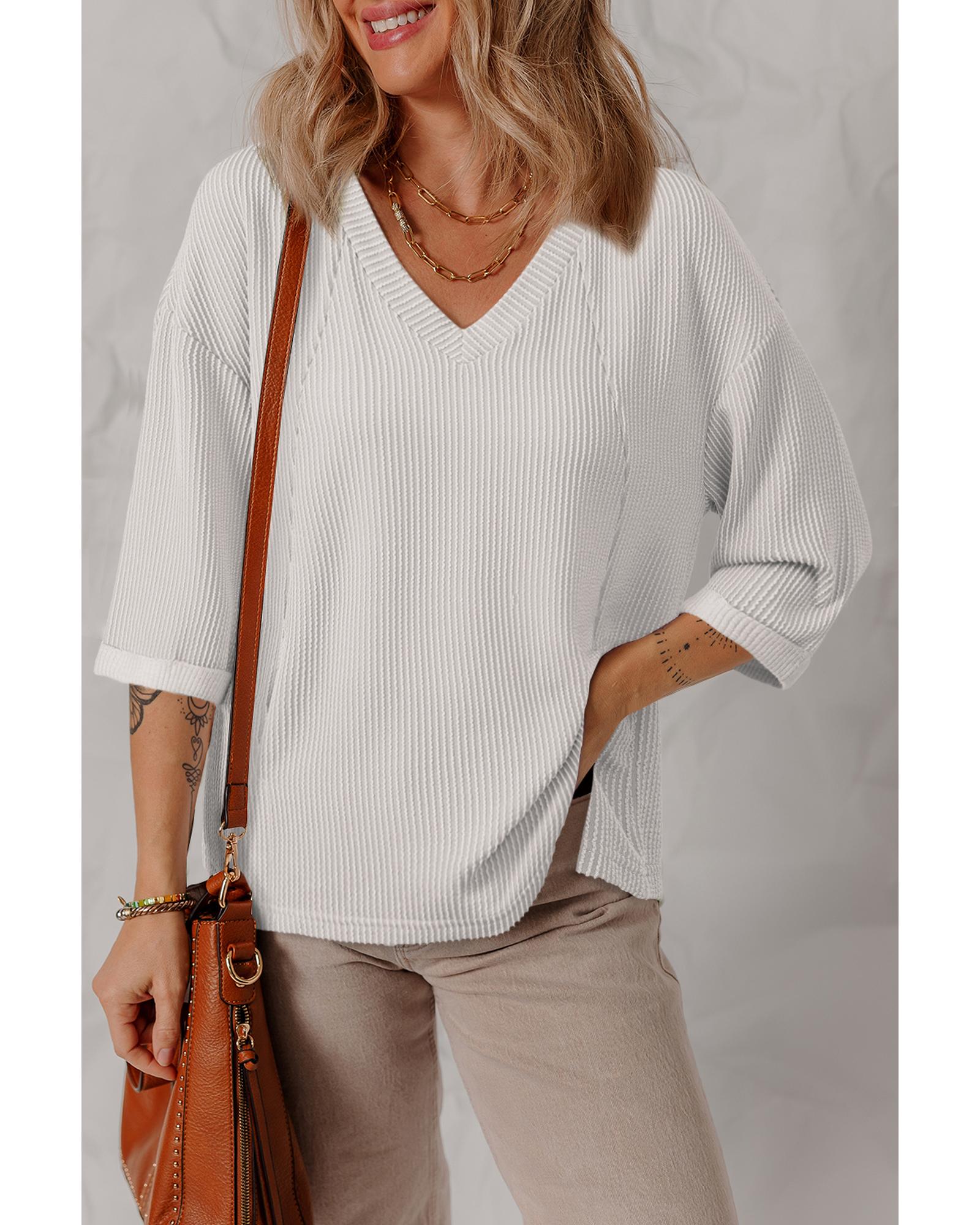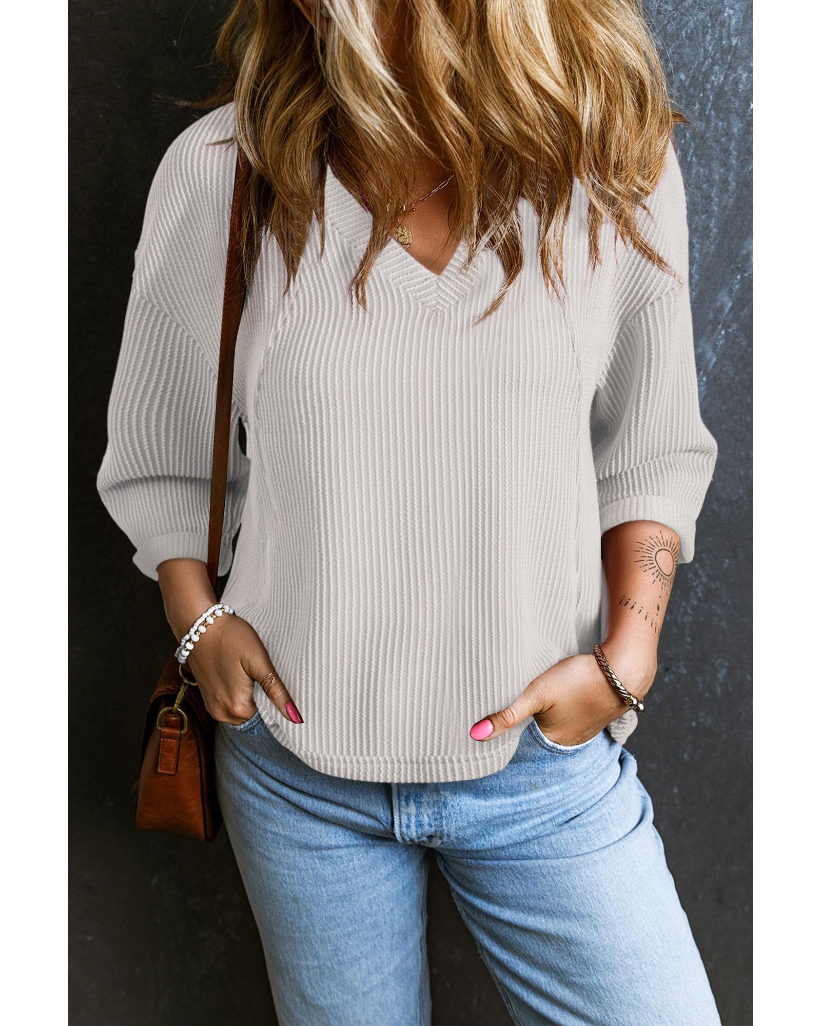 White Solid Color Corded Drop Shoulder 3/4 Sleeve V Neck Top – 2XL