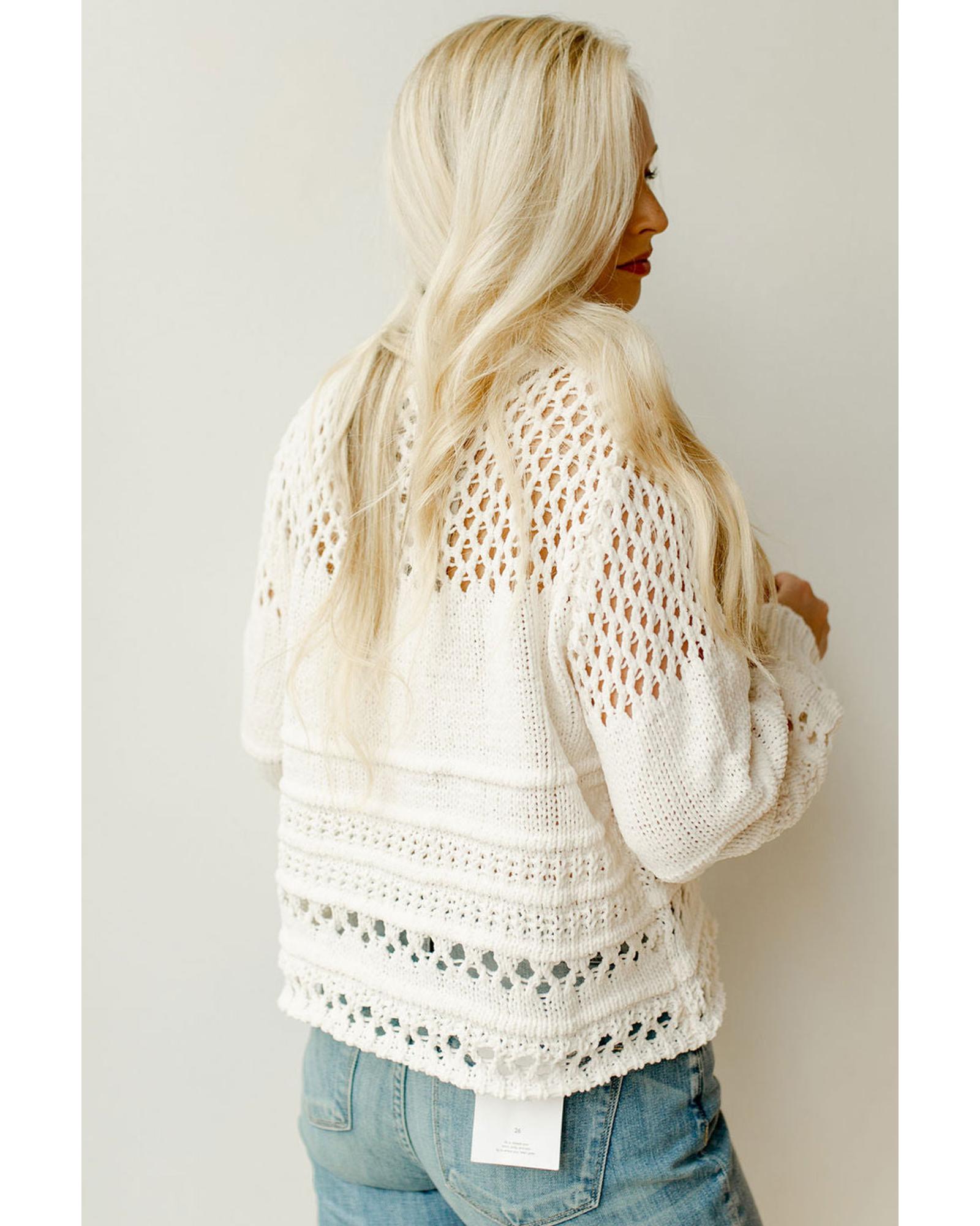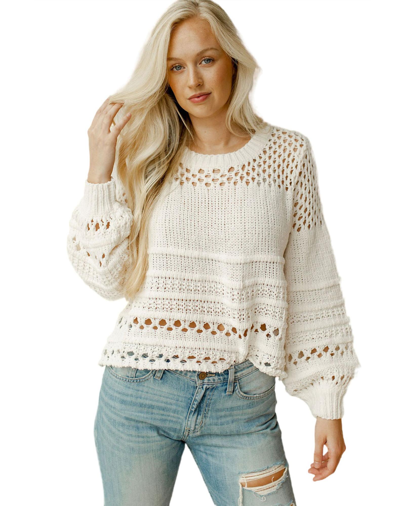 White Solid Color Pointelle Knit Puff Sleeve Sweater – M