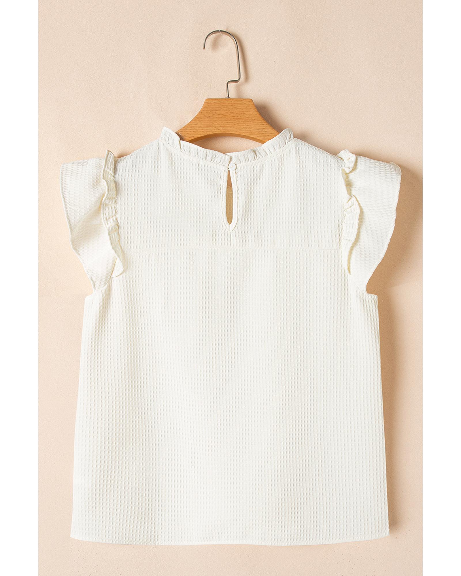 White Solid Color Ruffle Trim Waffle Knit Blouse – L
