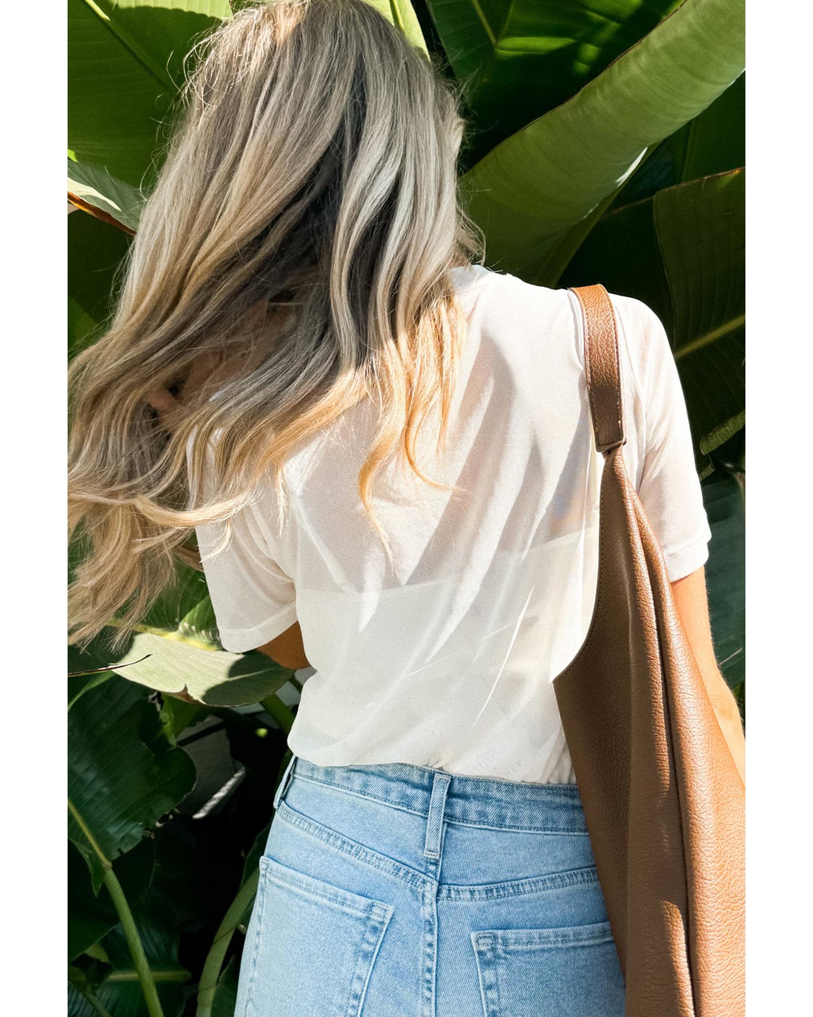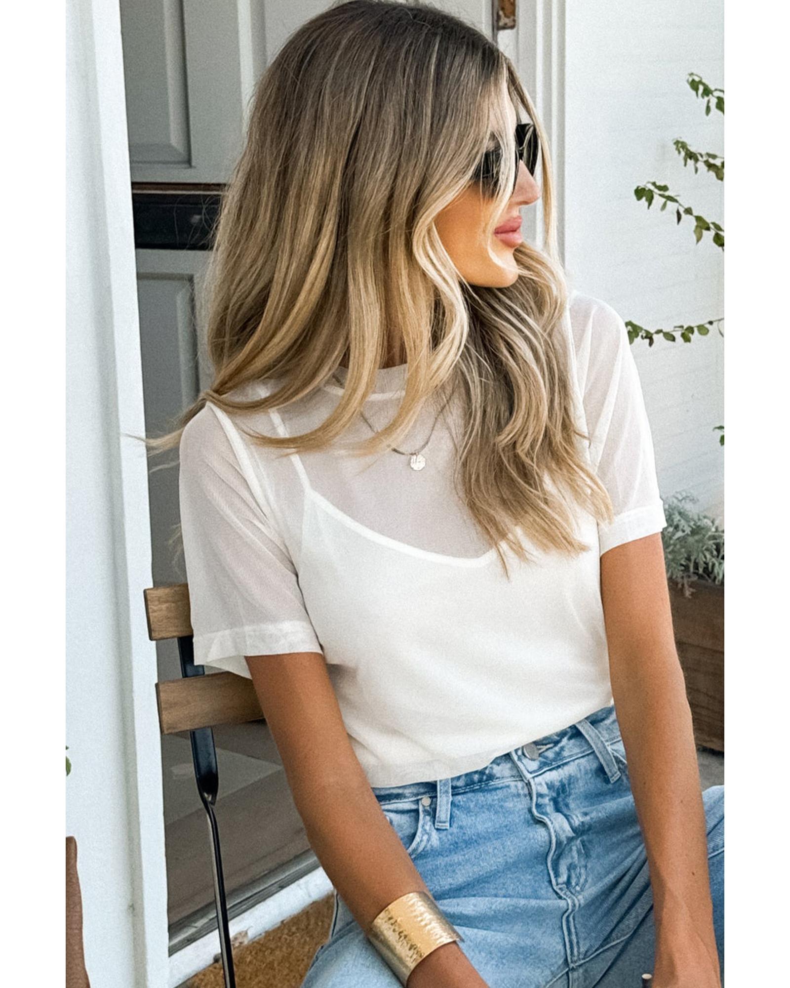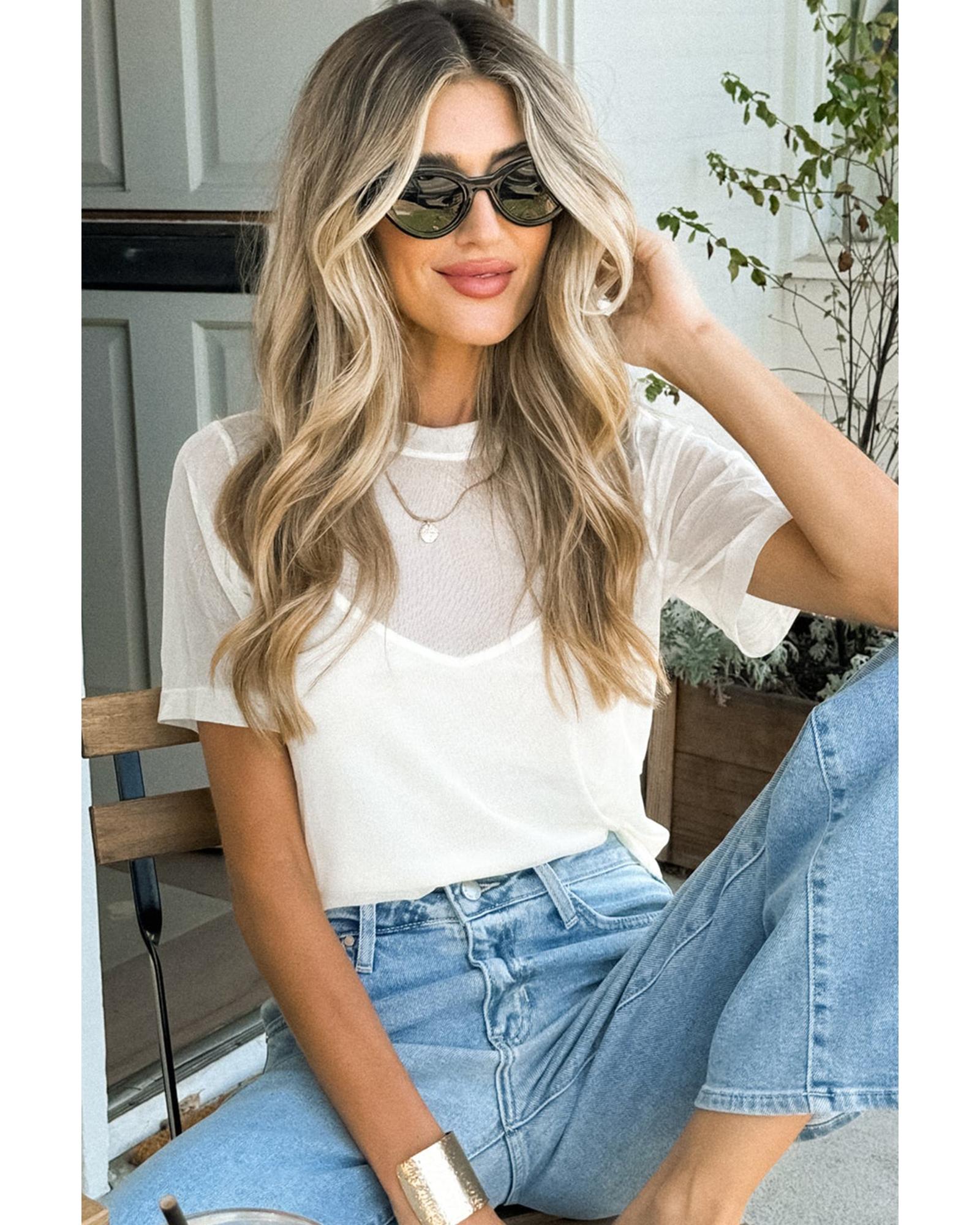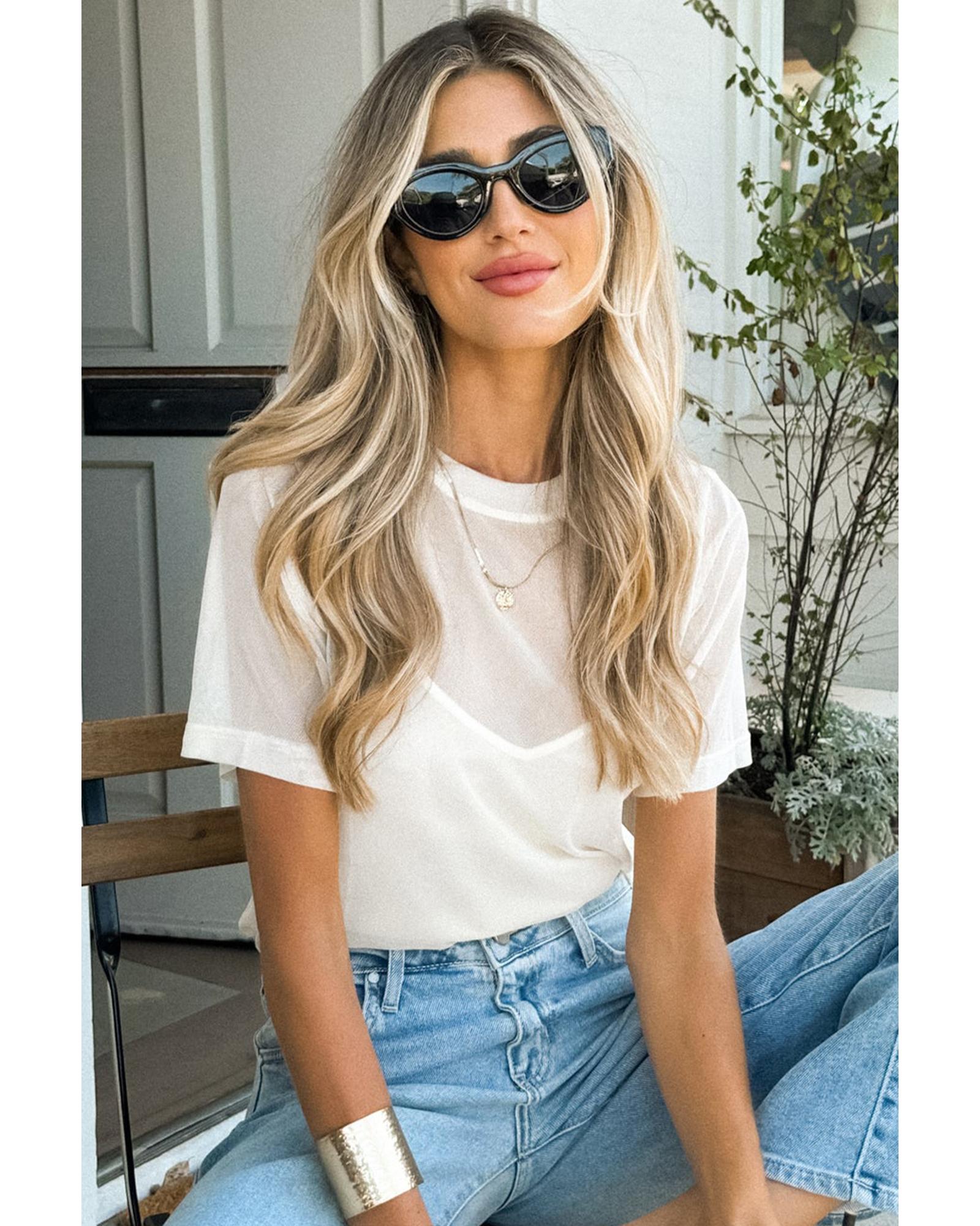 White Solid Color Sheer Mesh Patchwork Short Sleeve Top – L