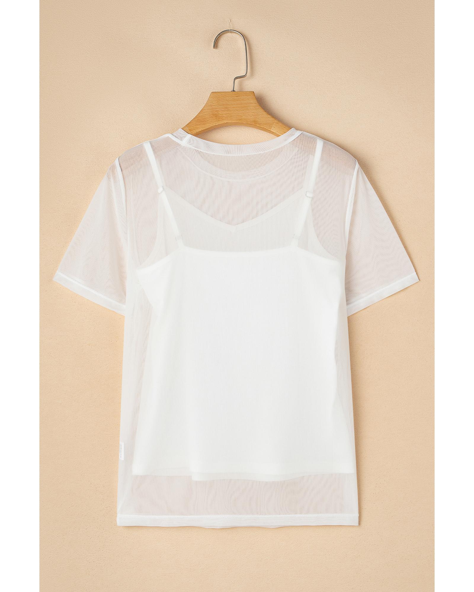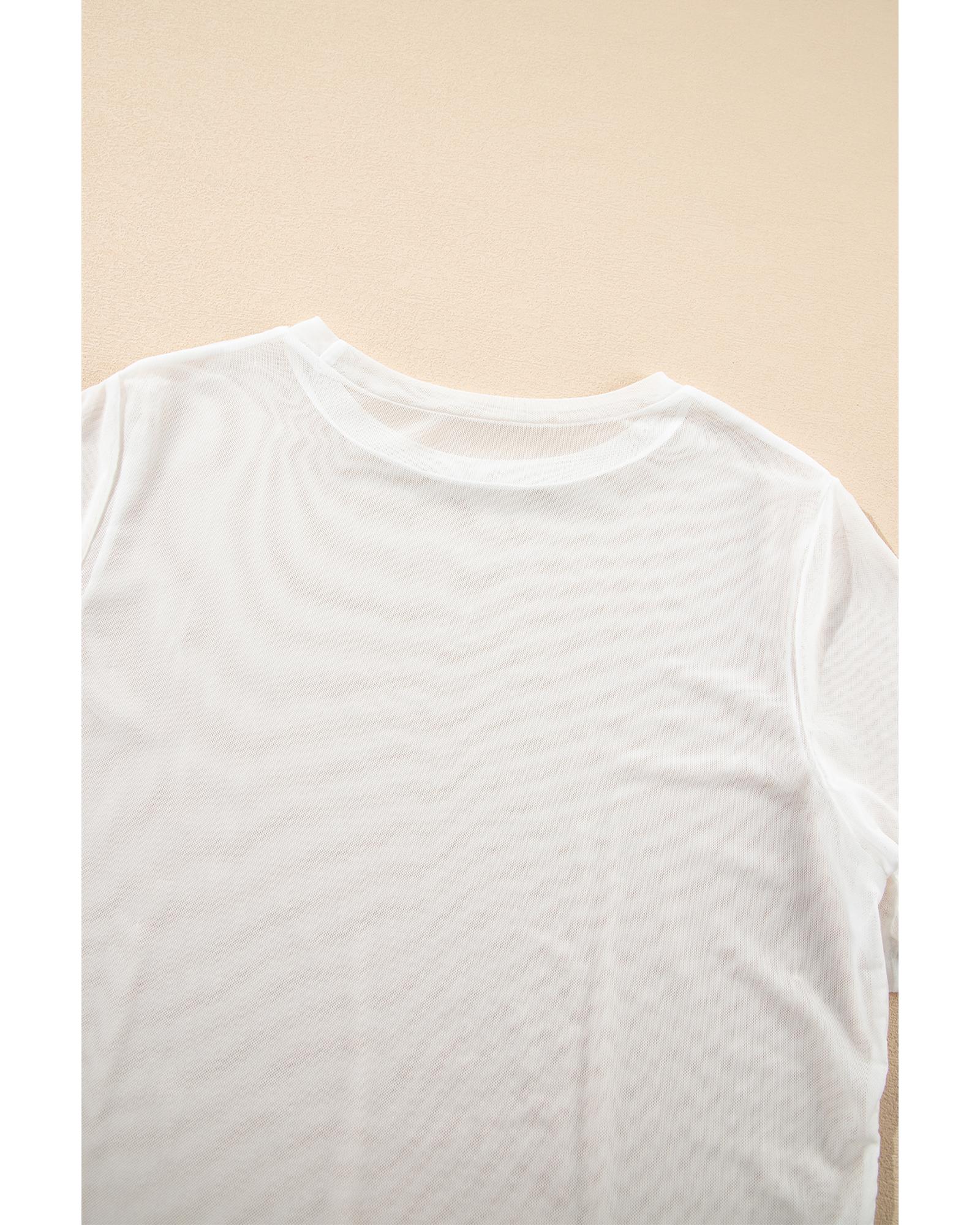 White Solid Color Sheer Mesh Patchwork Short Sleeve Top – S