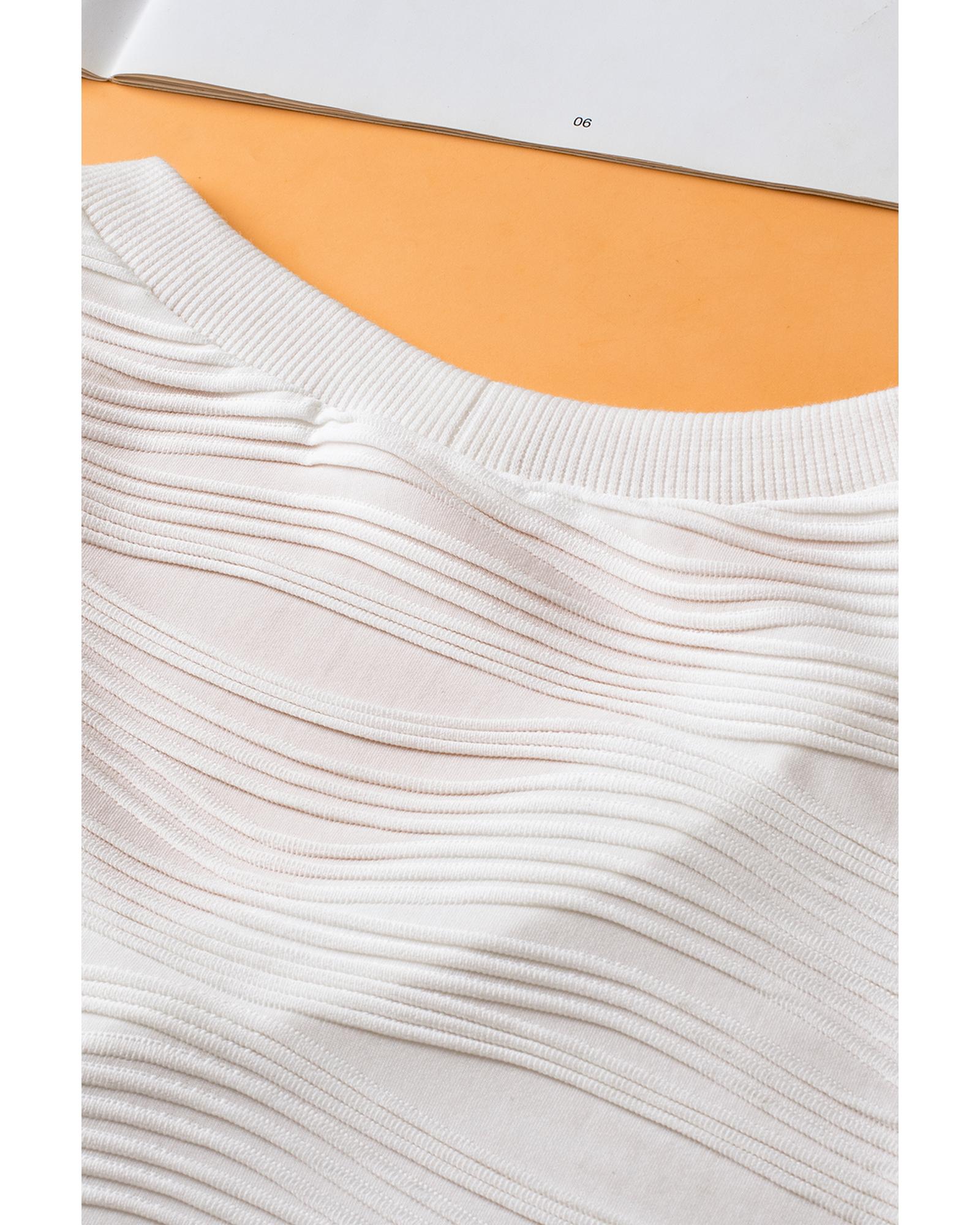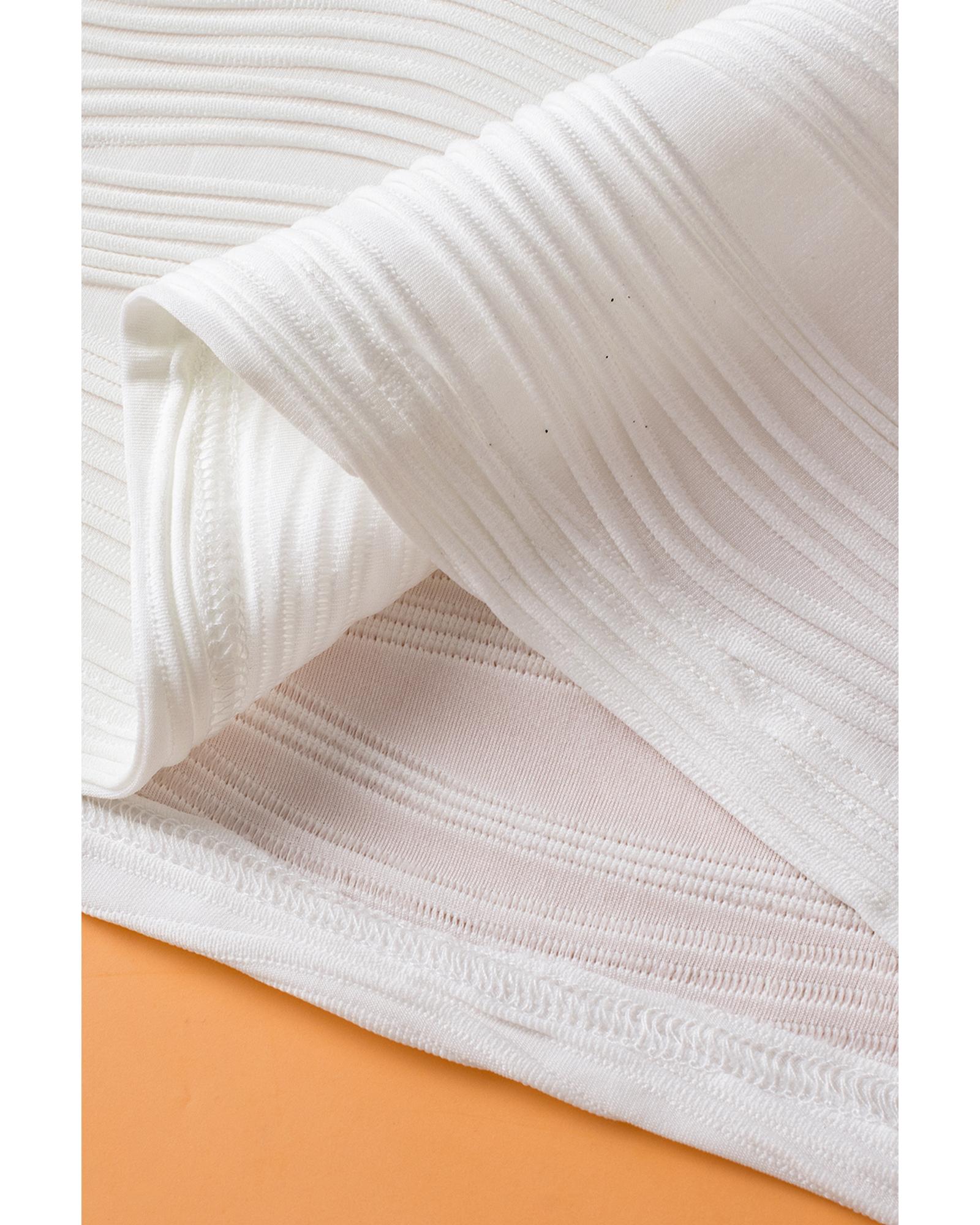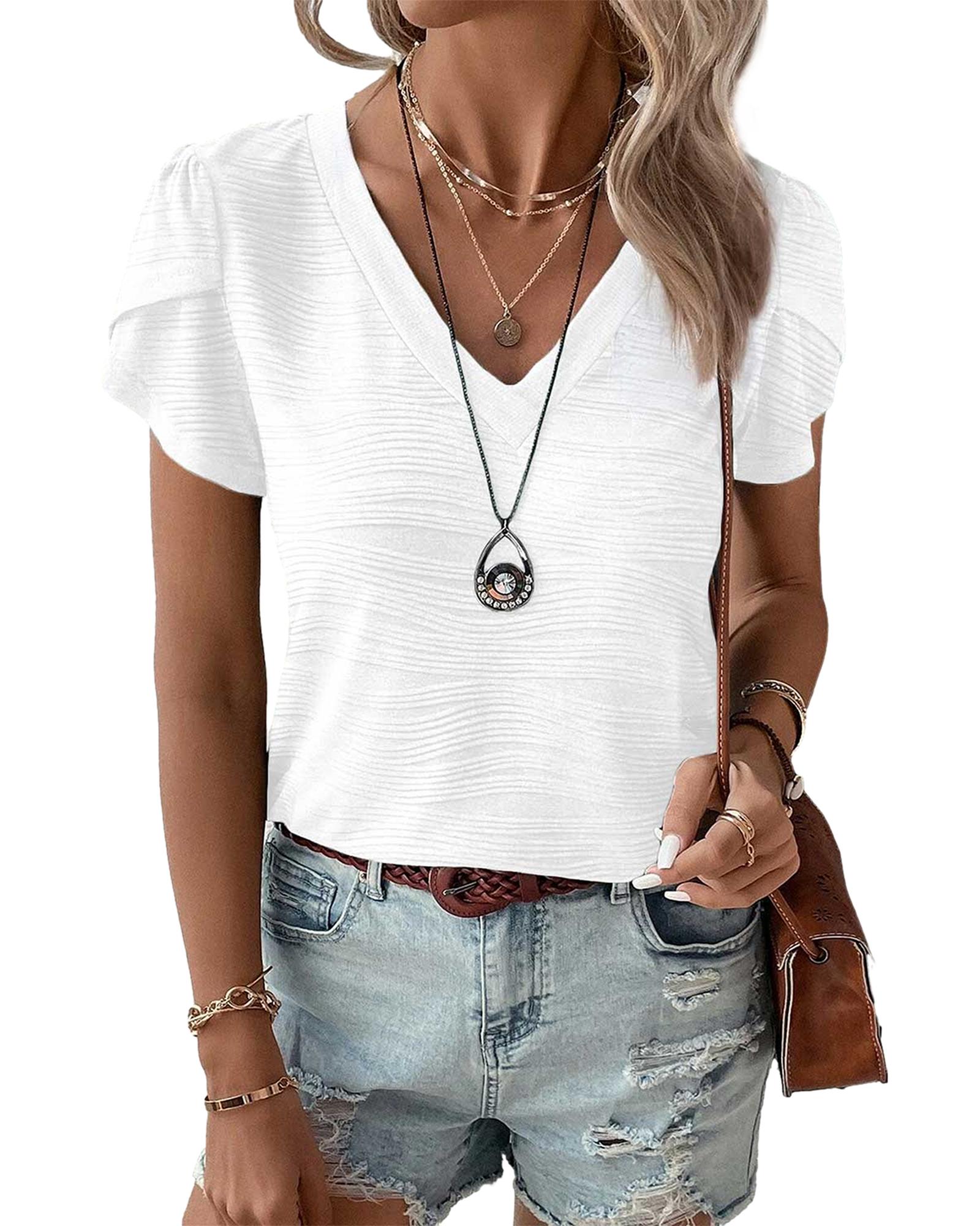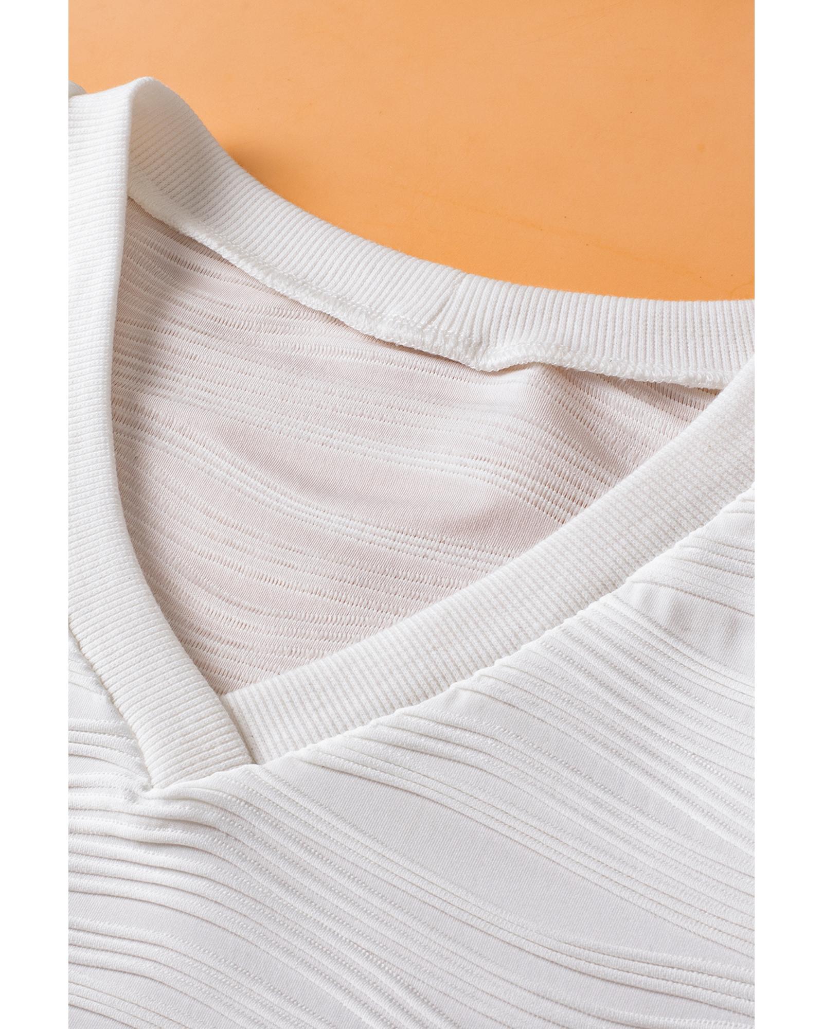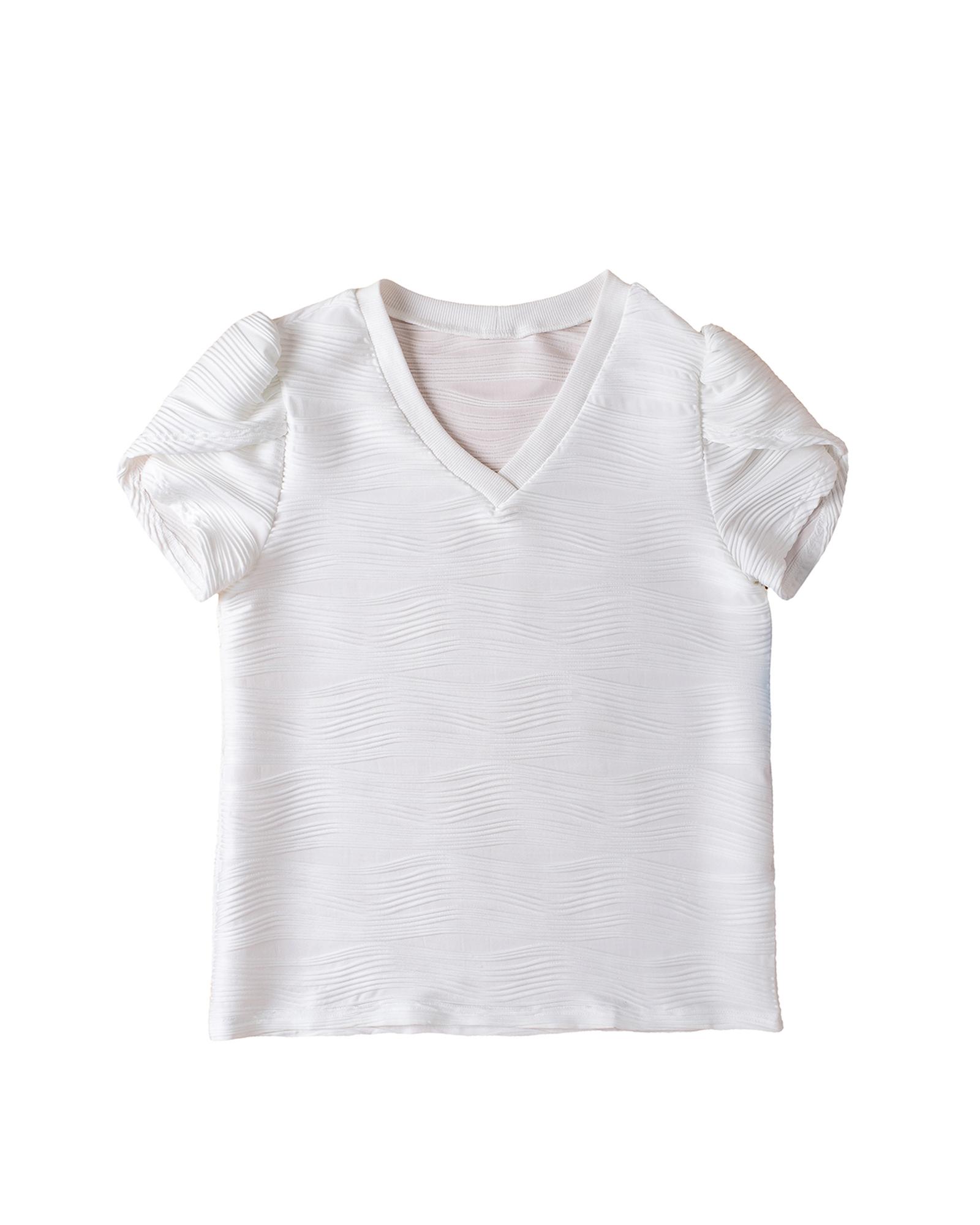 White Solid Color Textured V Neck Short Sleeve Top – S
