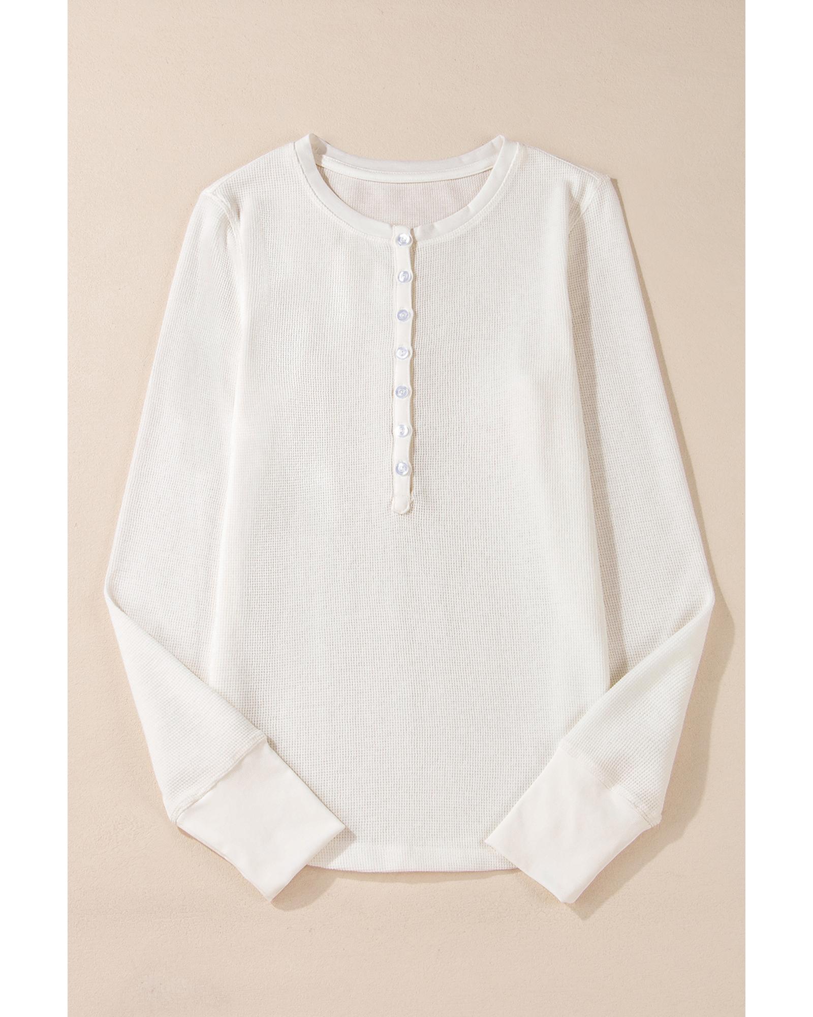 White Solid Color Waffle Half Button Long Sleeve Top – S