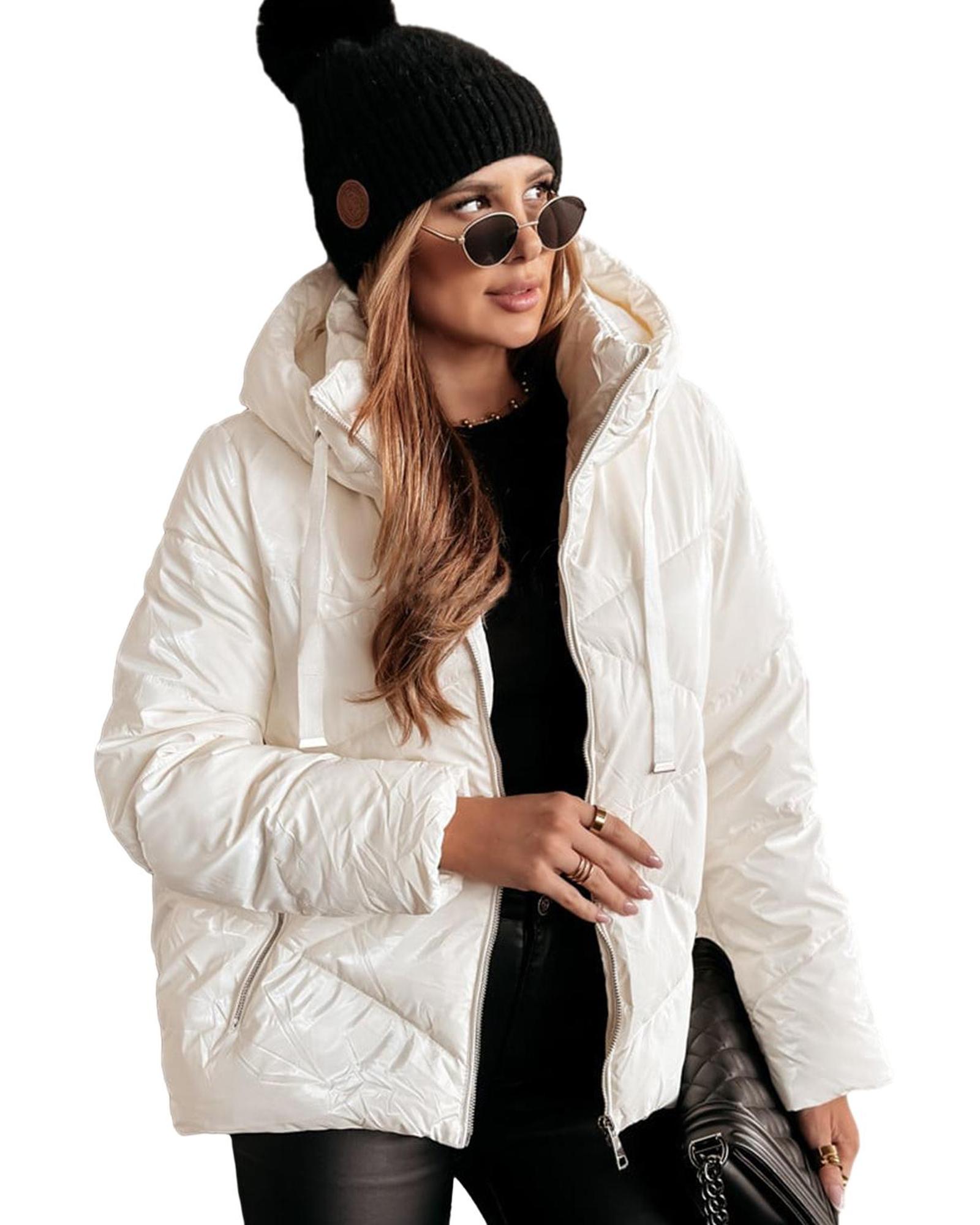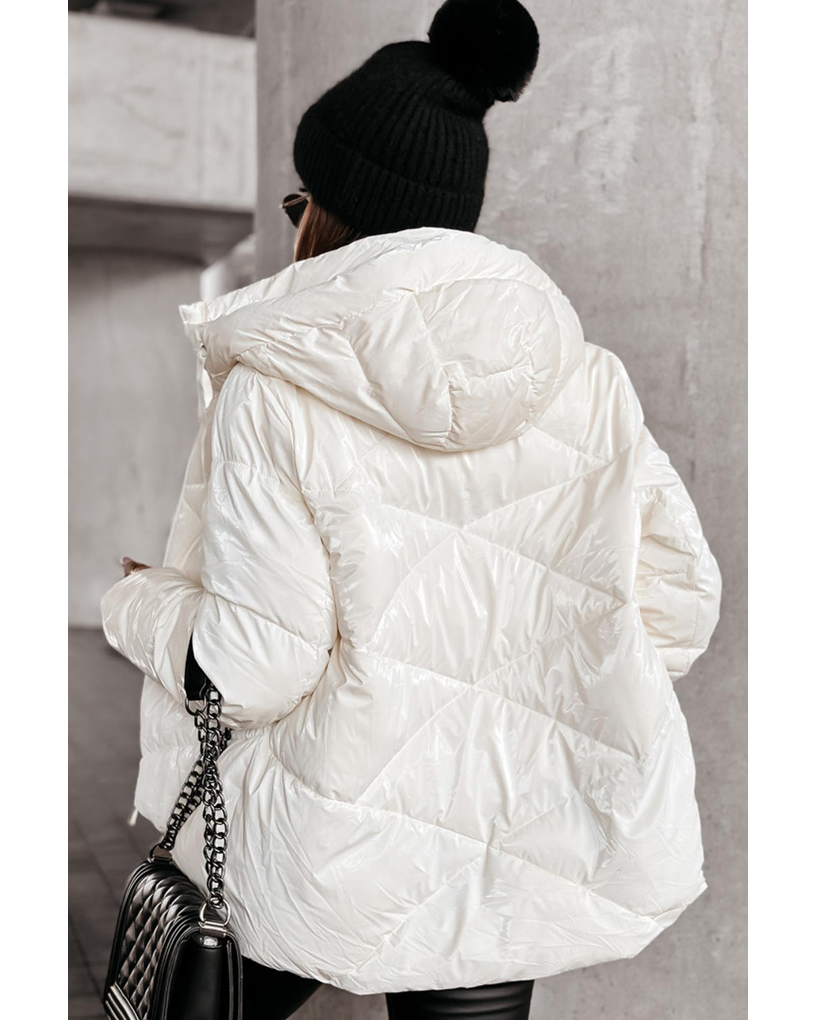White Solid Quilted Hooded Zip Up Puffer Coat – XL
