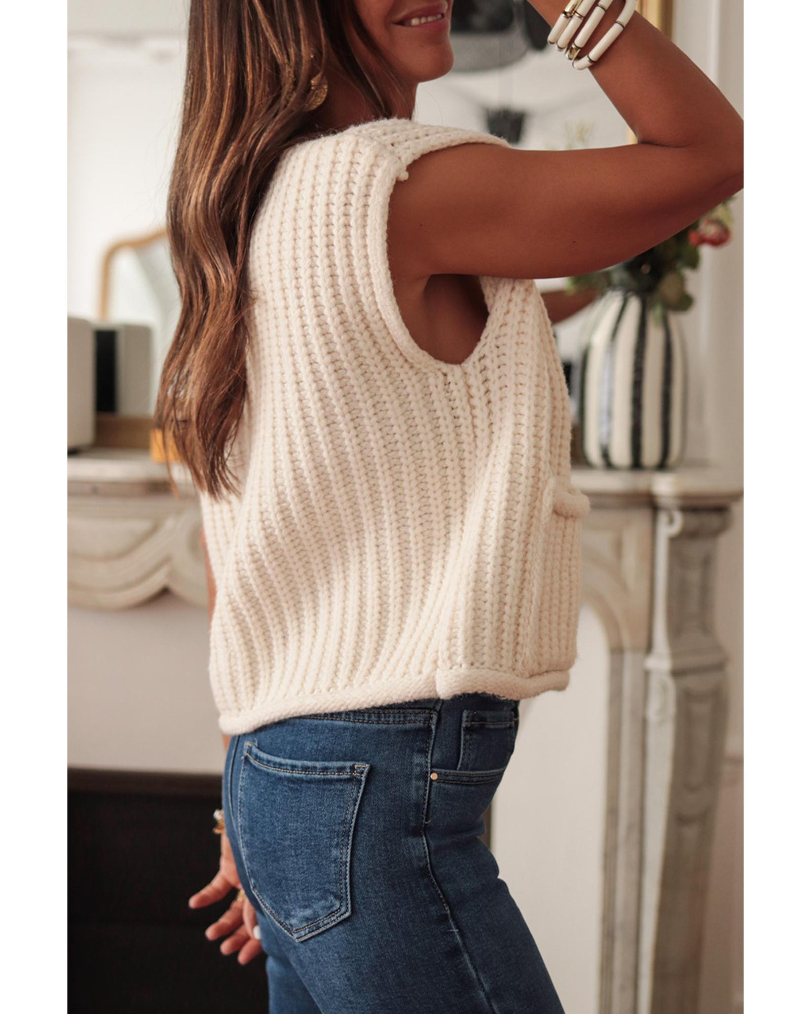 White Solid Textured Knit Side Pockets Buttoned Sweater Vest – S