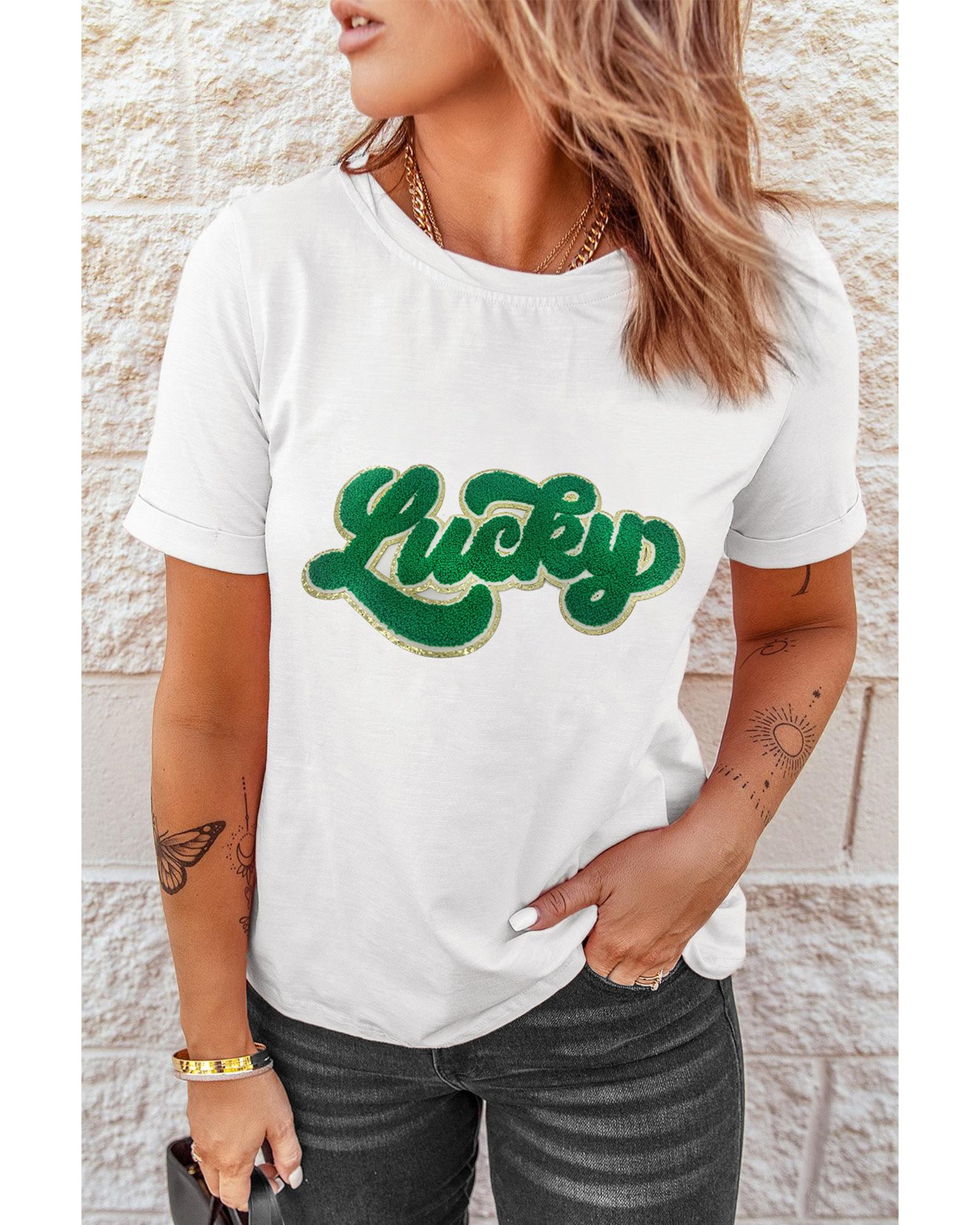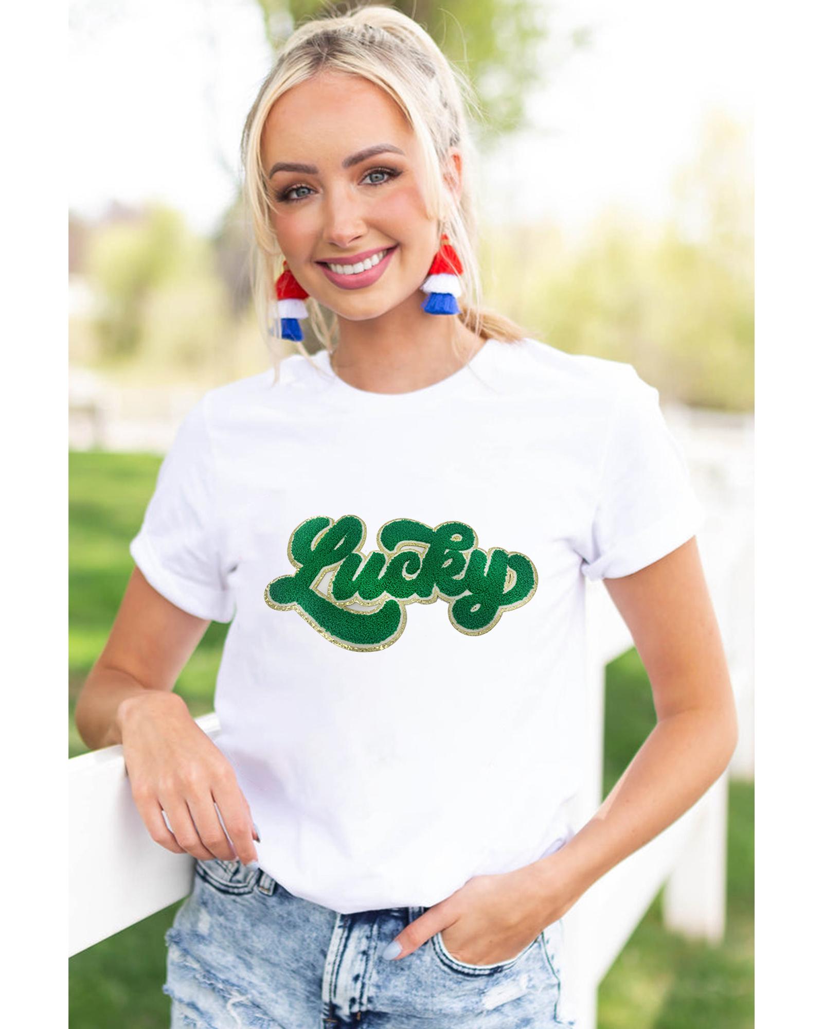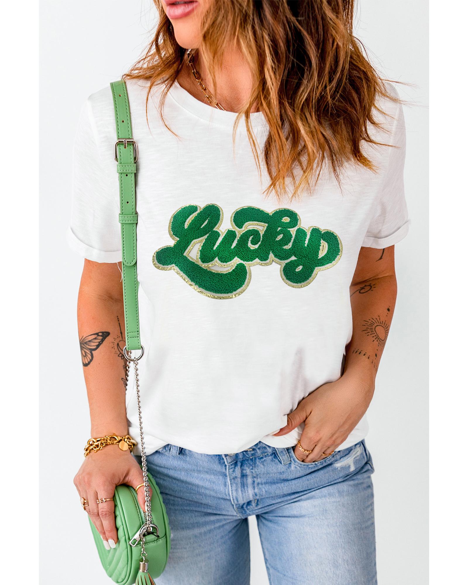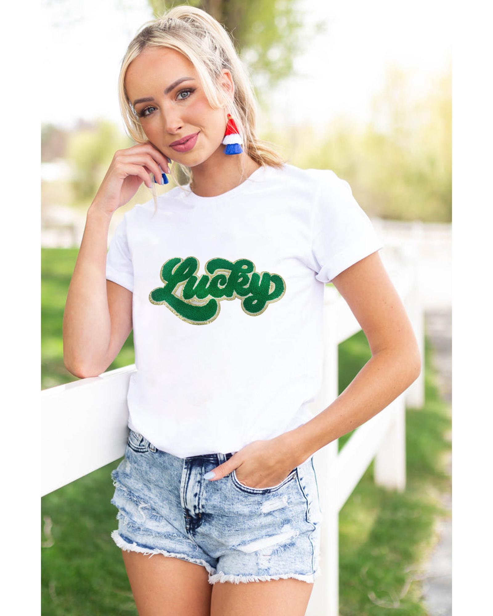 White St. Patrick Lucky Chenille Glitter Patched Graphic T Shirt – M