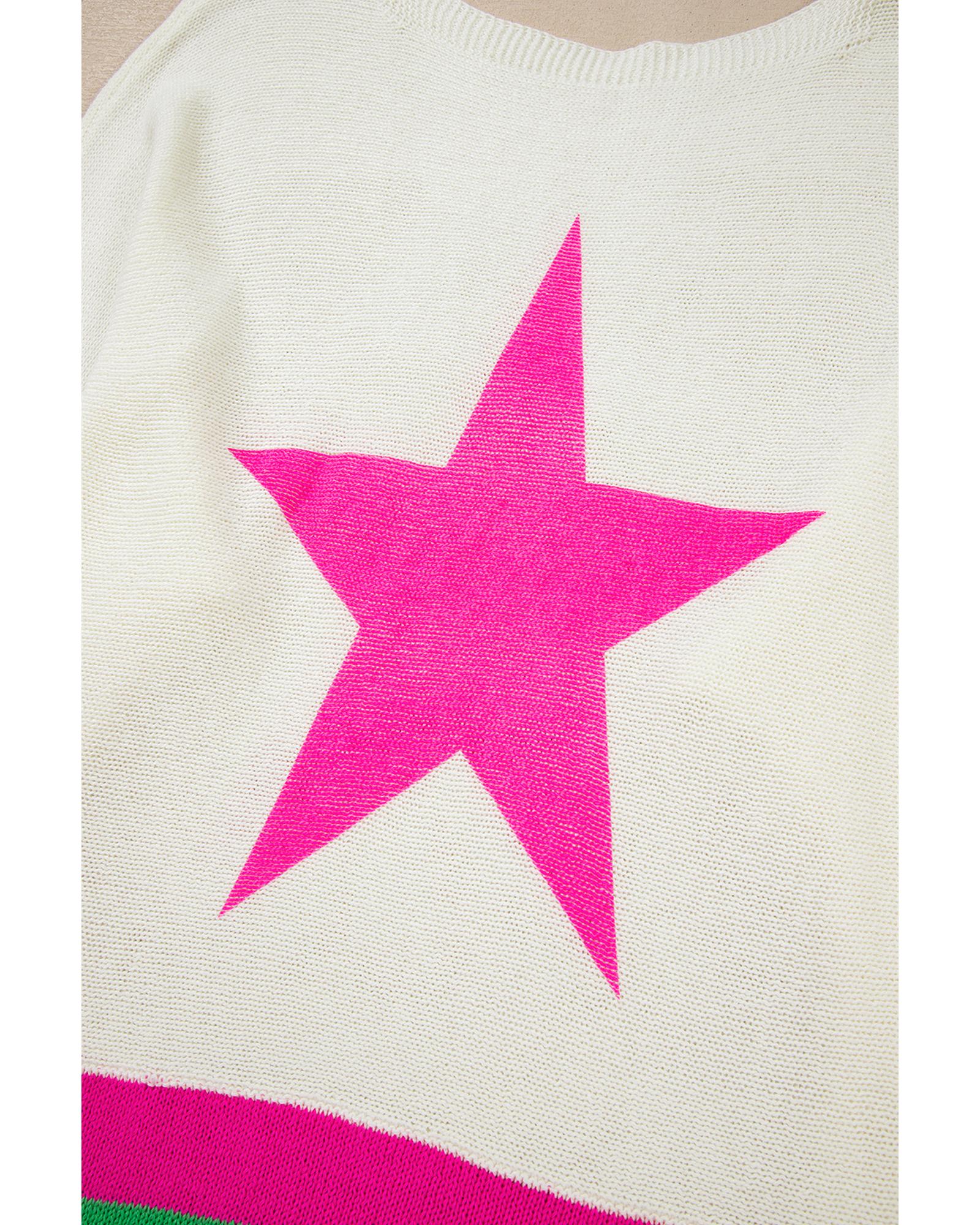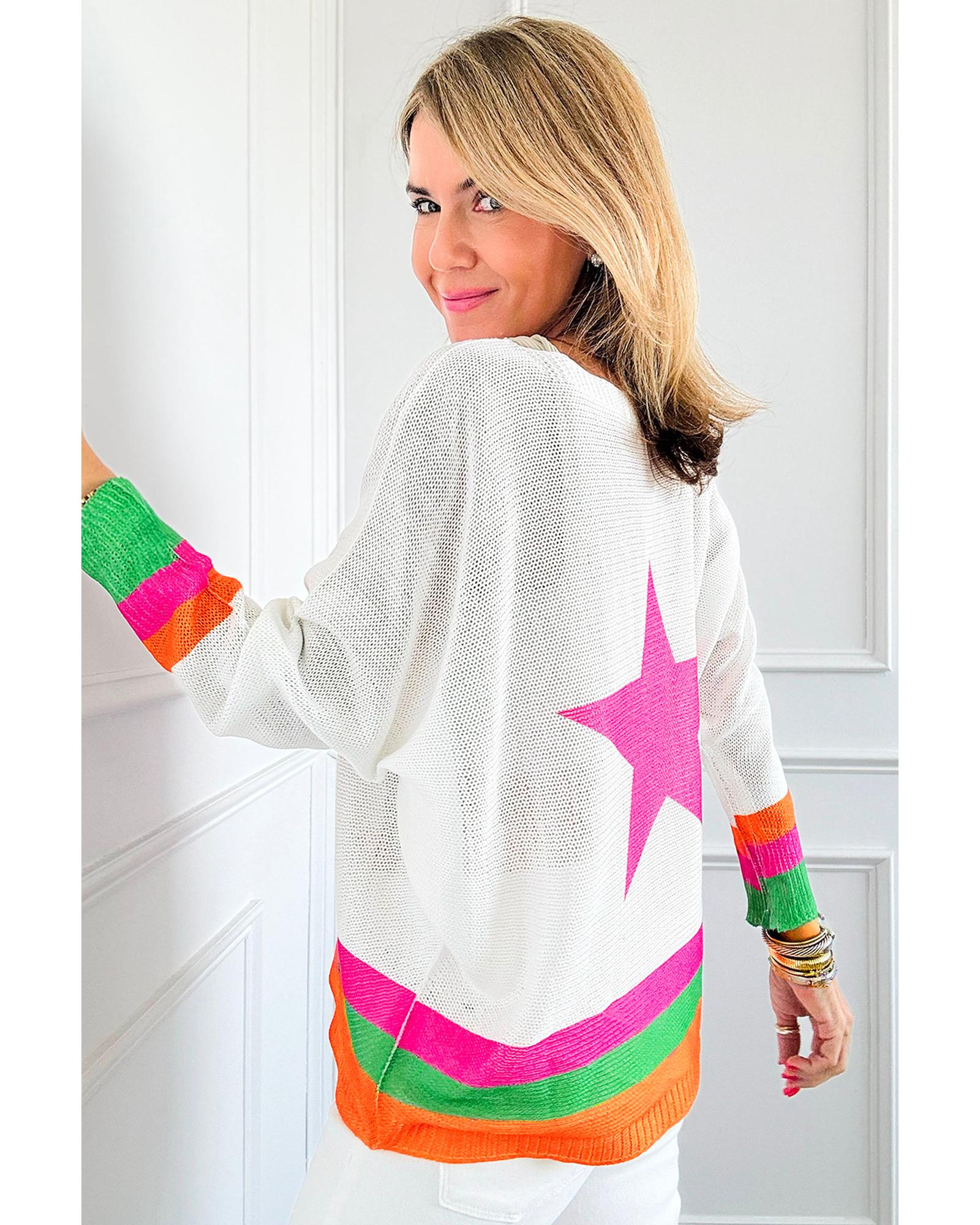 White Star Pattern Colorblock Striped Edge Drop Shoulder Sweater – L