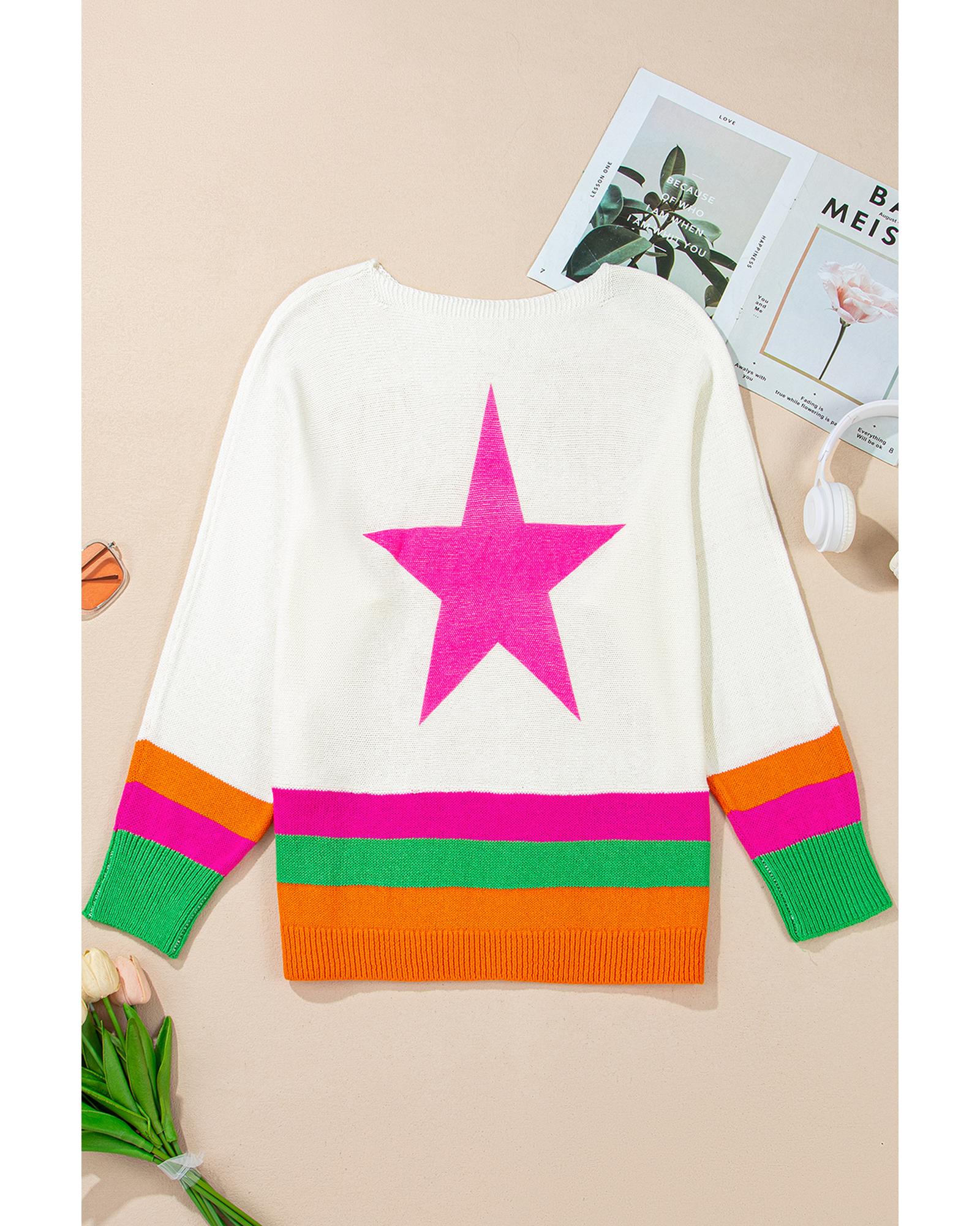 White Star Pattern Colorblock Striped Edge Drop Shoulder Sweater - S Original price was: $72.99.Current price is: $38.99.